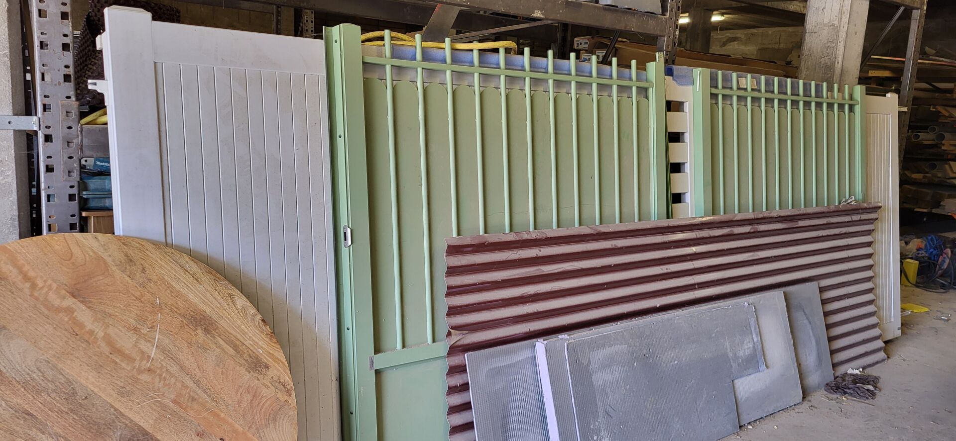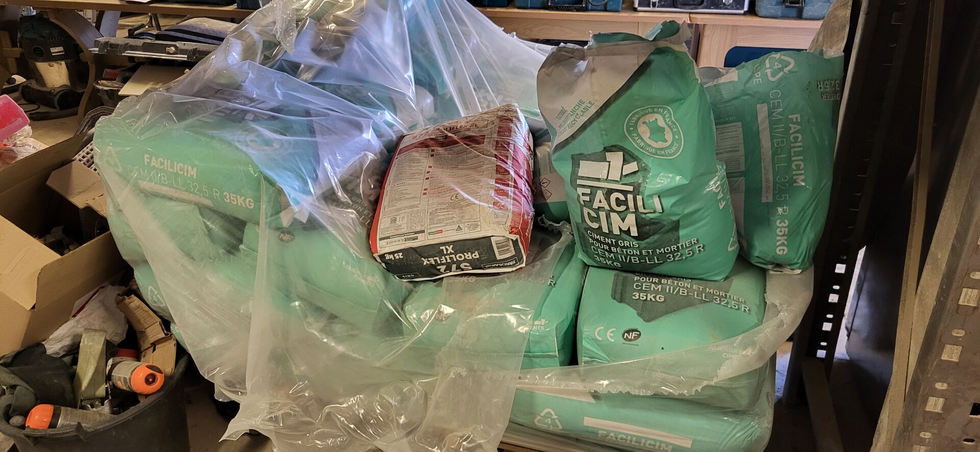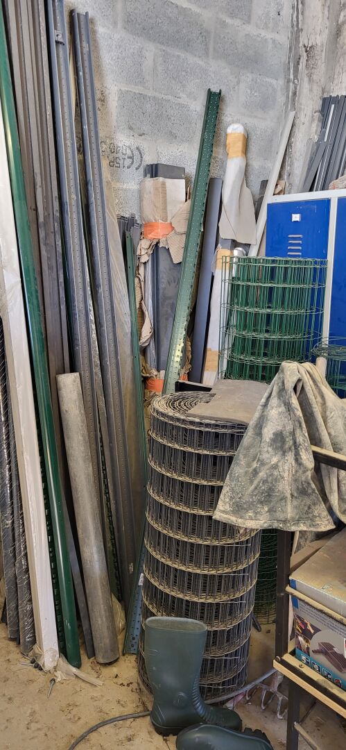 Répartis dans les locaux : 1 stock comprenant : panneaux de bois, lames en bois, portails PVC blancs ou alu verts, environ 13 cartons de lames intermédiaires gris anthracite GARDENODE, poteaux bois, environ 15 sacs de ciment gris de 35 kg FACILI CIM