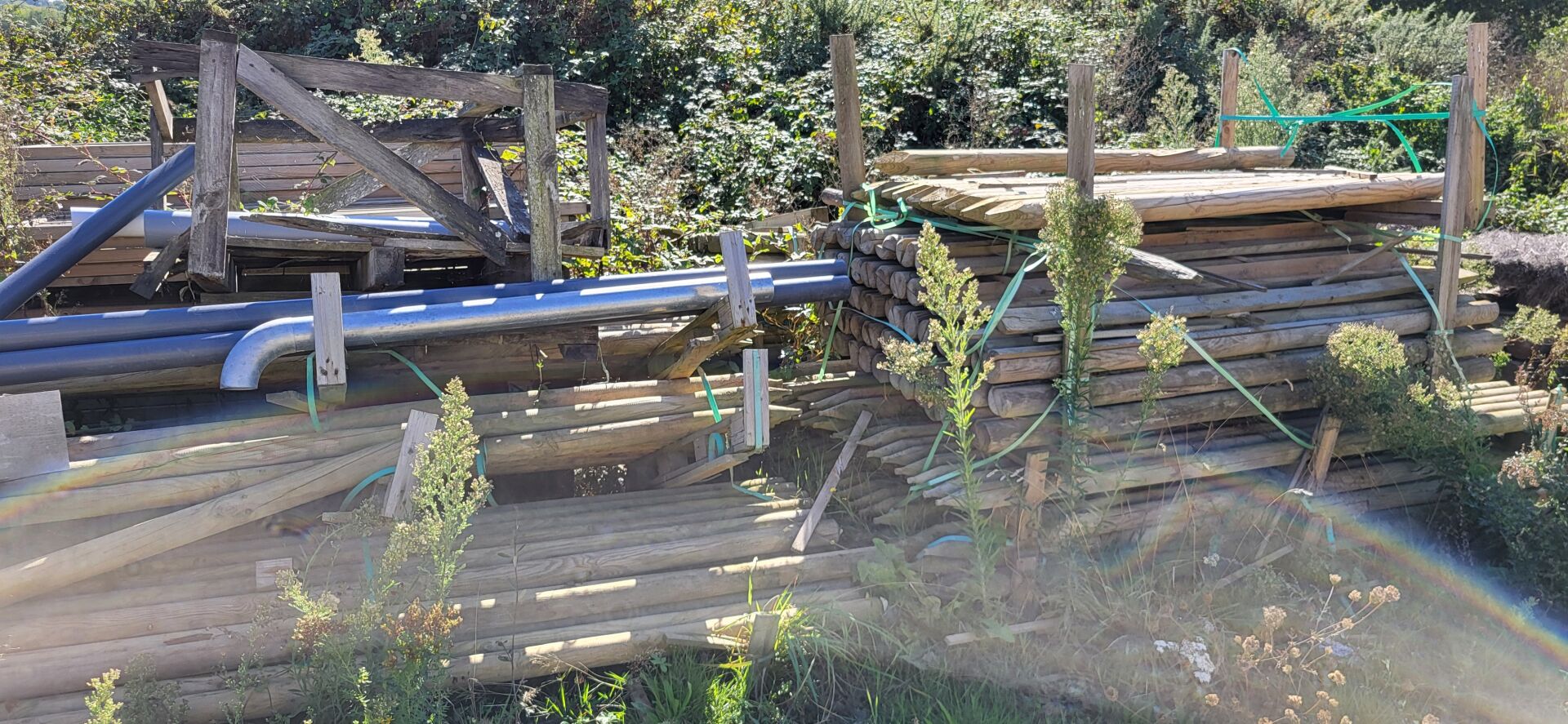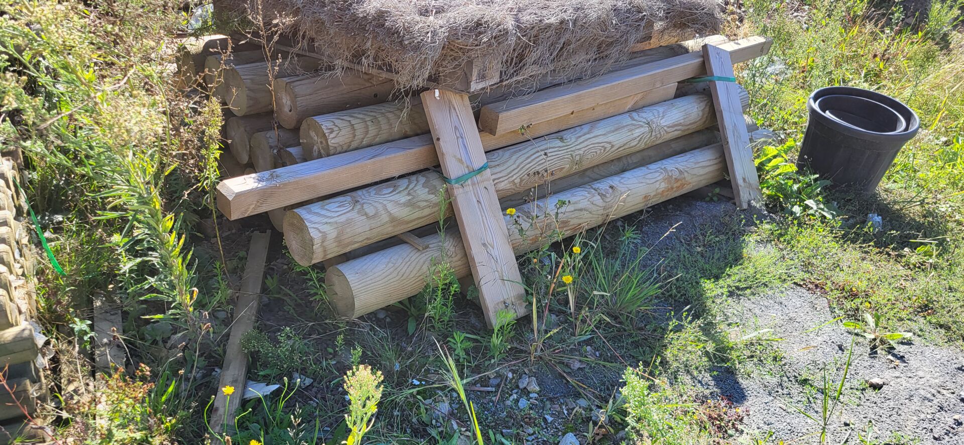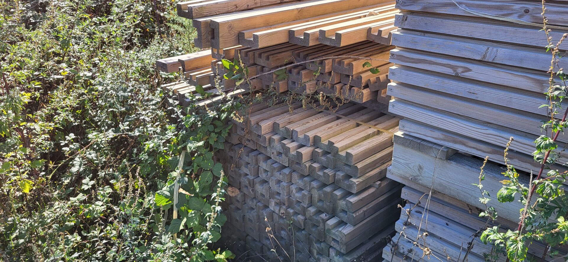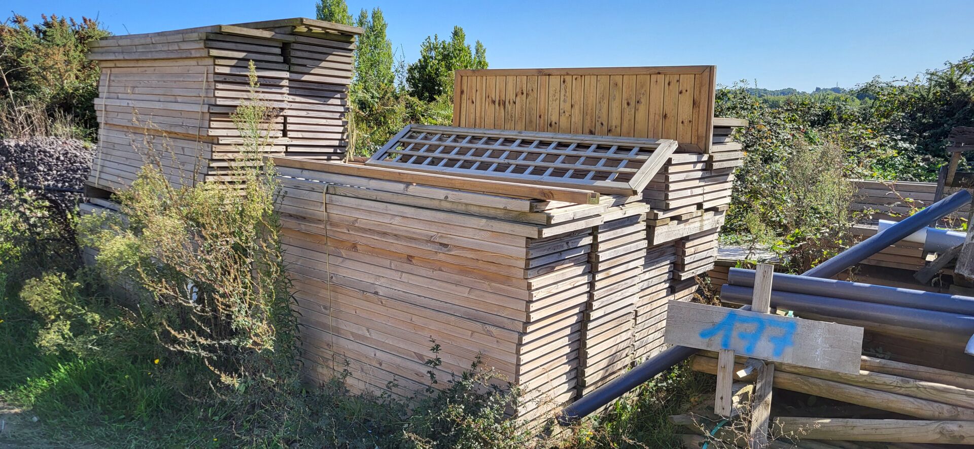 Environ 50 panneaux de clôture en bois 184 x 45cm, environ 150 panneaux de clôture en bois ajouré 184 x 45cm avec environ 180 poteaux bois en 205cm, environ 200 piquets bois de 250cm de long x 7cm de diamètre, environ 20 poteaux rond en bois de 200cm de long x 13,5cm de diamètre