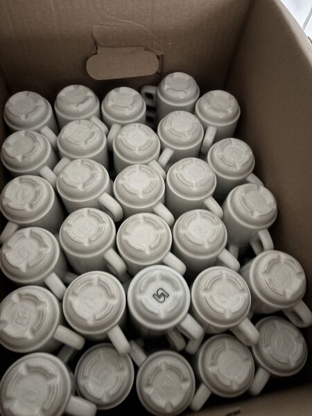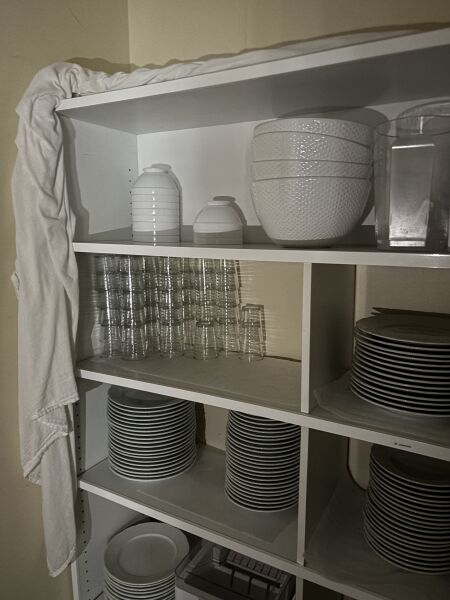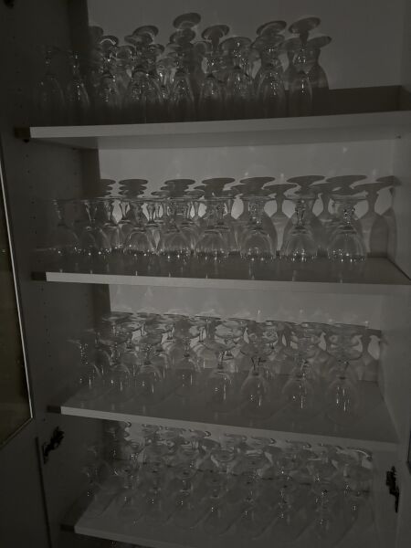 Ensemble de vaisselle composé de : - Environ 240 assiettes en faïence blanches - Environ 80 verres à eau - Environ 100 flûtes à champagne - Environ 150 verres à pied - Environ 100 couverts en inox - 4 plats ronds en faïence blanche - 4 saladiers en faïence blanche - Environ 60 bols en faïence blanche - Environ 80 tasses à café en faïence blanche - 3 faitouts en inox - Corbeille en osier