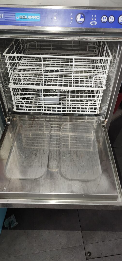 1 lave-verre inox EQUIPRO BD46 DGT avec 2 paniers 39 x 39 cm à démonter proprement en respectant l'étanchéité, prévoir pose bouchons plombier