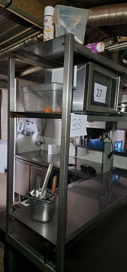 1 étagère inox 3 niveaux, 200x46cm à clayettes 1 étagère alu 5 niveaux à clayette PVC gris, 145x54cm
