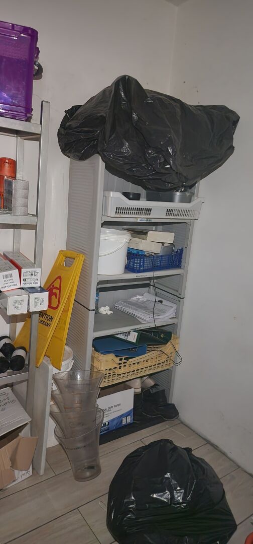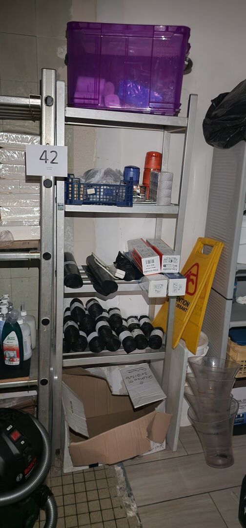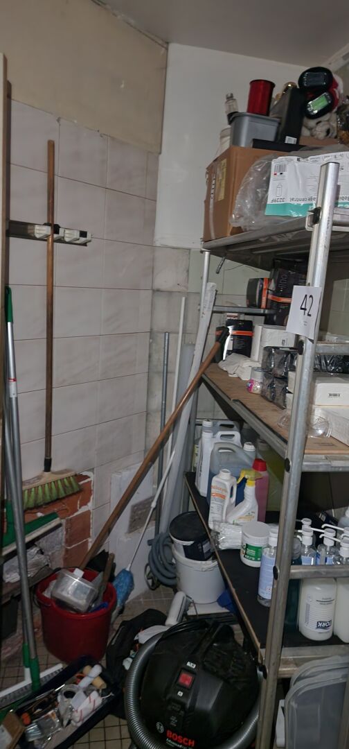 1 étagère alu 3 niveaux, 134x49cm 1 étagère alu 4 niveaux, 60x32cm 1 étagère PVC gris 5 niveaux 1 lot d'ustensiles de ménage 1 aspirateur à bidon BOSCH Advanced Vac 20 Stock de consommables