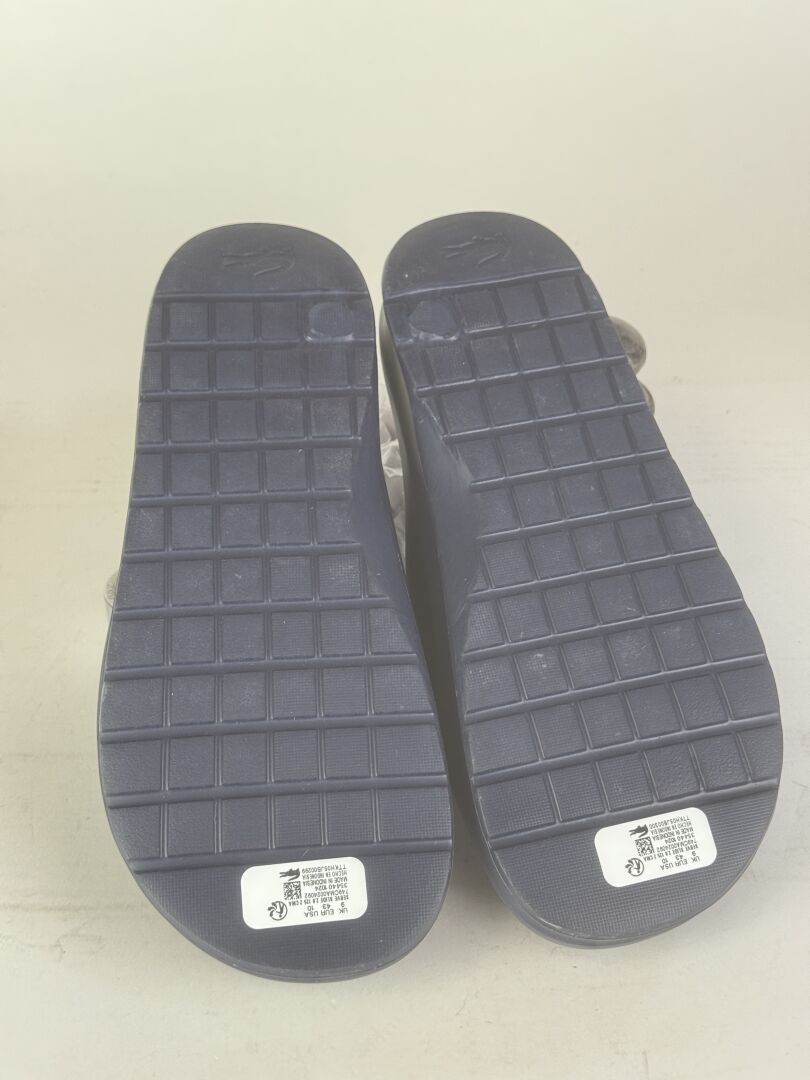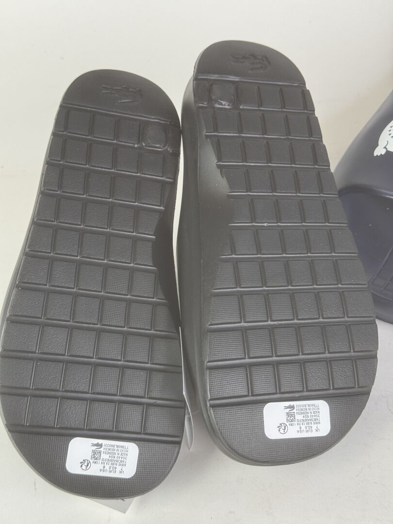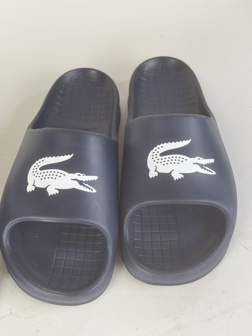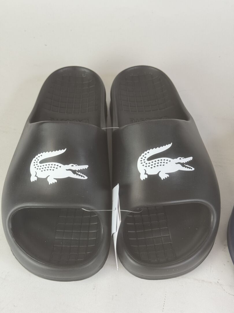 Ensemble de huit paires de claquettes, plastique noir ou marine, dont LACOSTE. Diverses pointures