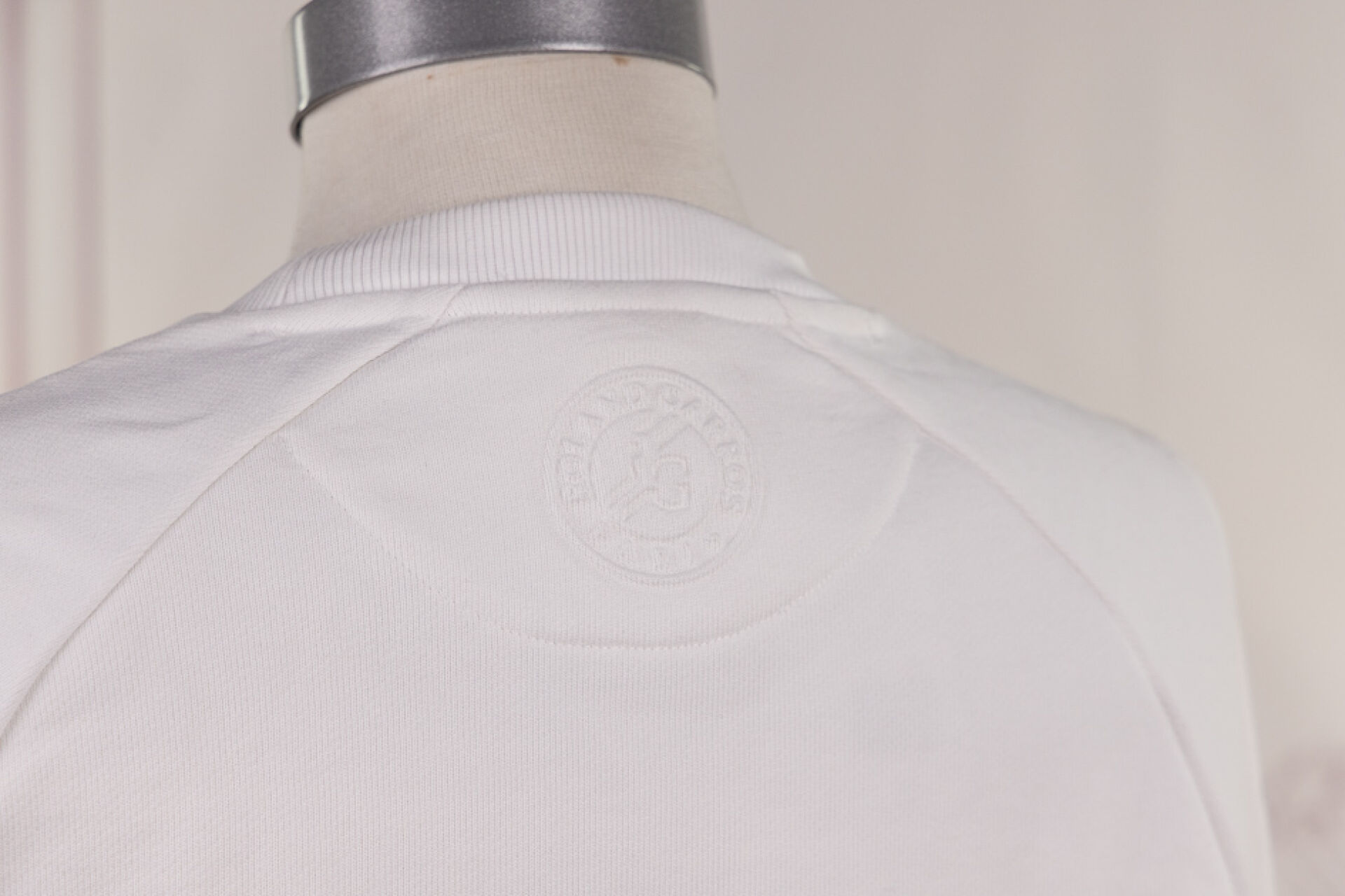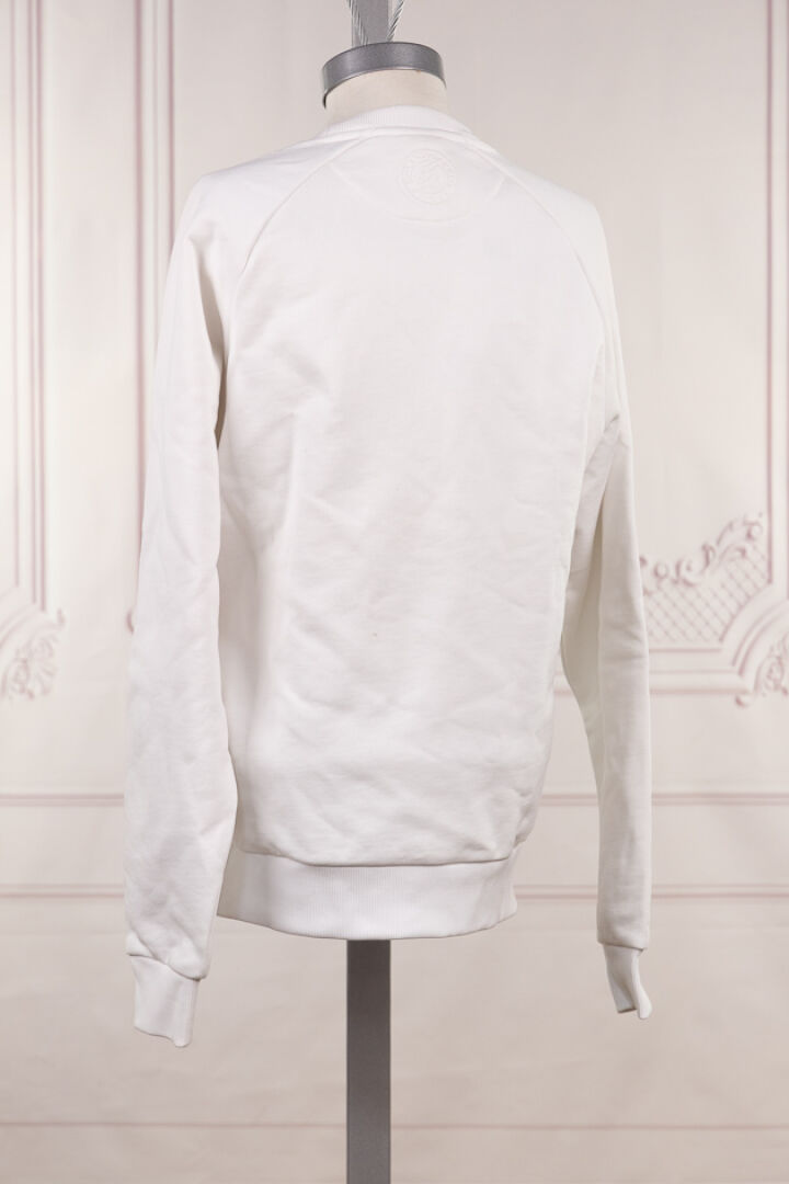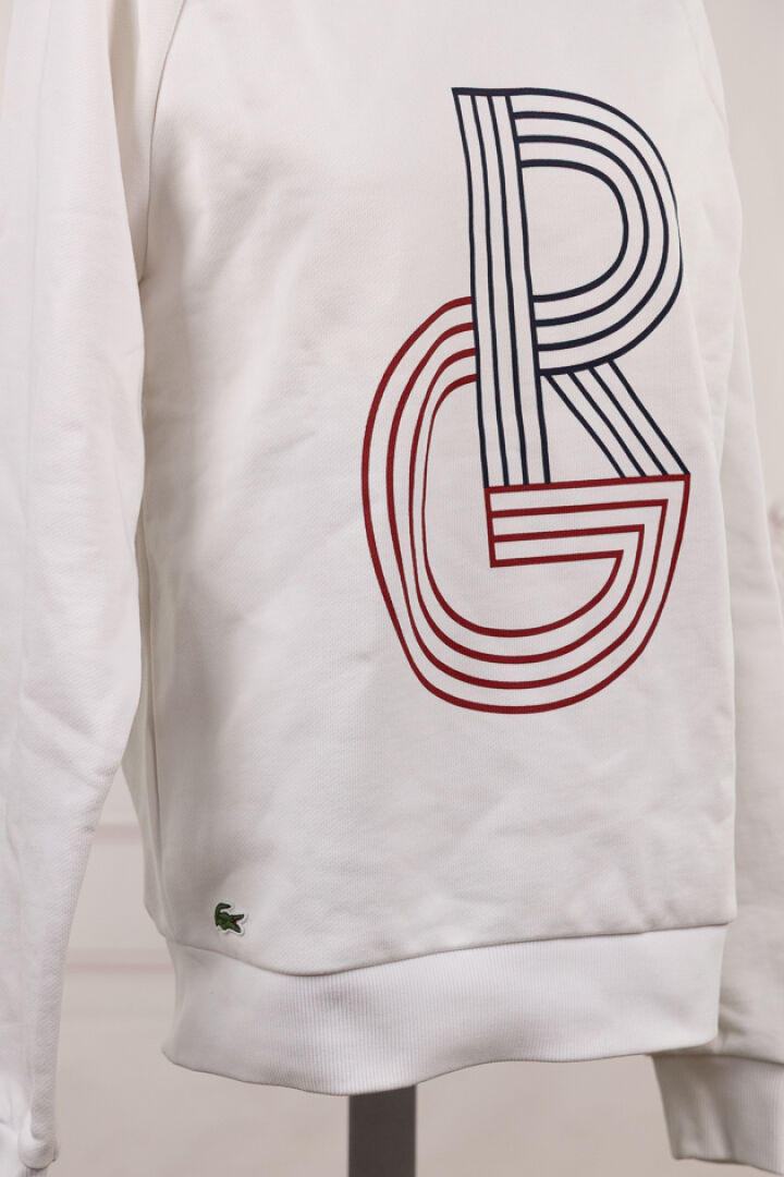 LACOSTE ROLAND GARROS. Sweat coton blanc aux lettres RG marine.rouge, encolure effet V, manches longues raglan. Non porté. Taille indiquée 3.