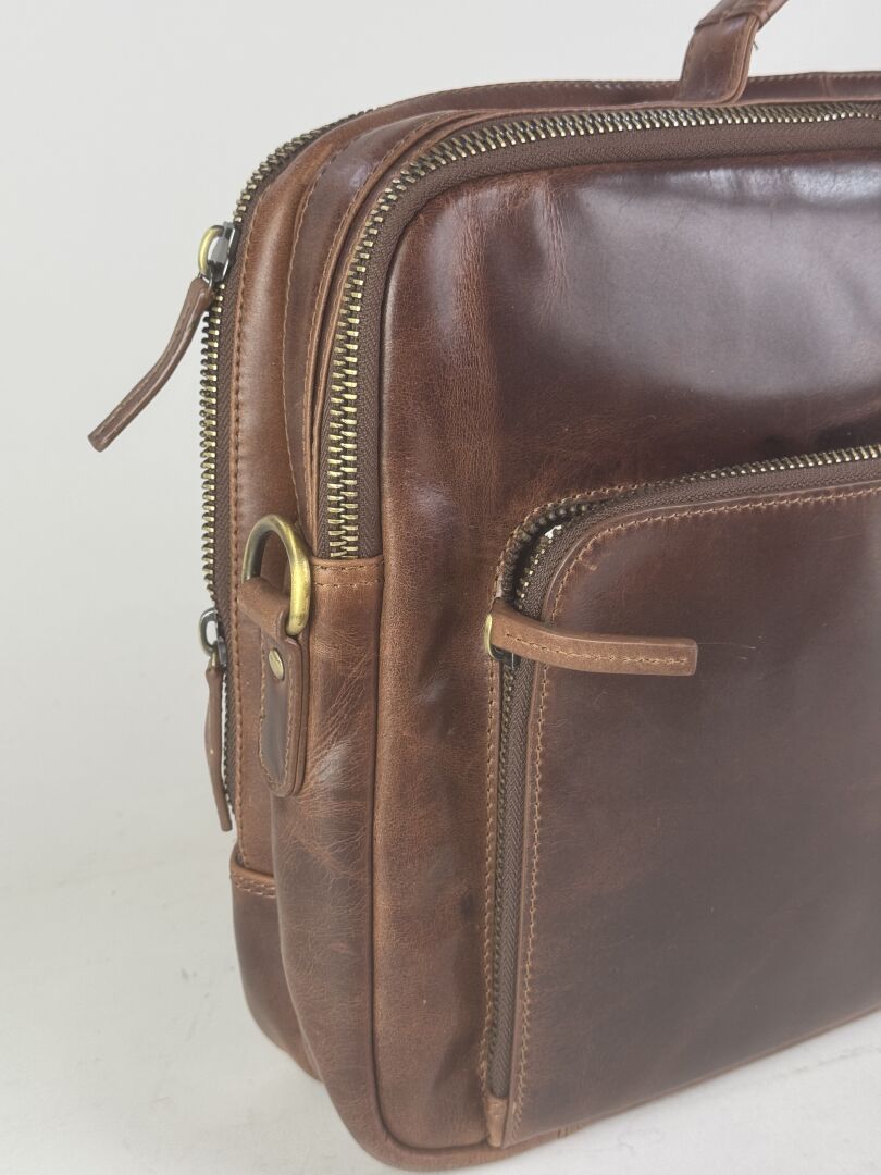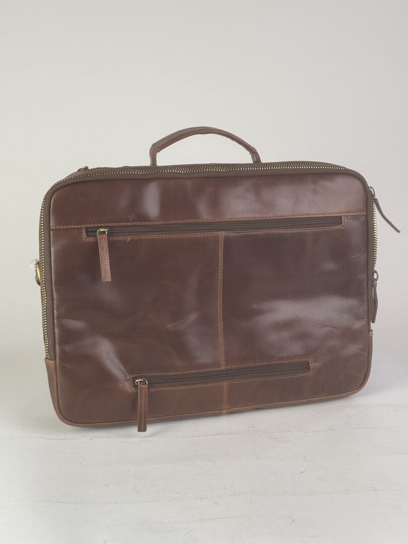 SID & VAIN - Sacoche pour ordinateur portable, modèle "Simon", cuir marron, différentes poches. Haut. : 30 cm - Long. : 42 cm (Etat magasin)