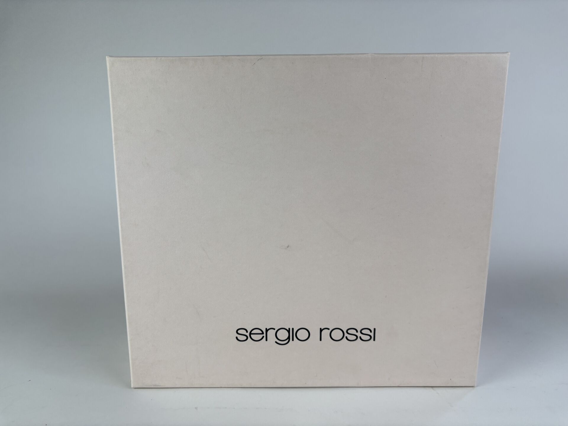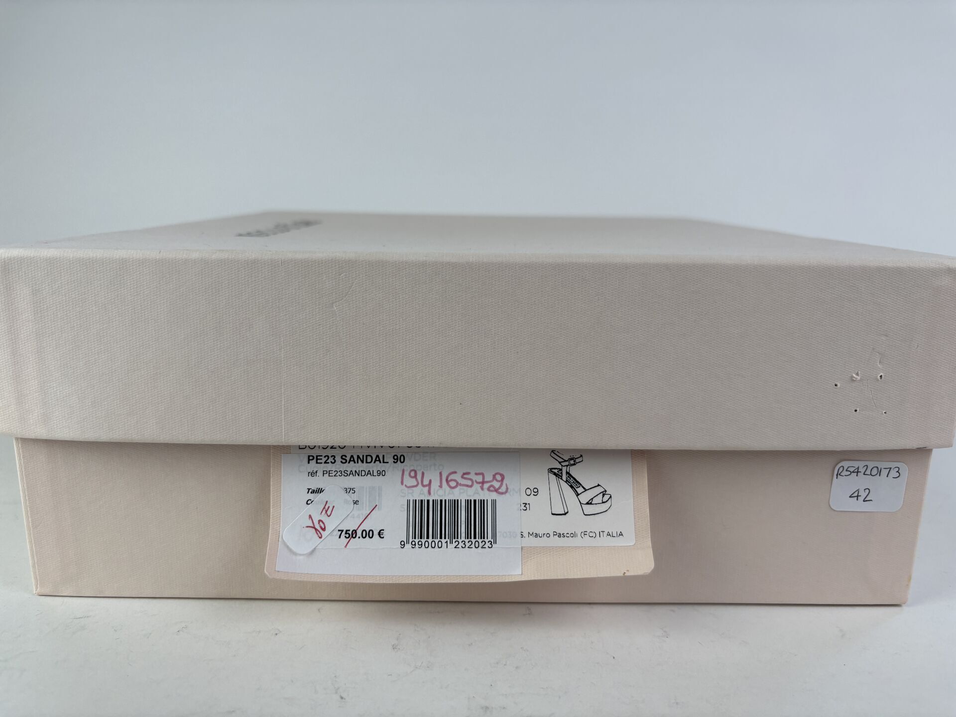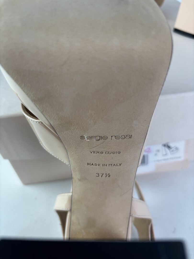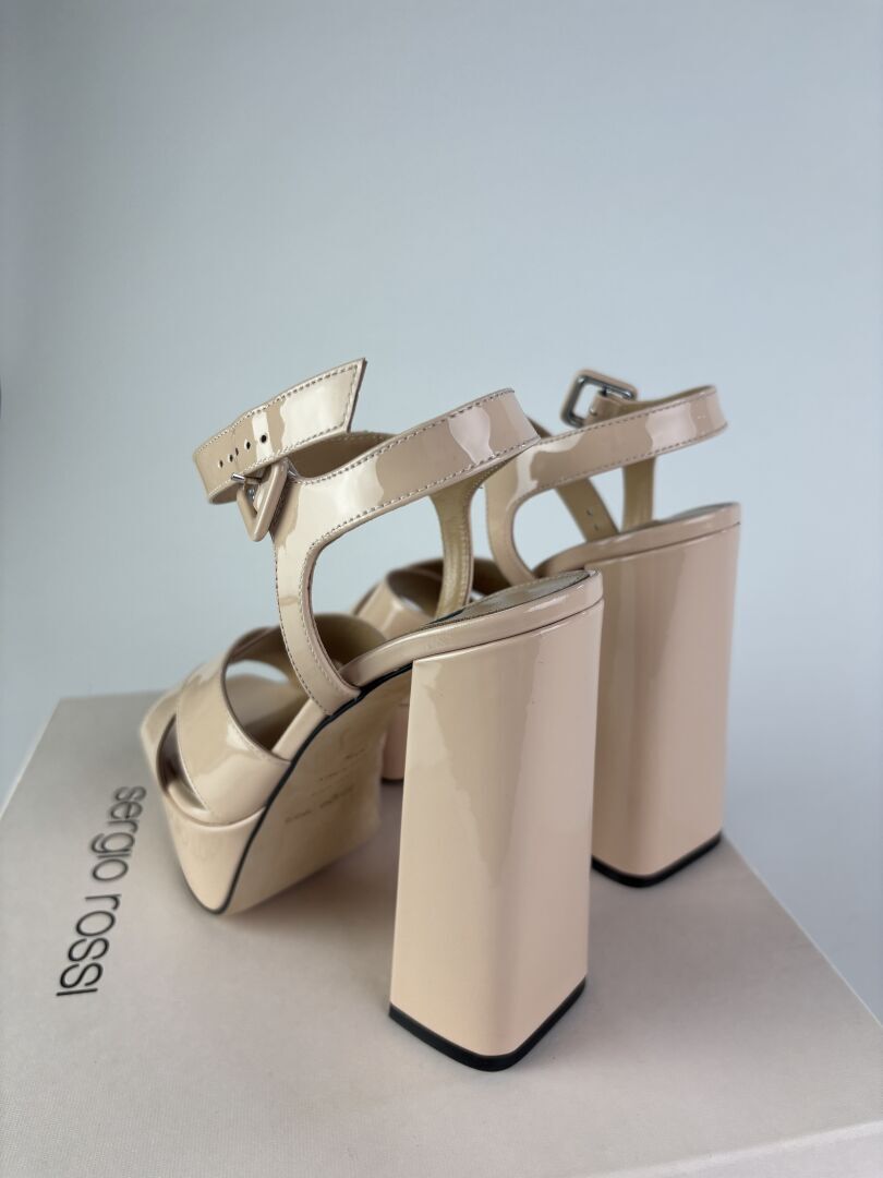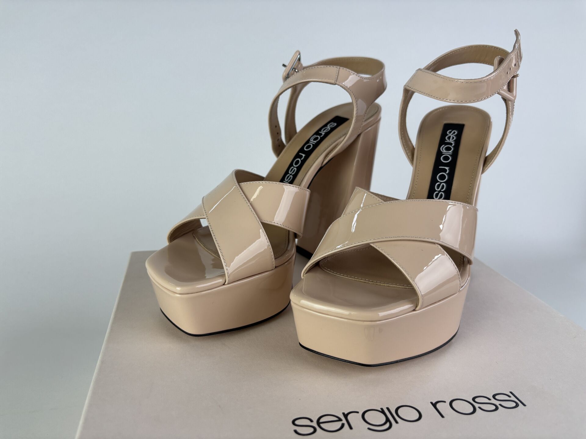 SERGIO ROSSI - Paire de sandales à talons, plateforme, cuir verni beige. Pointure 37,5 - Haut. du talon : 12,5 cm (très bon état)