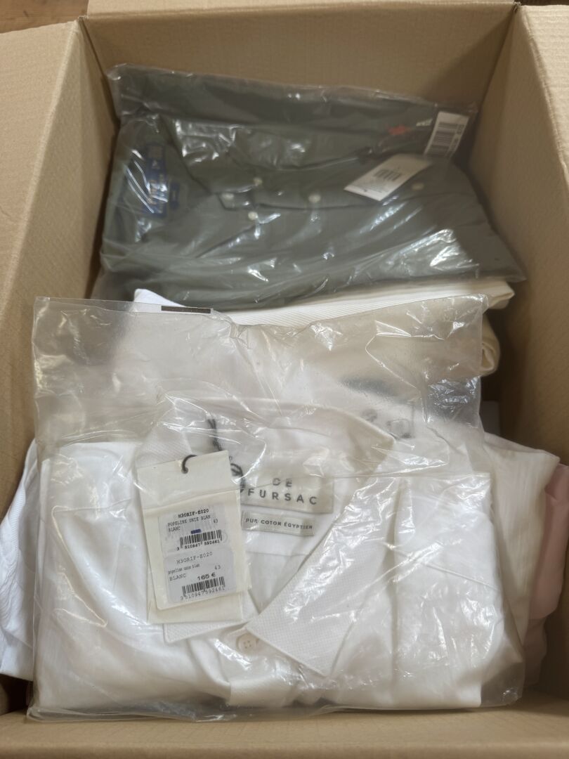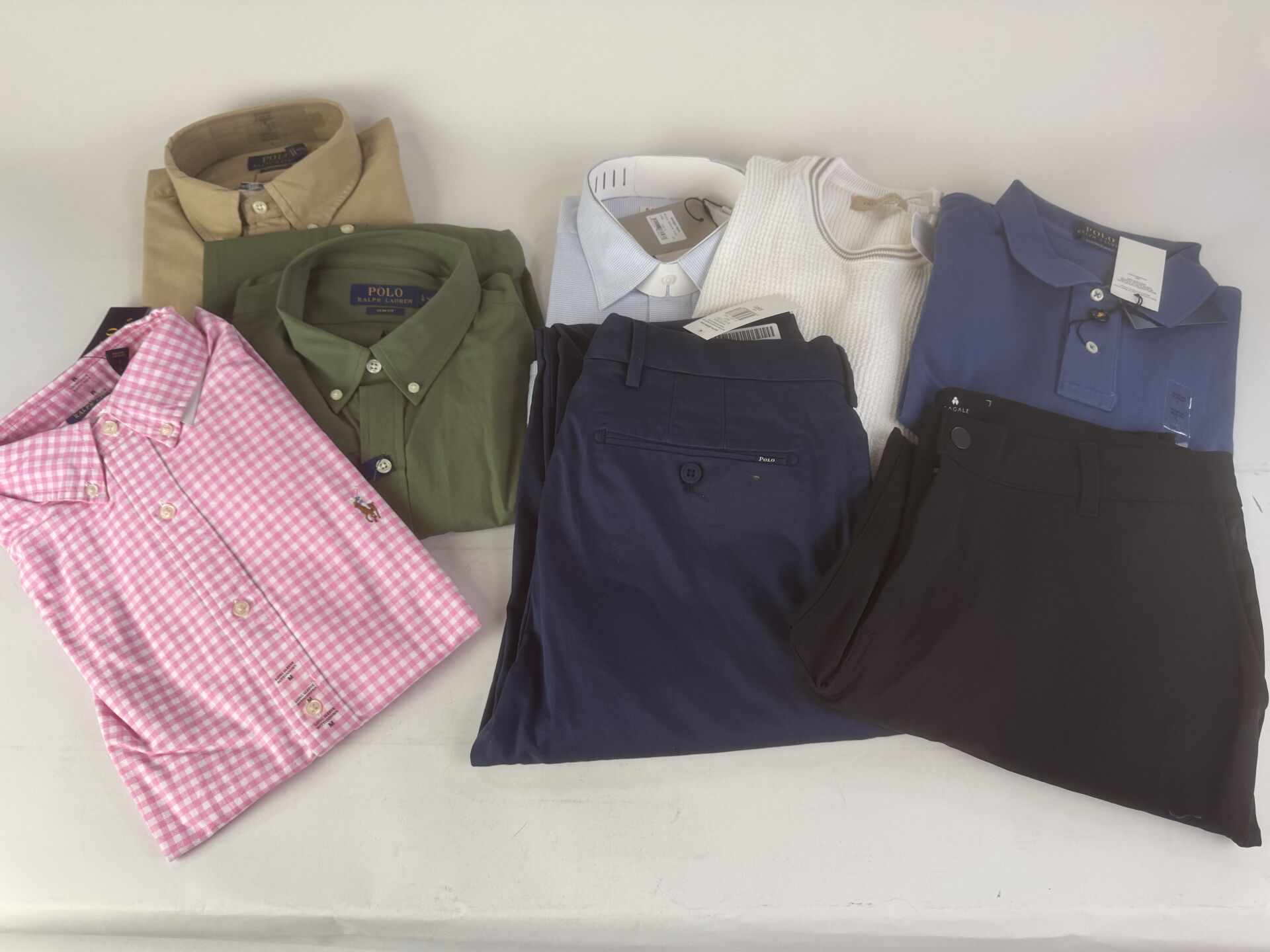 Ensemble d'environ 20 articles pour homme dont chemises, polo, pantalon,… Diverses marques dont POLO RALPH LAUREN, DE FURSAC, BONNE GUEULE, SEAGALE, FALCONERI,… Diverses tailles (Etat magasin pour la majorité)