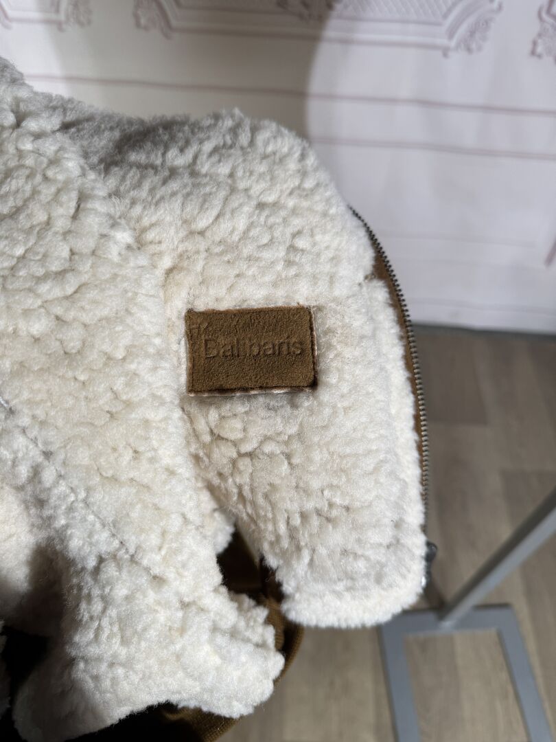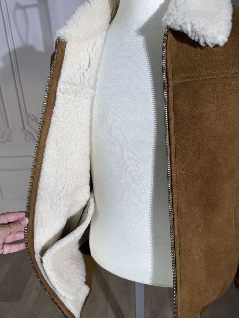 BALIBARIS - Blouson homme en cuir de mouton camel, doublure en lainage blanc, fermeture zip, deux poches en biais. Taille S (Etat magasin)