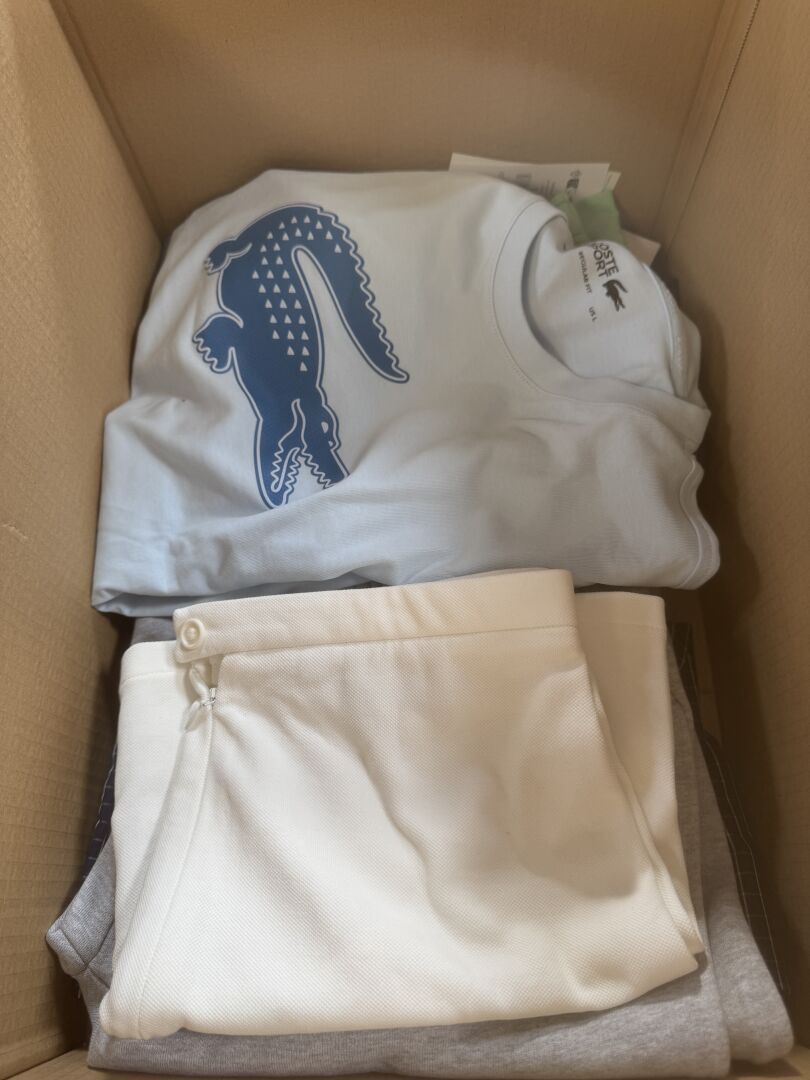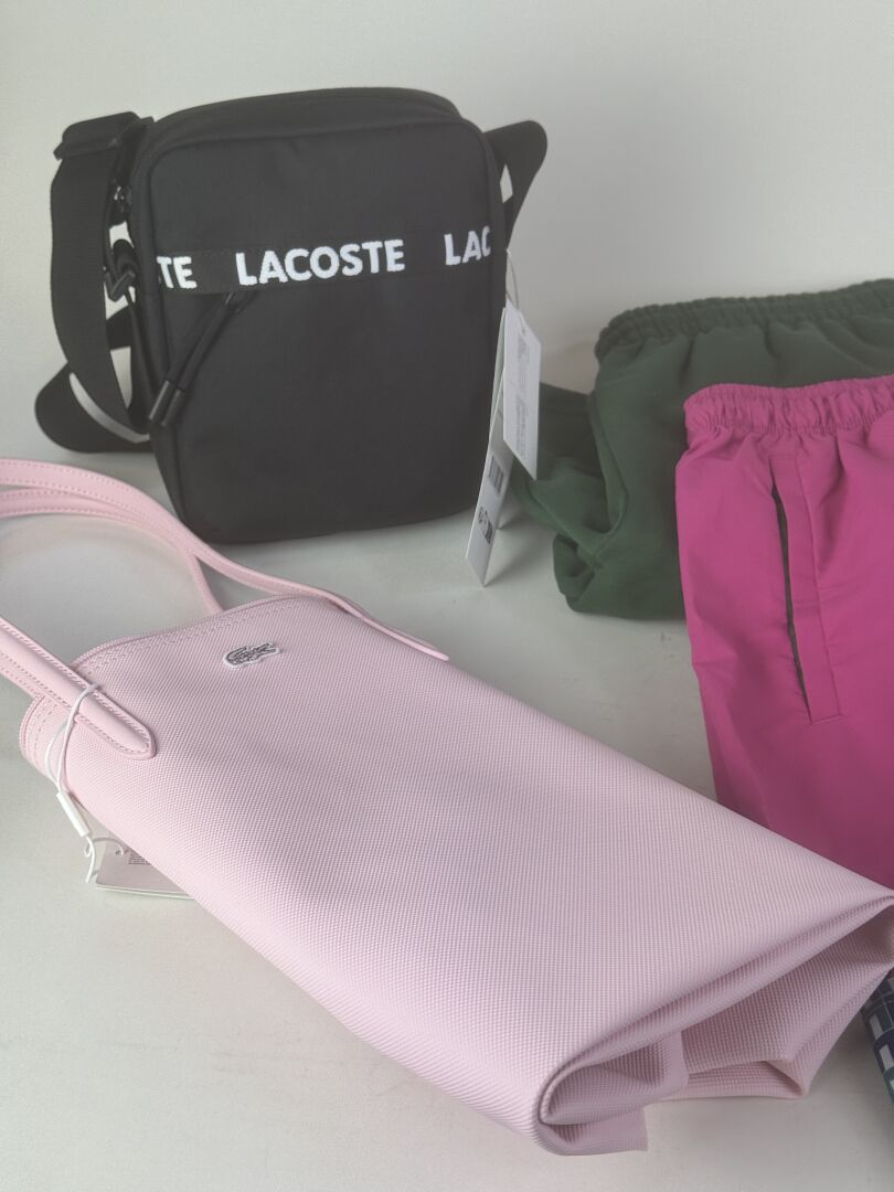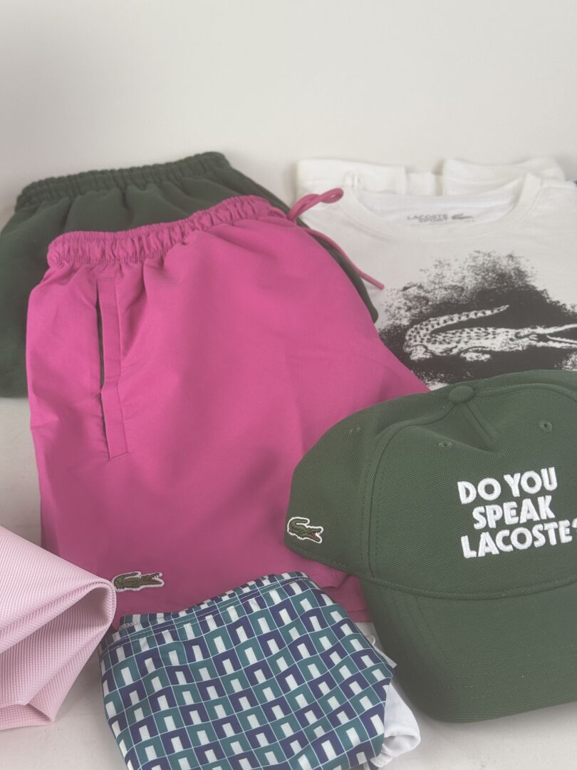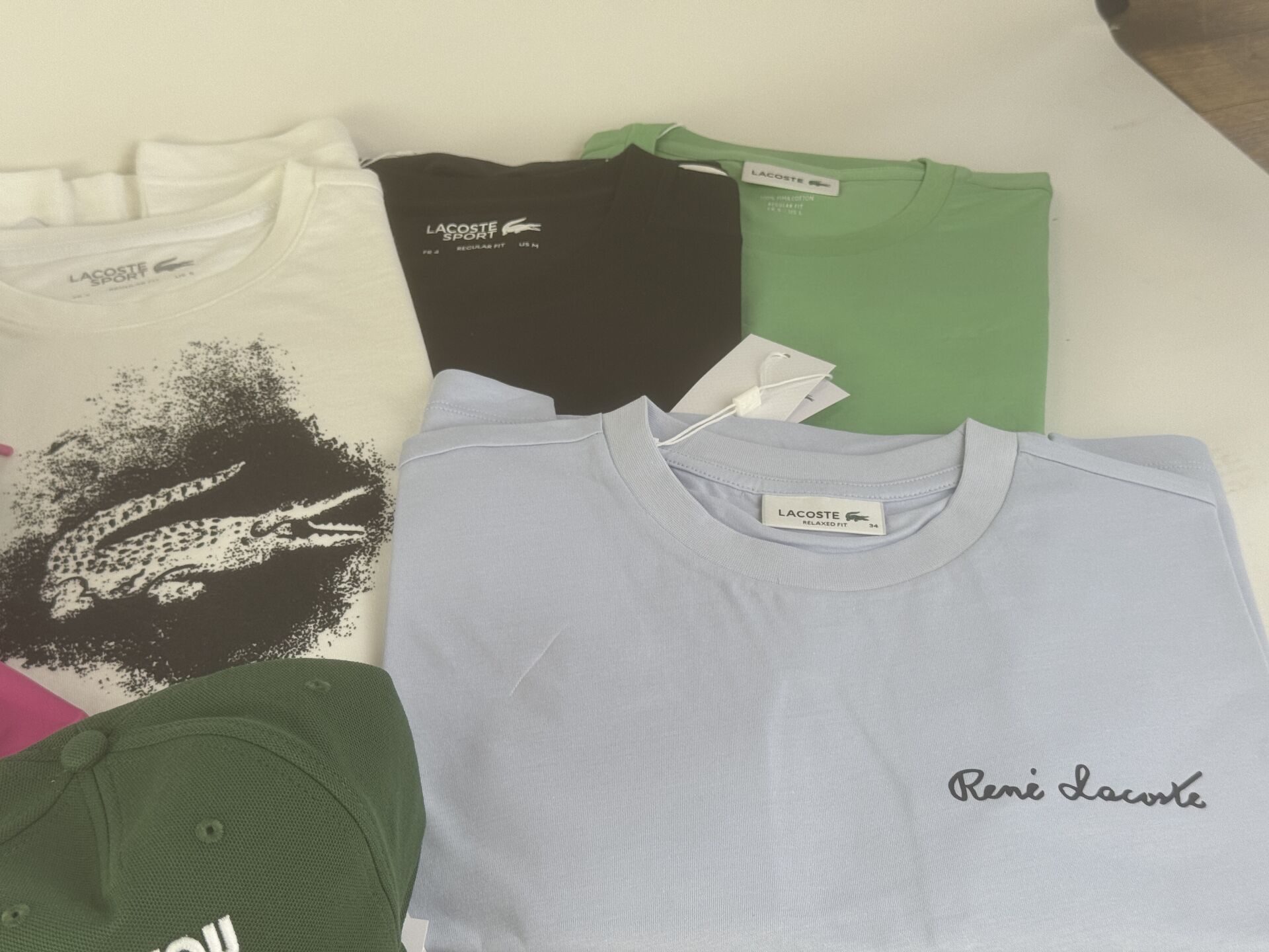 Ensemble d'environ 15 articles dont LACOSTE, comprenant t-shirt, sac, pochette, casquette, maillot de bain,… Diverses tailles (Très bon état)