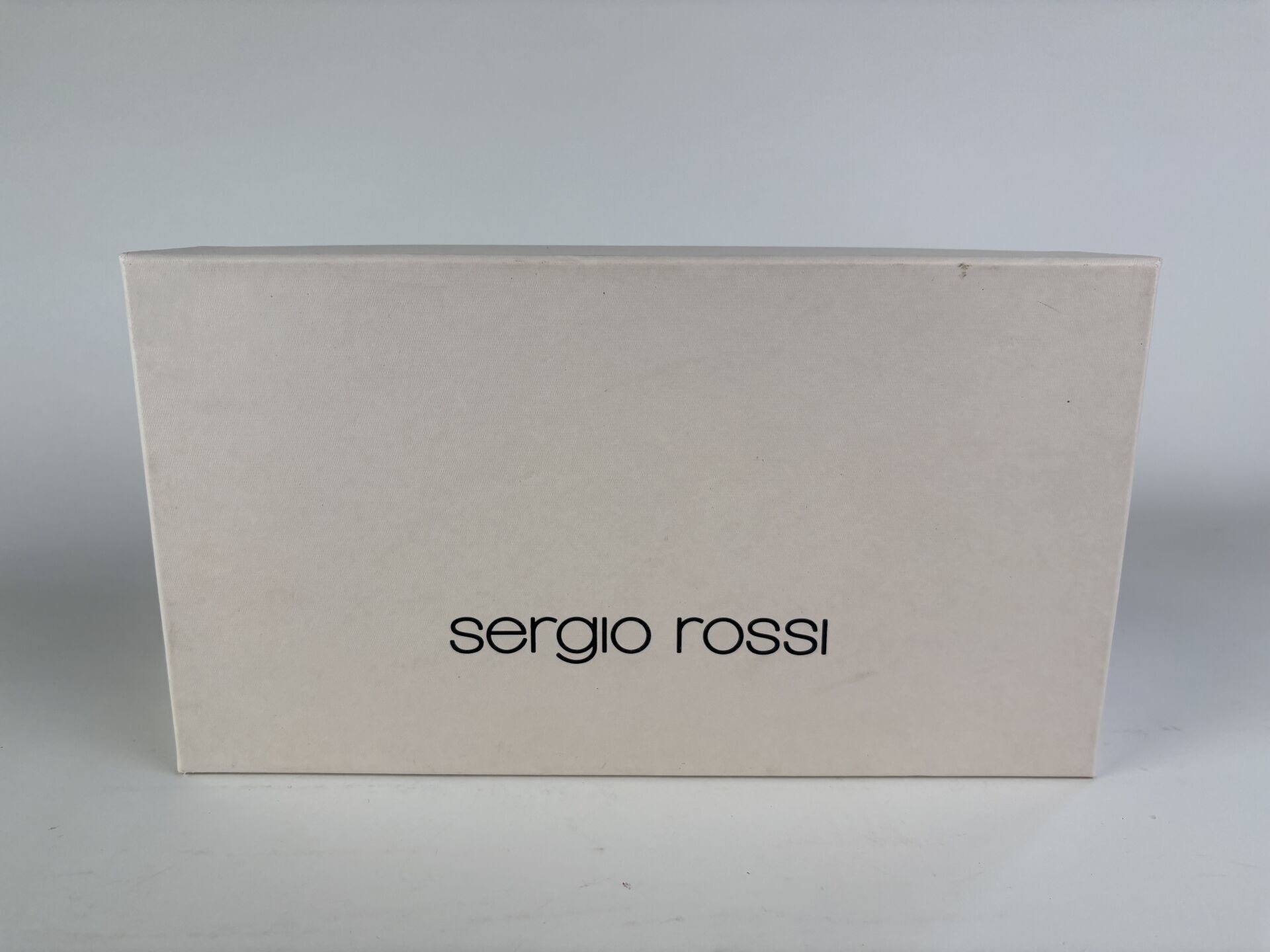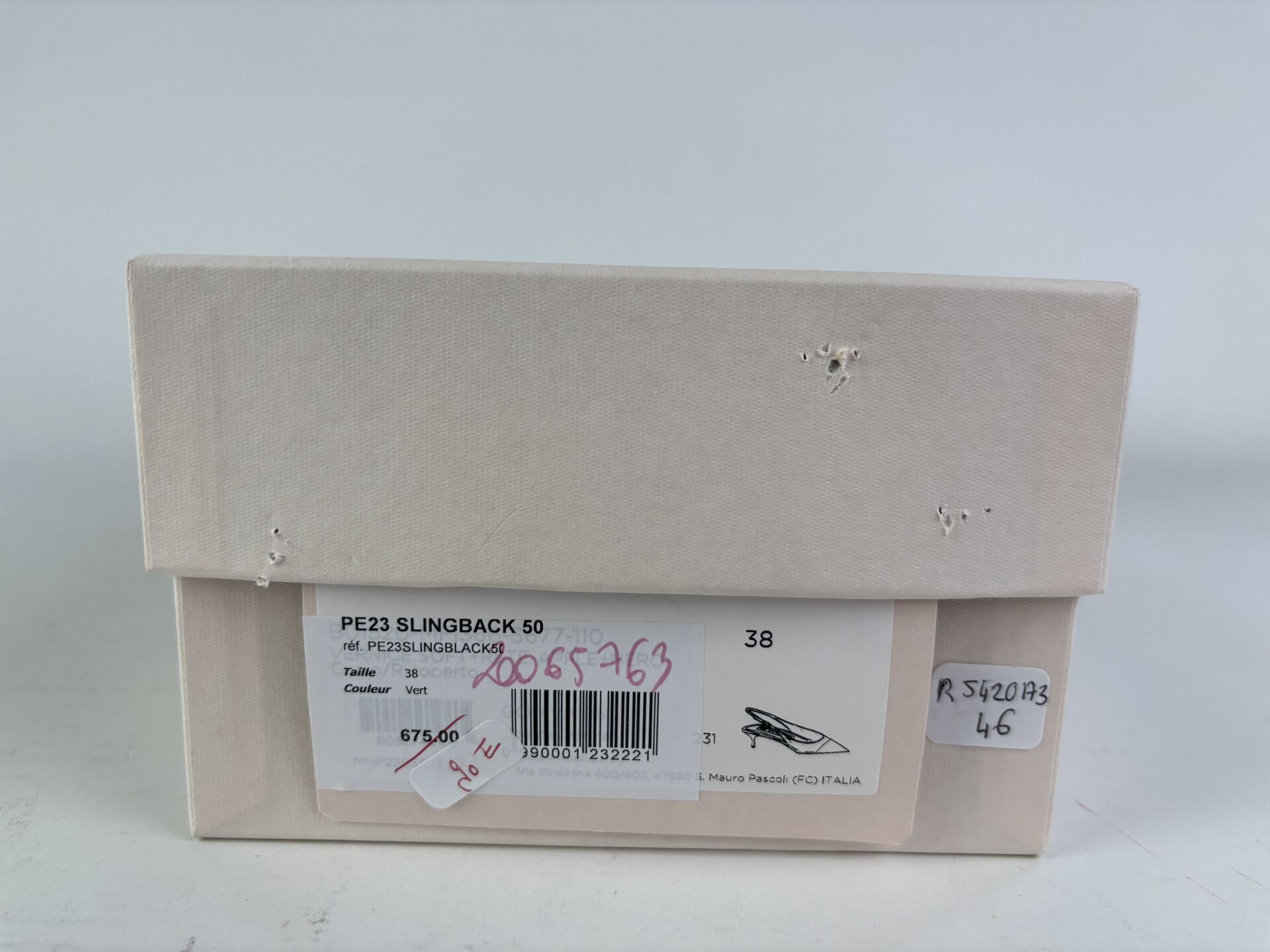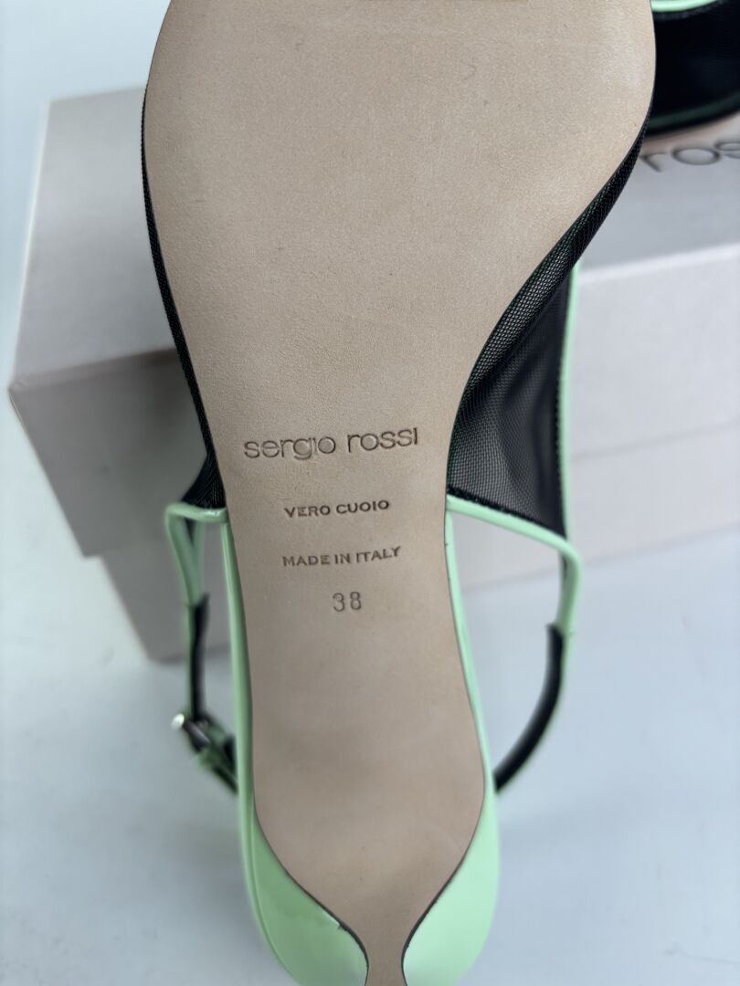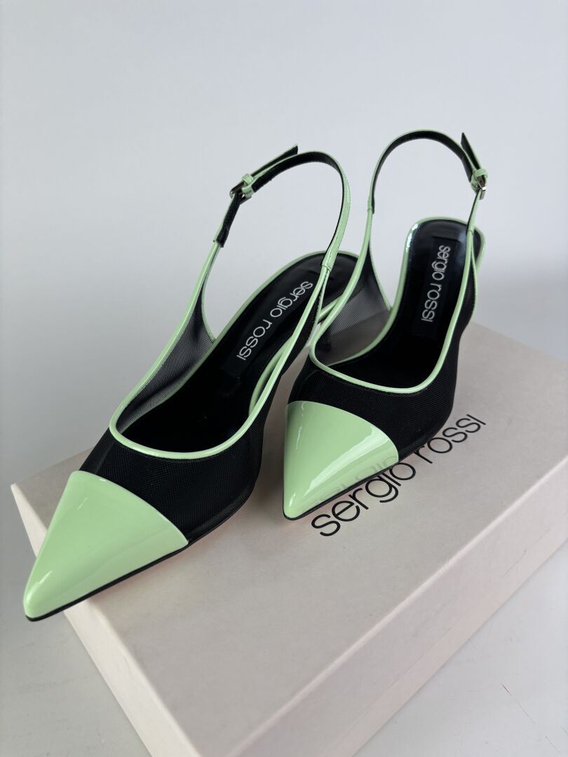 SERGIO ROSSI - Paire d'escarpins, cuir vert pistache verni et résille noire, lanière talon ajustable. Pointure 38 - Haut. du talon : 4,5 cm (très bon état)