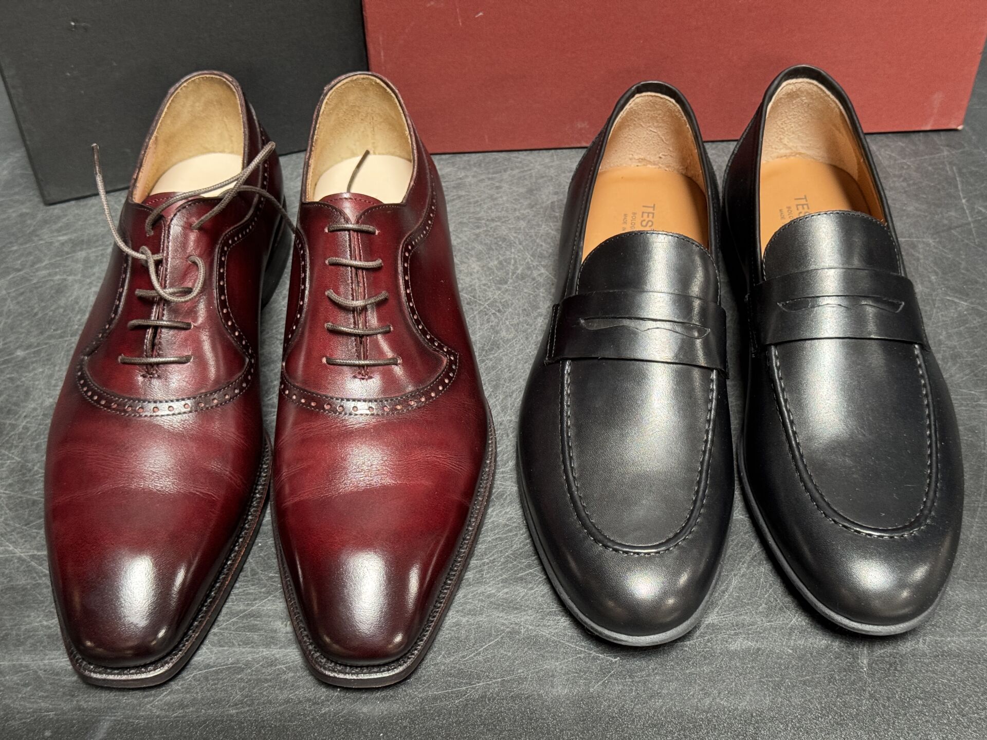 TESTONI et CNES - Deux paires de souliers pour homme comprenant une paire de mocassins en cuir noir et une paire de richelieu en cuir bordeaux. Dans leur boite. Pointure 10 (soit 44 français) et 45 Etat magasin