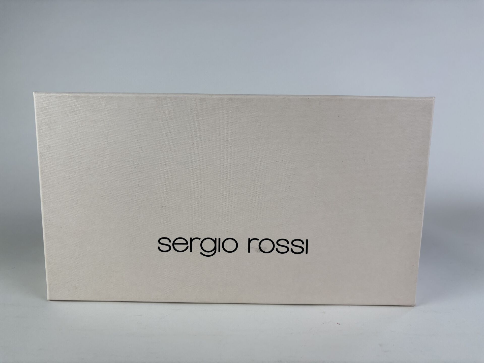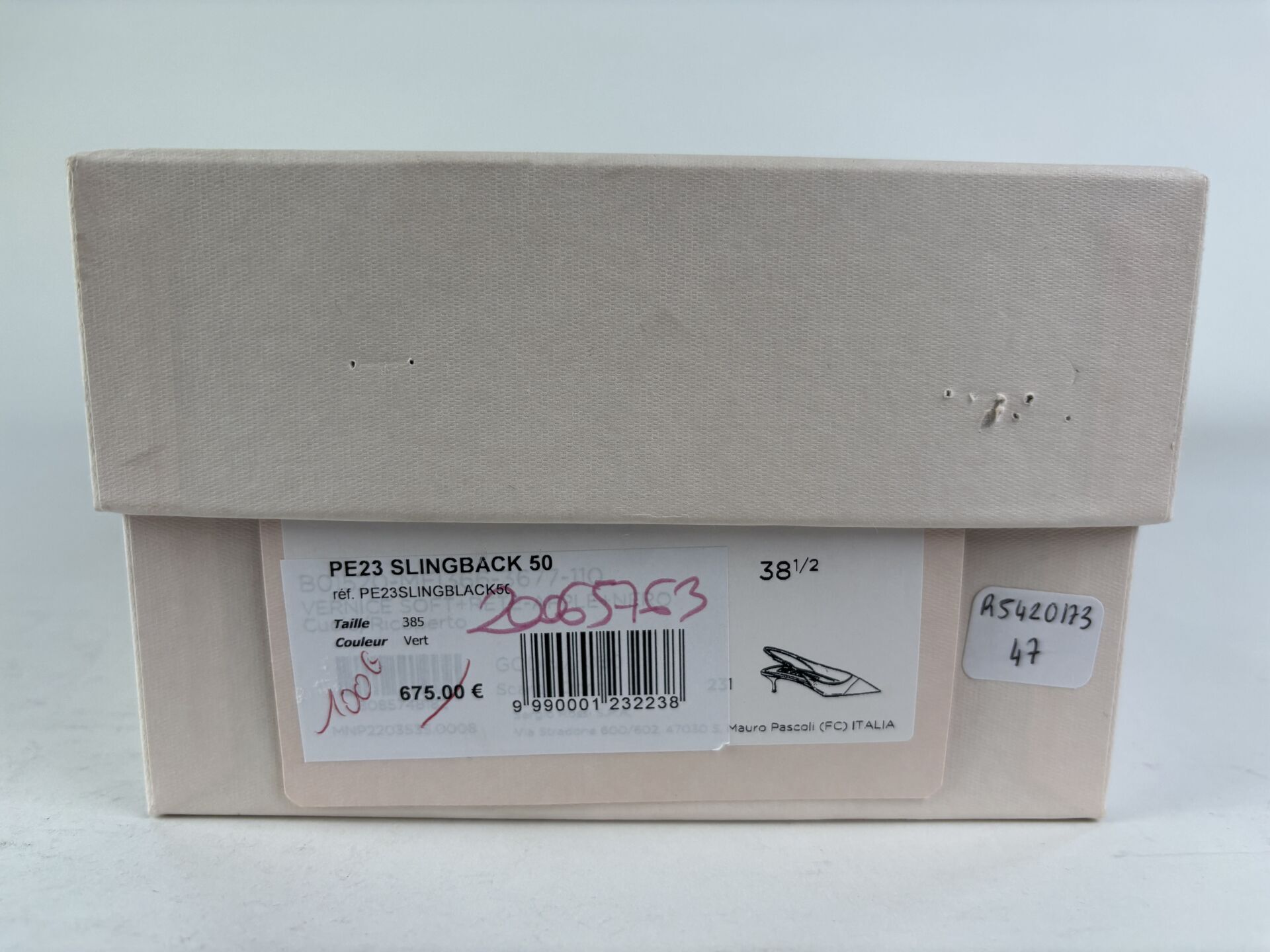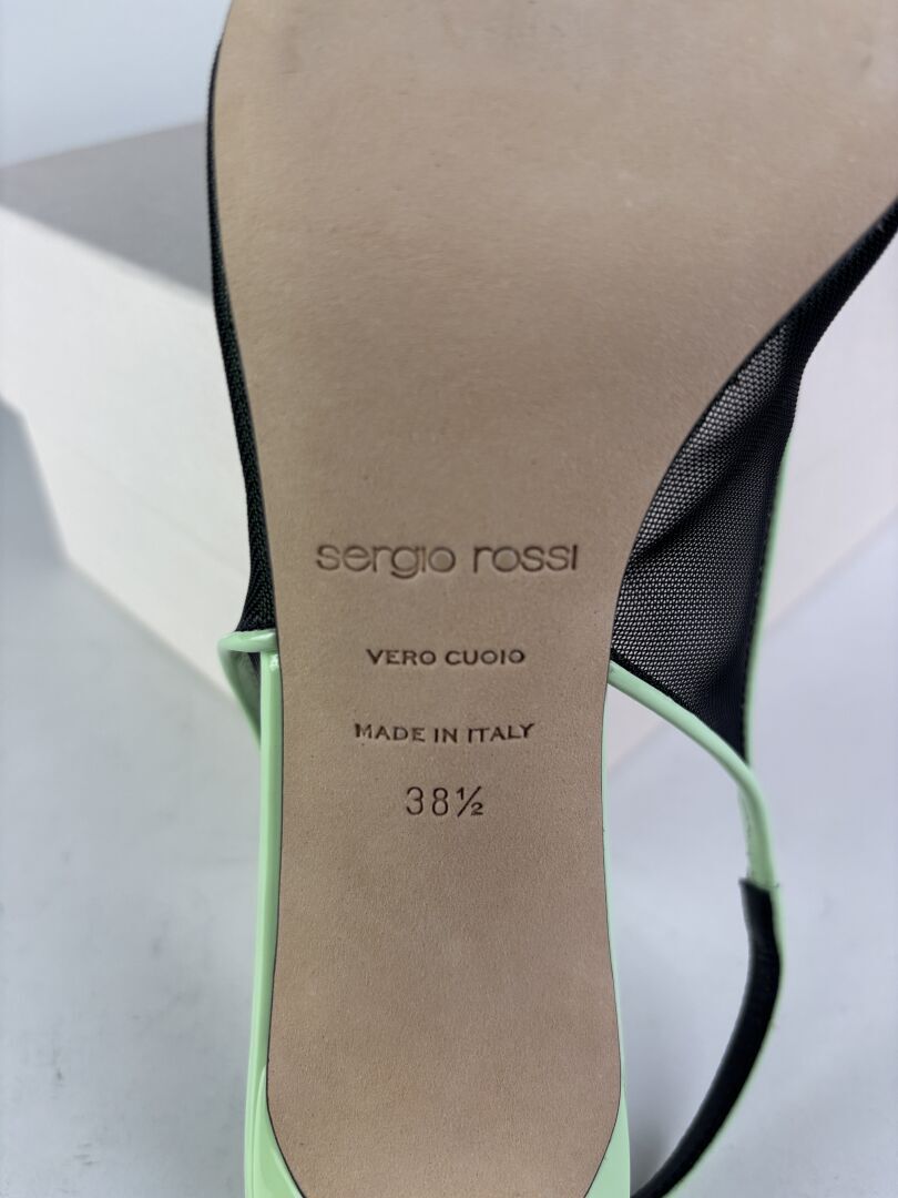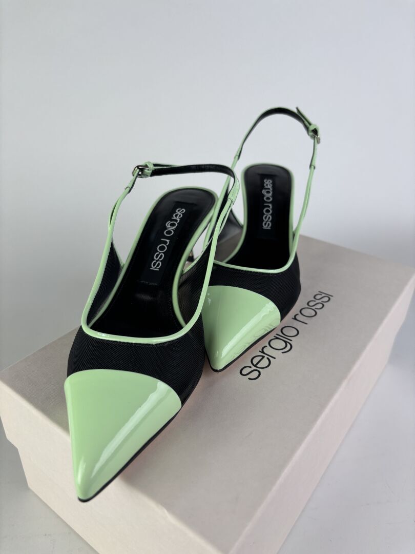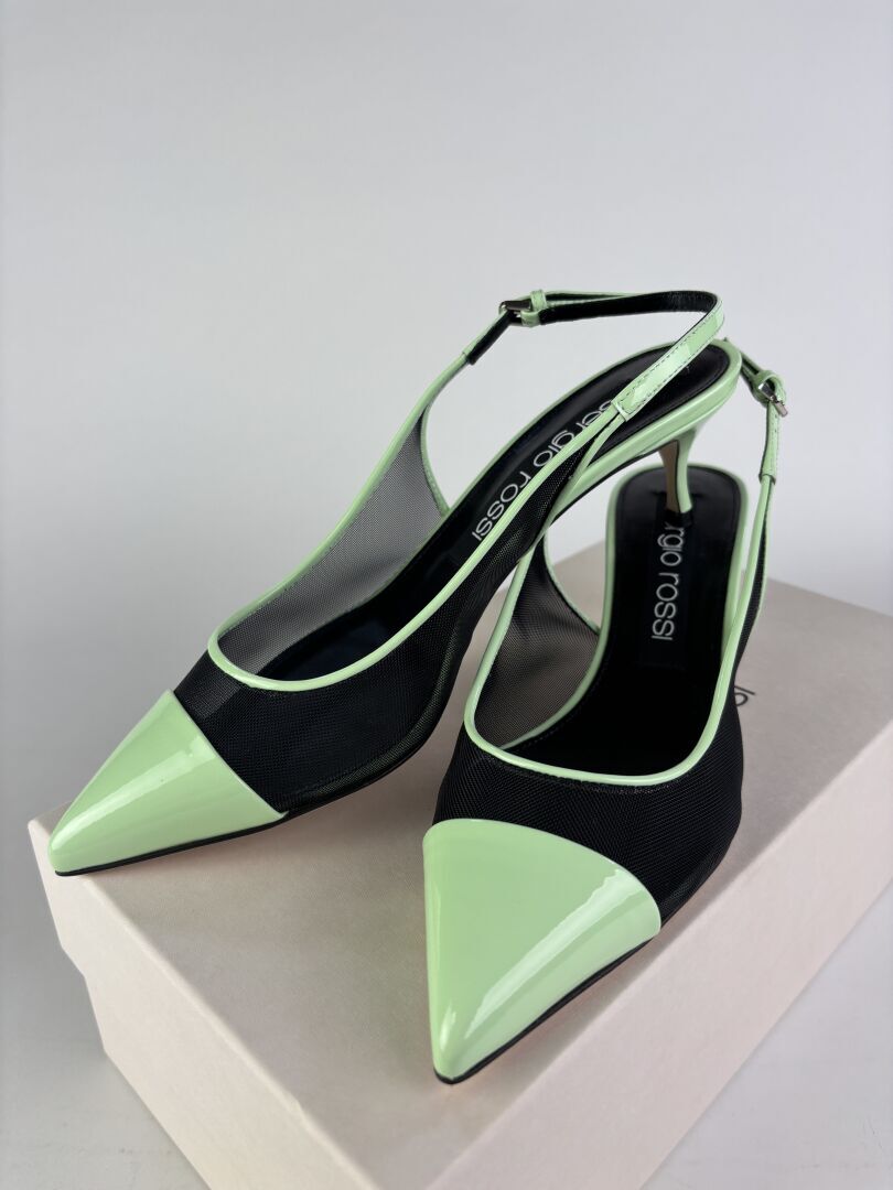 SERGIO ROSSI - Paire d'escarpins, cuir vert pistache verni et résille noire, lanière talon ajustable. Pointure 38,5 - Haut. du talon : 4,5 cm (très bon état)