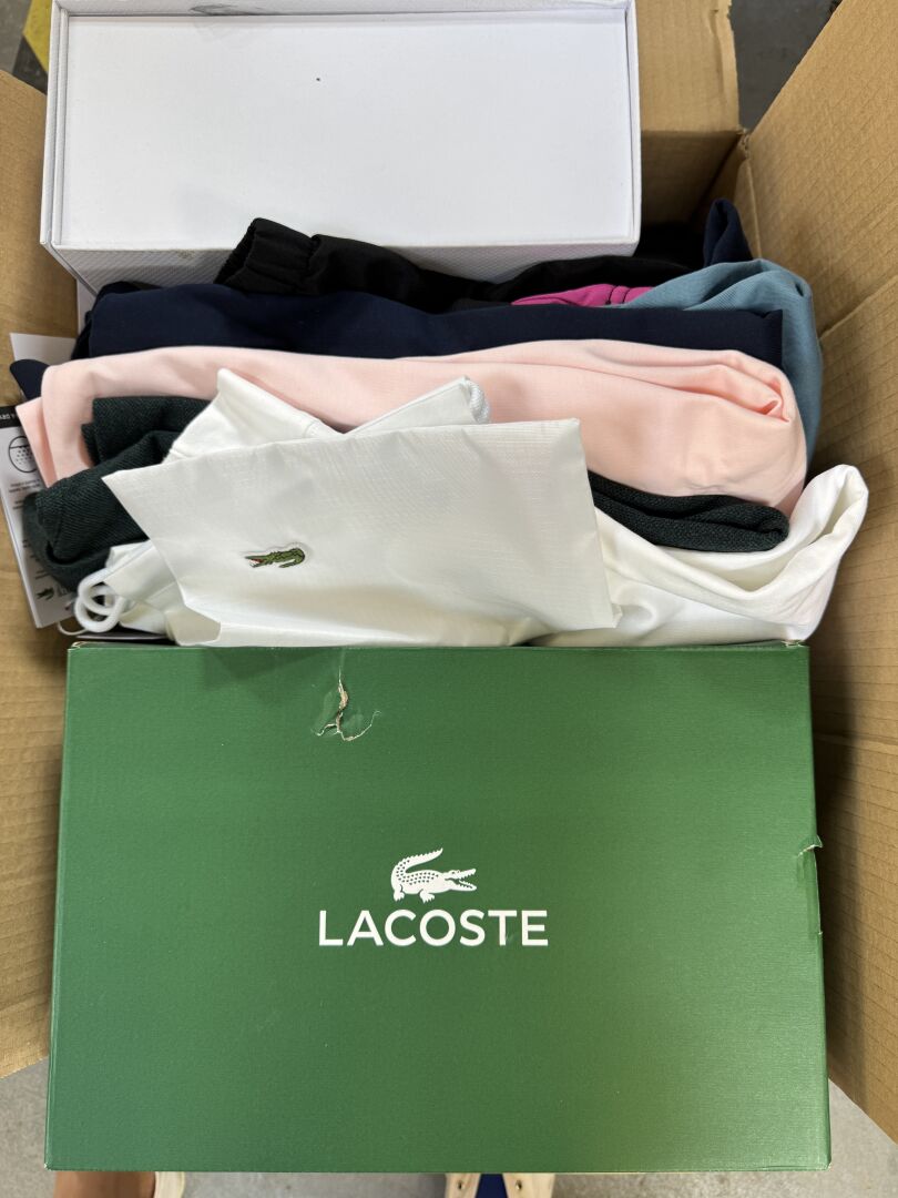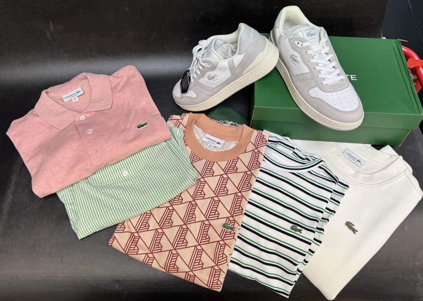 Fort ensemble d'environ 25 articles comprenant sneakers, t-shirts, pulls,… Dont LACOSTE. Différentes tailles (très bon état général)