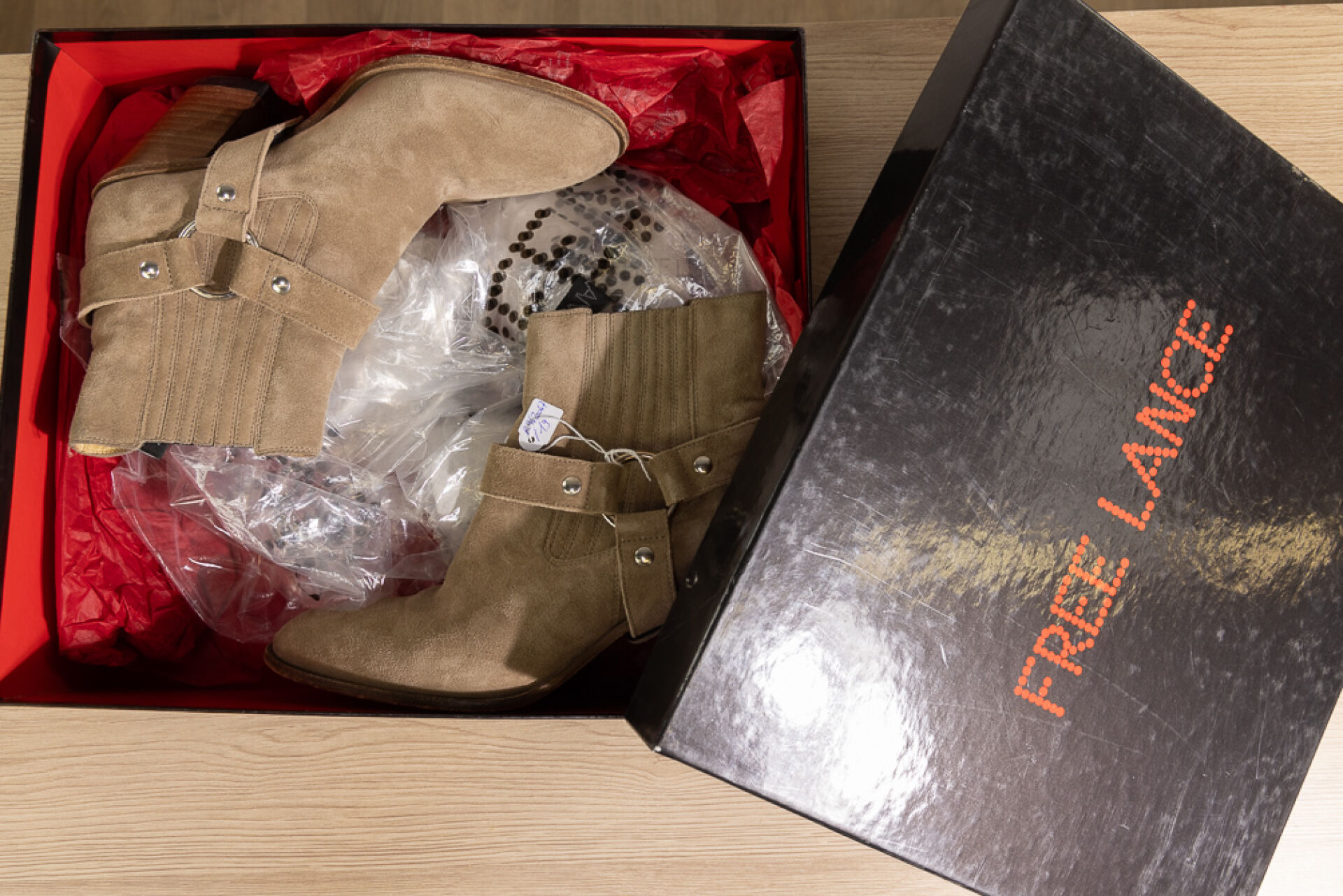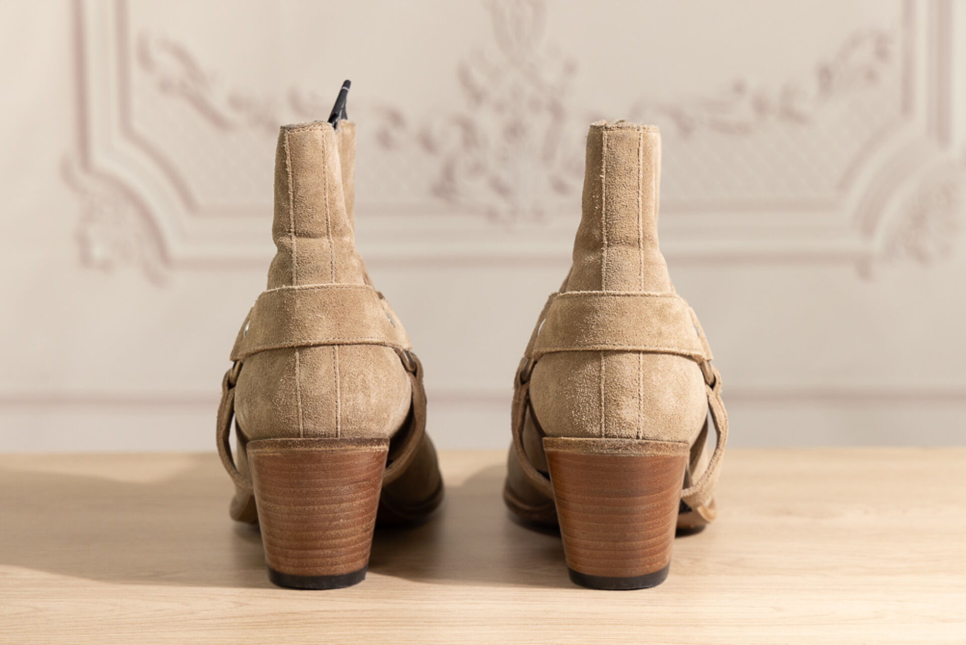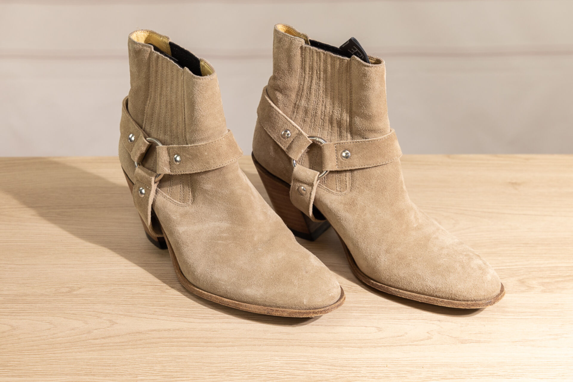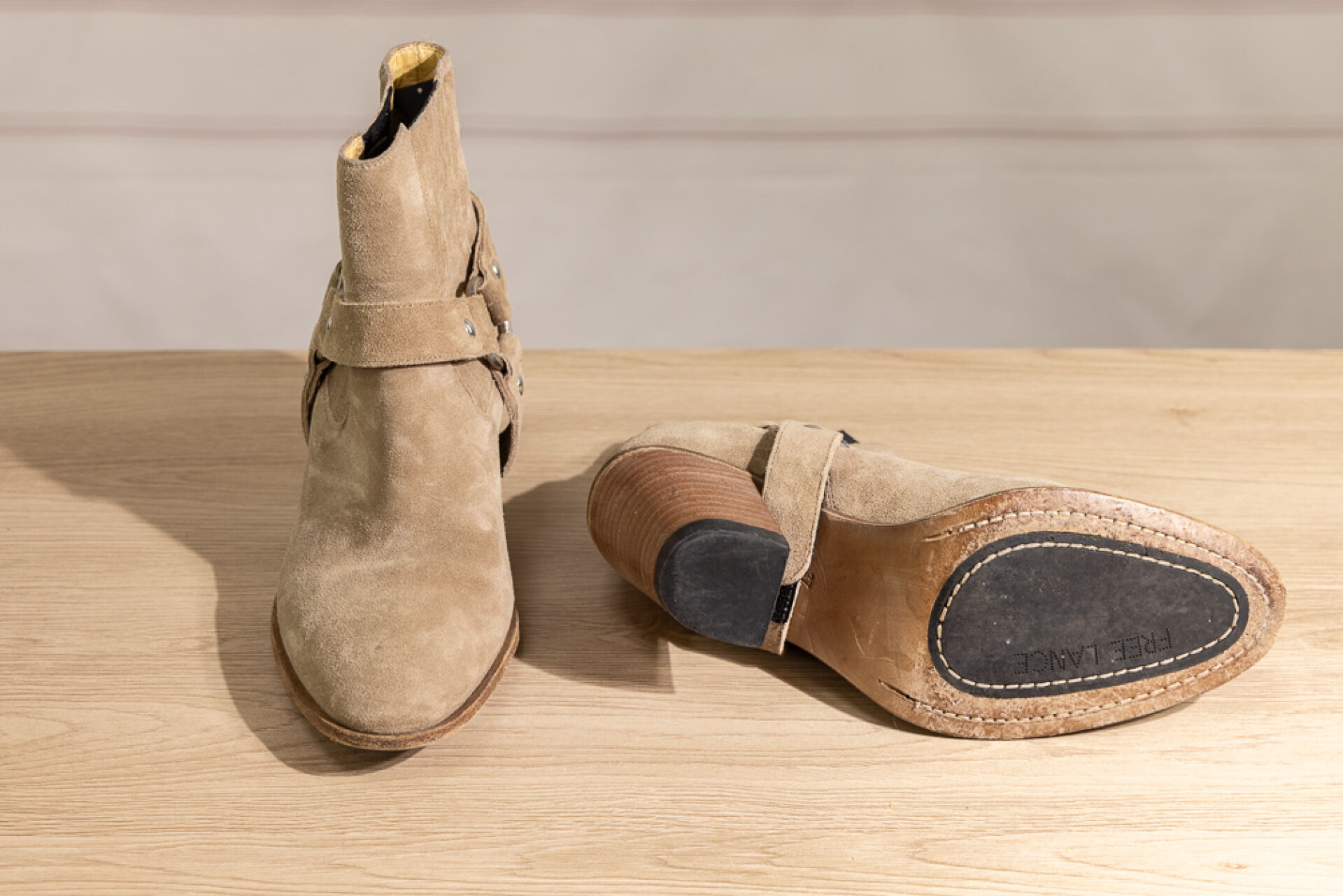 FREELANCE - Paire de bottines en daim beige façon santiags, talons biseautés de 8 cm. Bel état, quelques traces d'usage, dans sa boite. Pointure 37