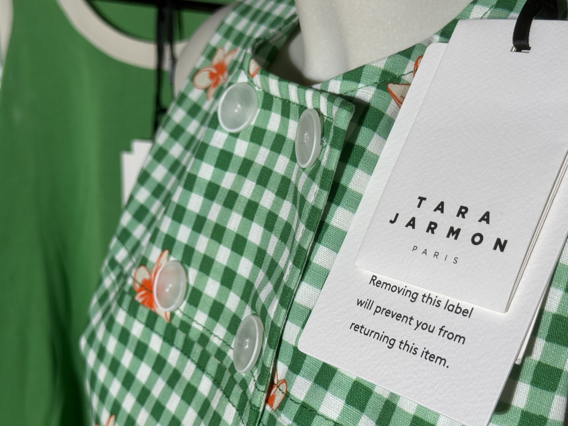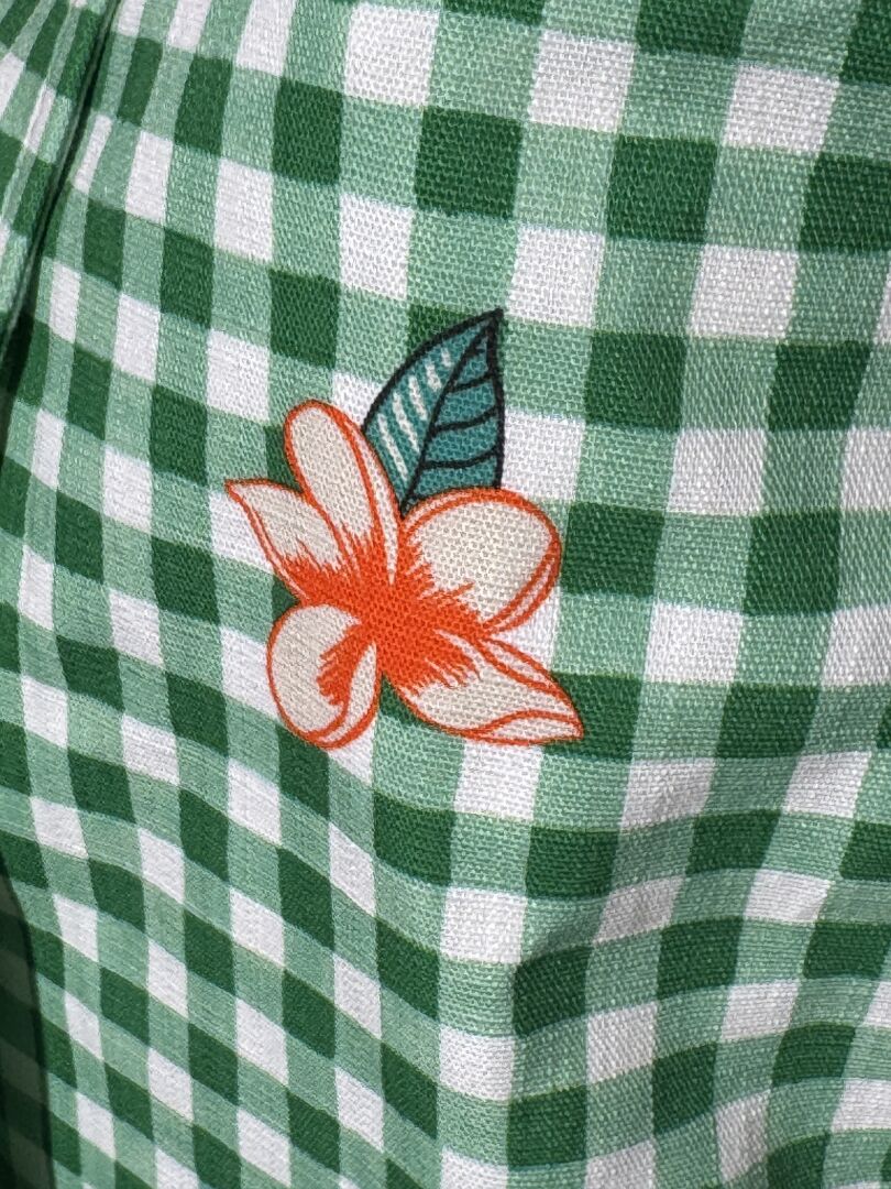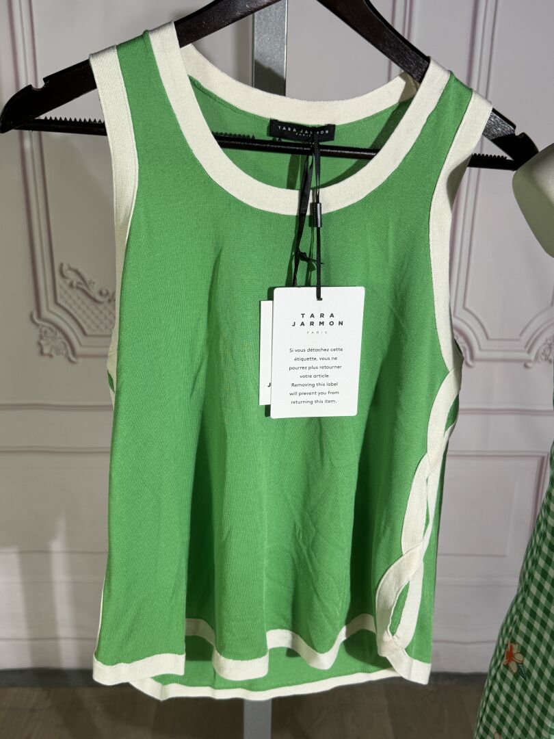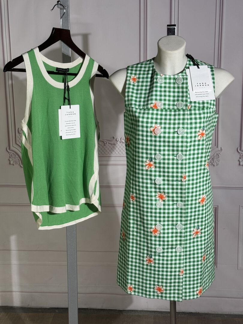 TARA JARMON - Ensemble comprenant un haut sans manche viscose et coton vert pomme détails blanc, encolure ronde (taille 2) et une robe droite sans manche, motif vichy vert et blanc imprimé de fleurs, double boutonnage (taille 36). Etat magasin
