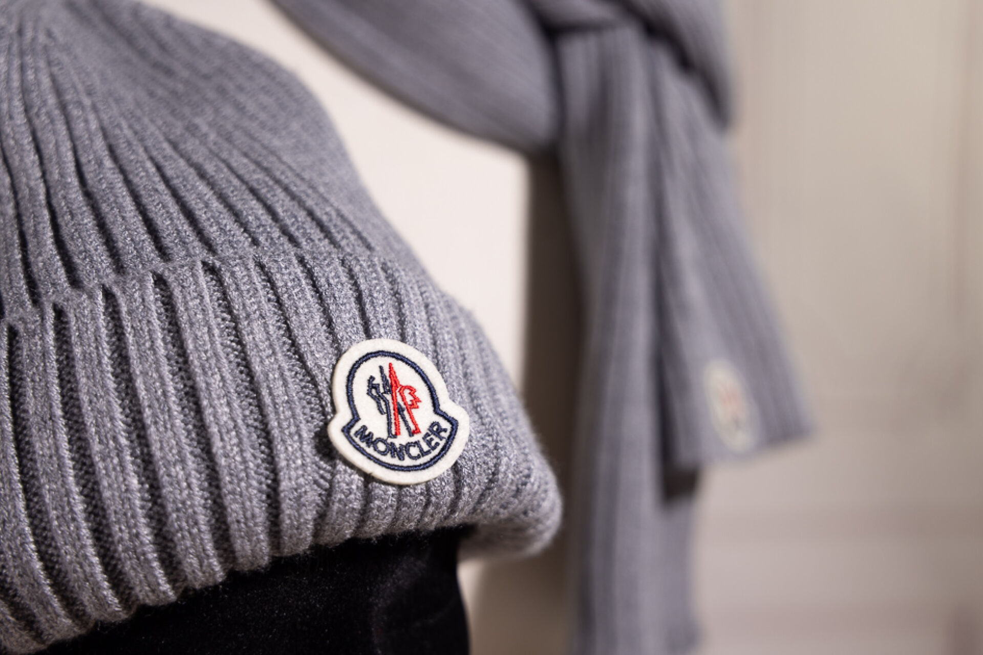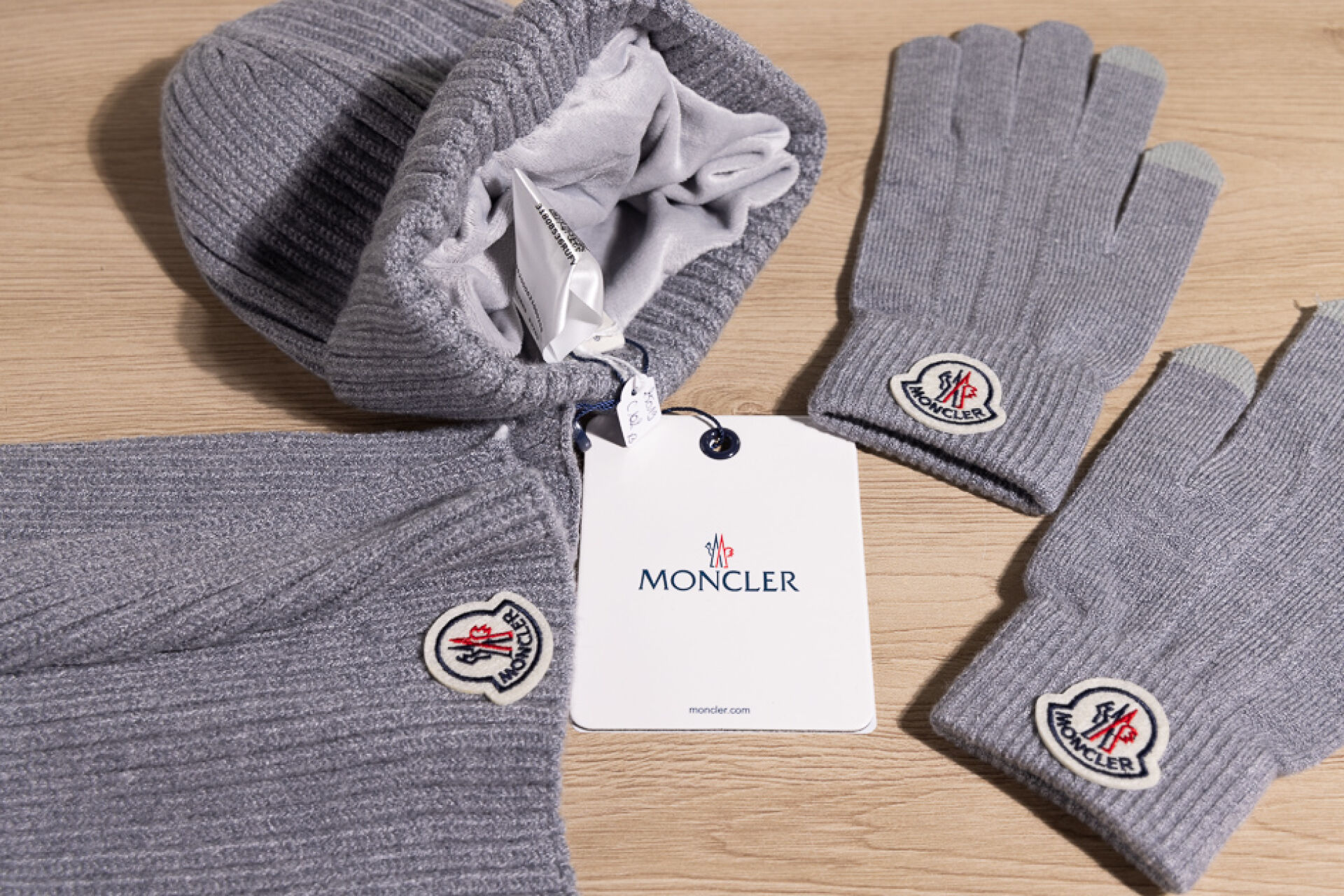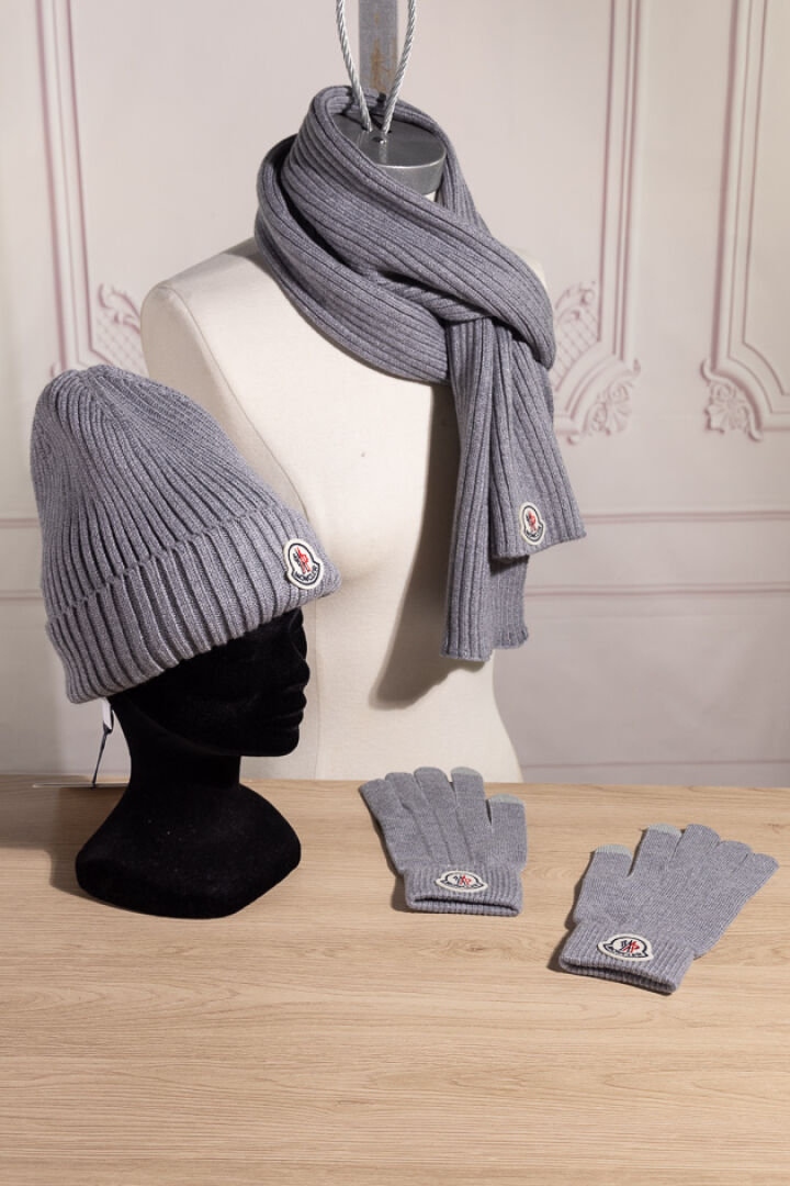 MONCLER. Lot composé d'un bonnet et d'une écharpe cotelés gris chiné et une paire de gants coordonnée. Non portés.