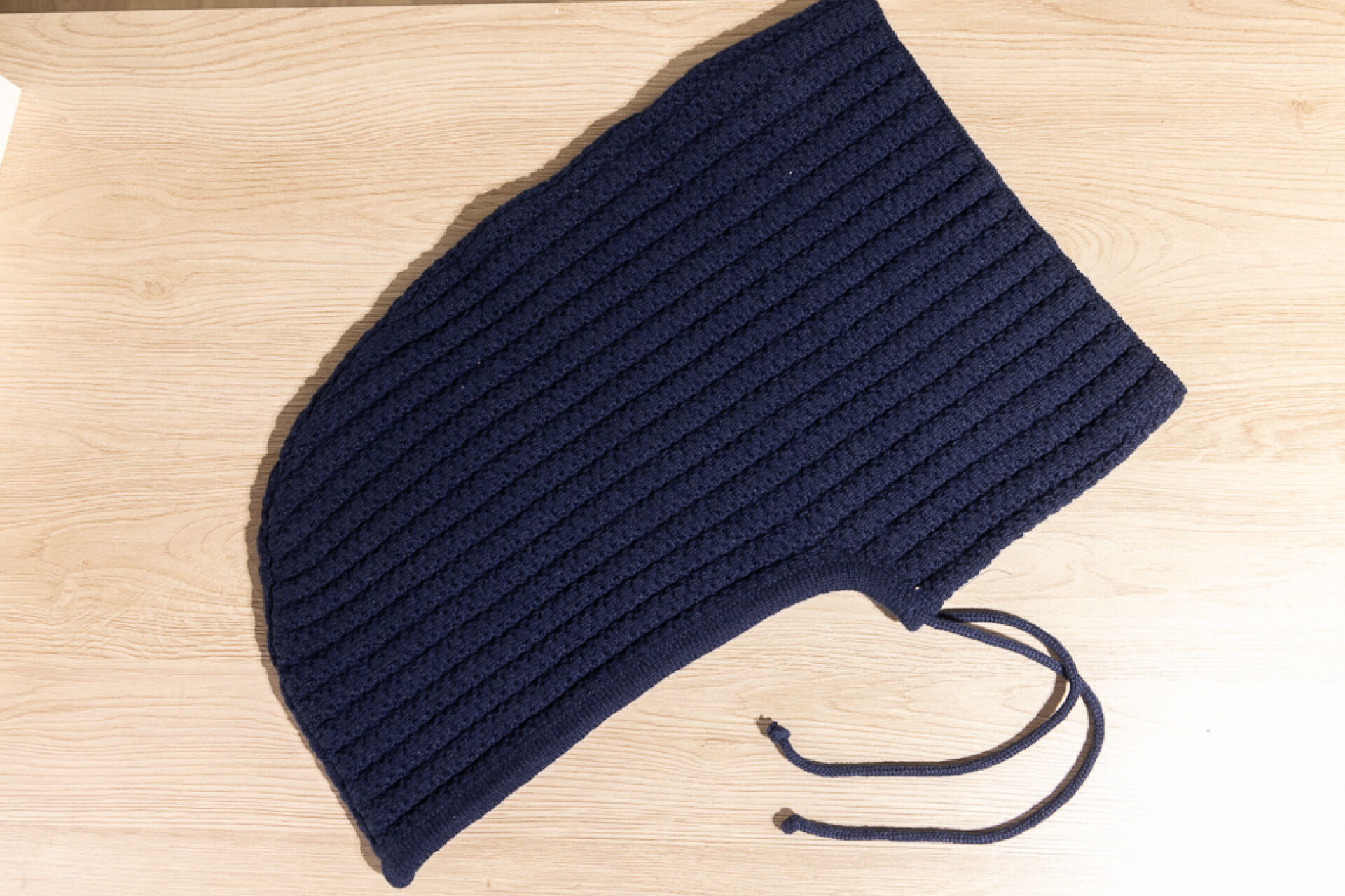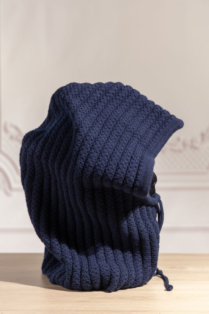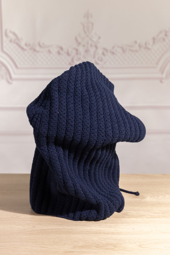 MOLLI. Cagoule en laine cotelée marine, lien à nouer à l'envie. Taille unique. Non portée, étiquette d'origine.