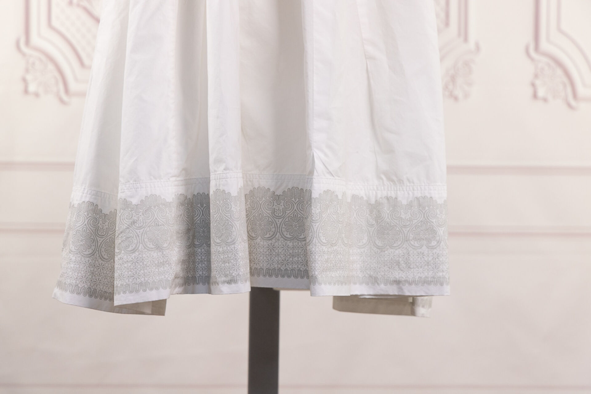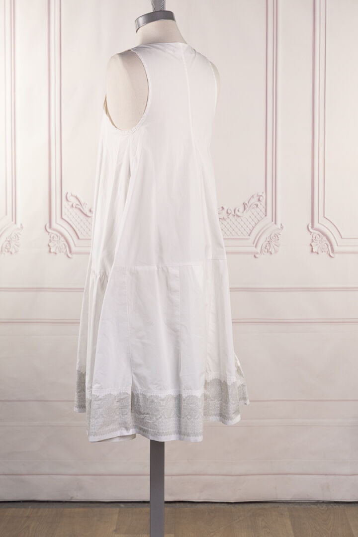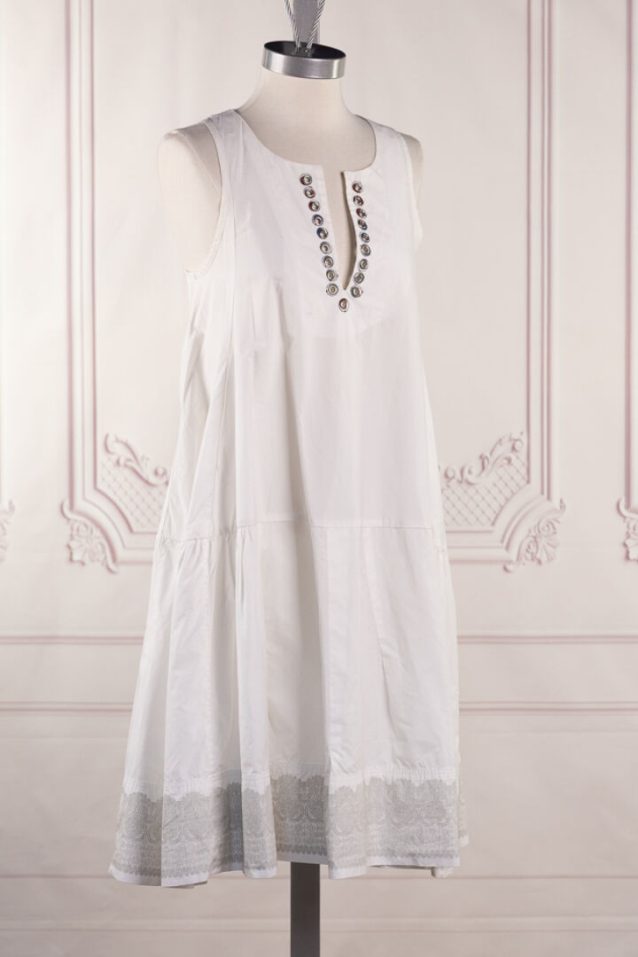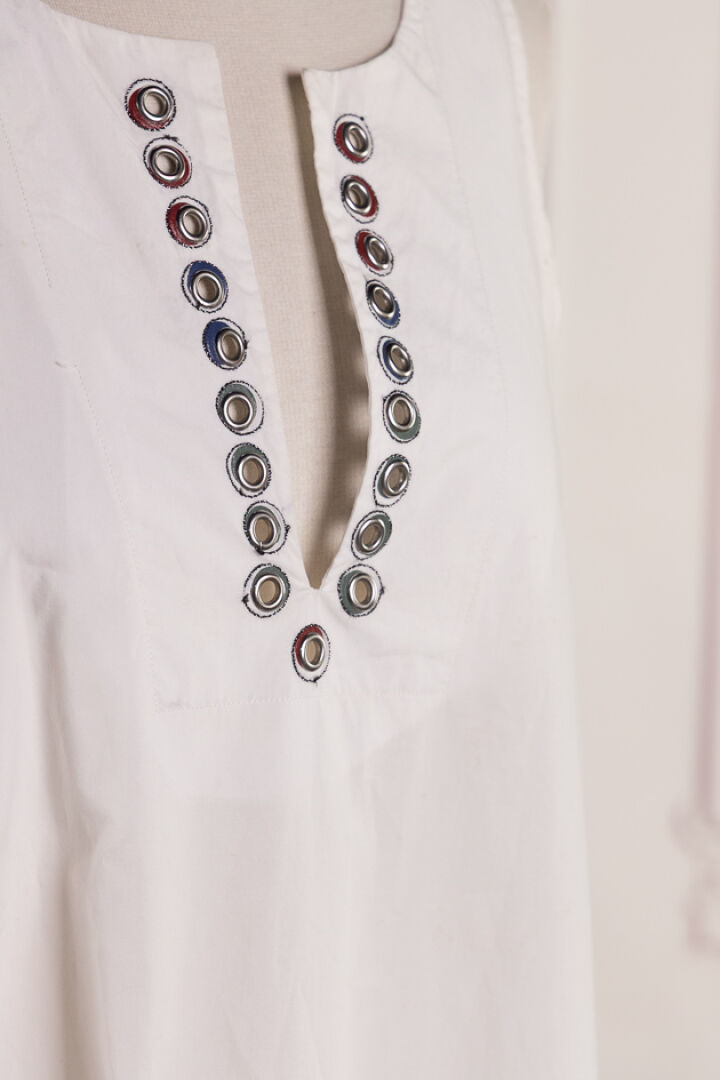 LE JEANDE MARITHE + FRANCOIS GIRBAUD - Robe mi-longue sans manche en coton blanc poitrine découpée perforée d'œillets, bas orné d'une frise couleur craie. Quelques traces de jaunissement. Taille XS
