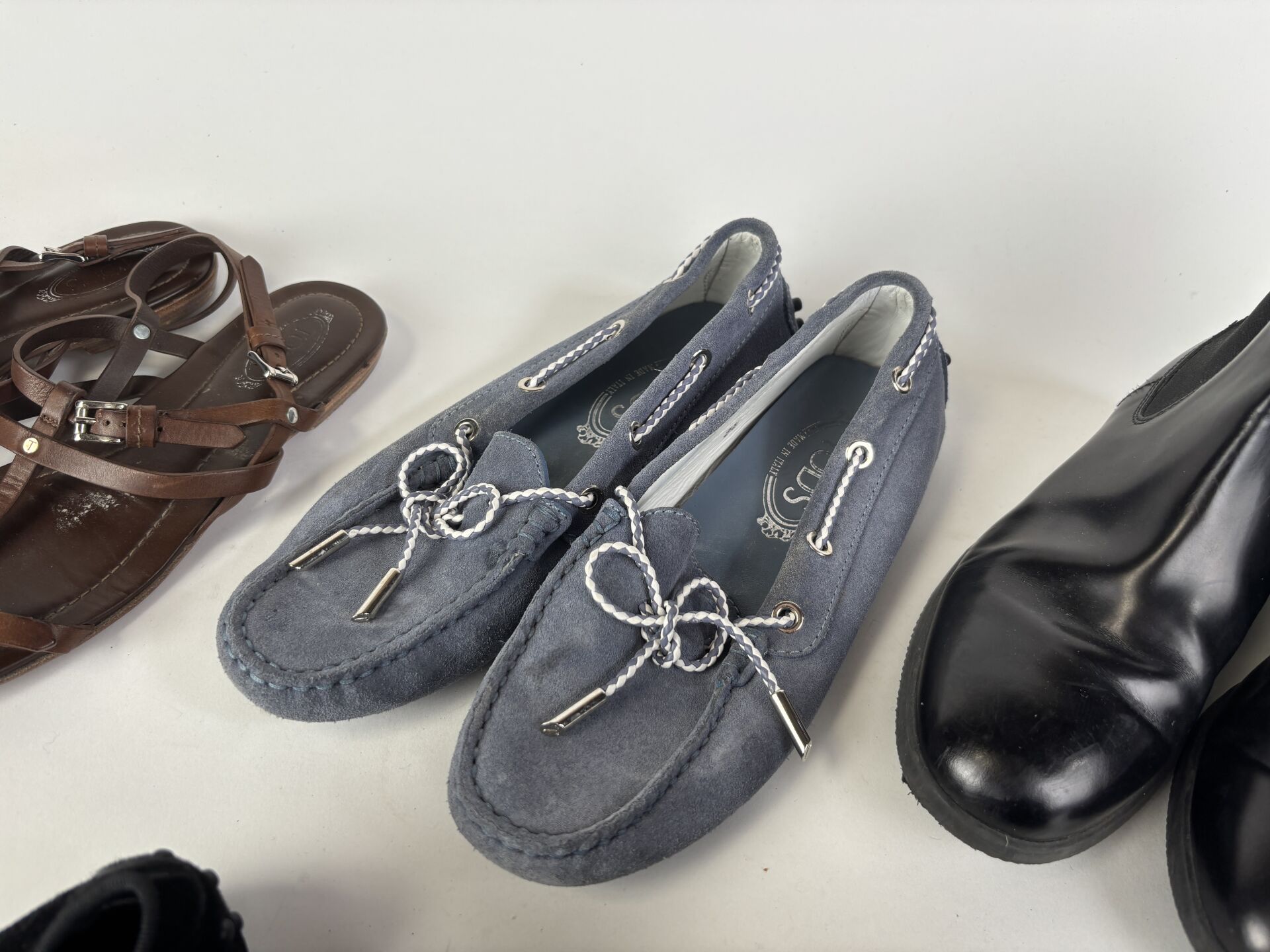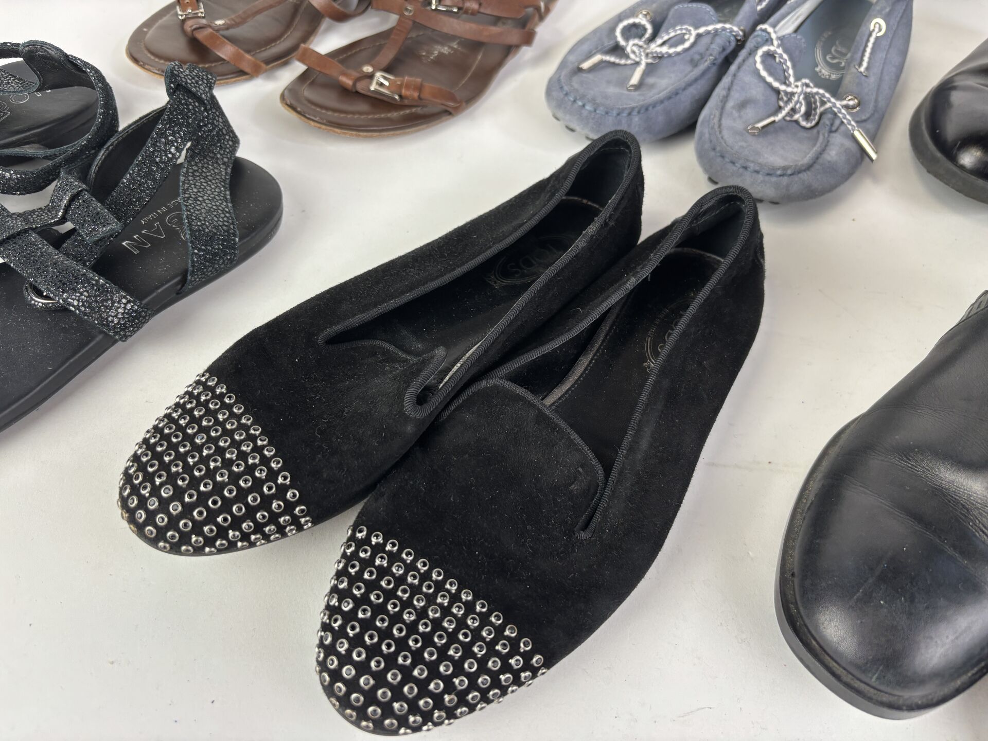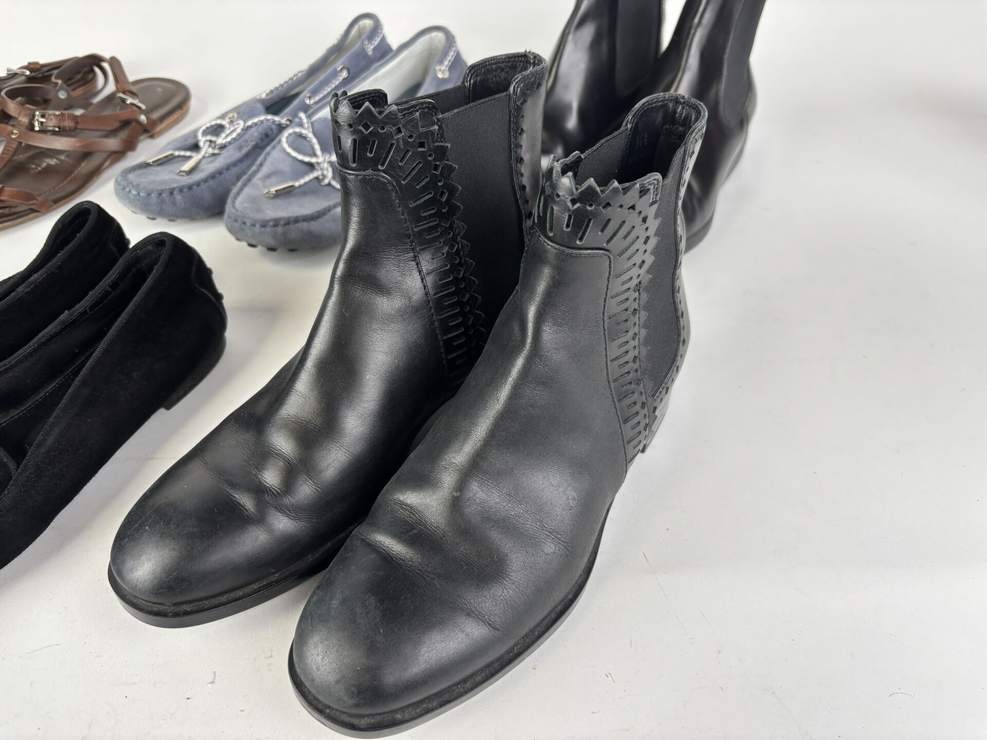 Lot de six paires de chaussures comprenant : - TOD'S - paire de boots en cuir noir repercé, petit talon - Pointure 34,5 ; - TOD'S - paire de slippers en daim noir, décor strass - Pointure 34,5 ; - TOD'S - paire de mocassins en daim gris/bleu - Pointure 35 ; - TOD'S - paire de sandales en cuir marron - Pointure 35 ; - HOGAN - paire de sandales, lanières en cuir - Pointure 34,5 ; - HOGAN - paire de boots en cuir lisse noir -Pointure 34,5. (Etat d'usage)