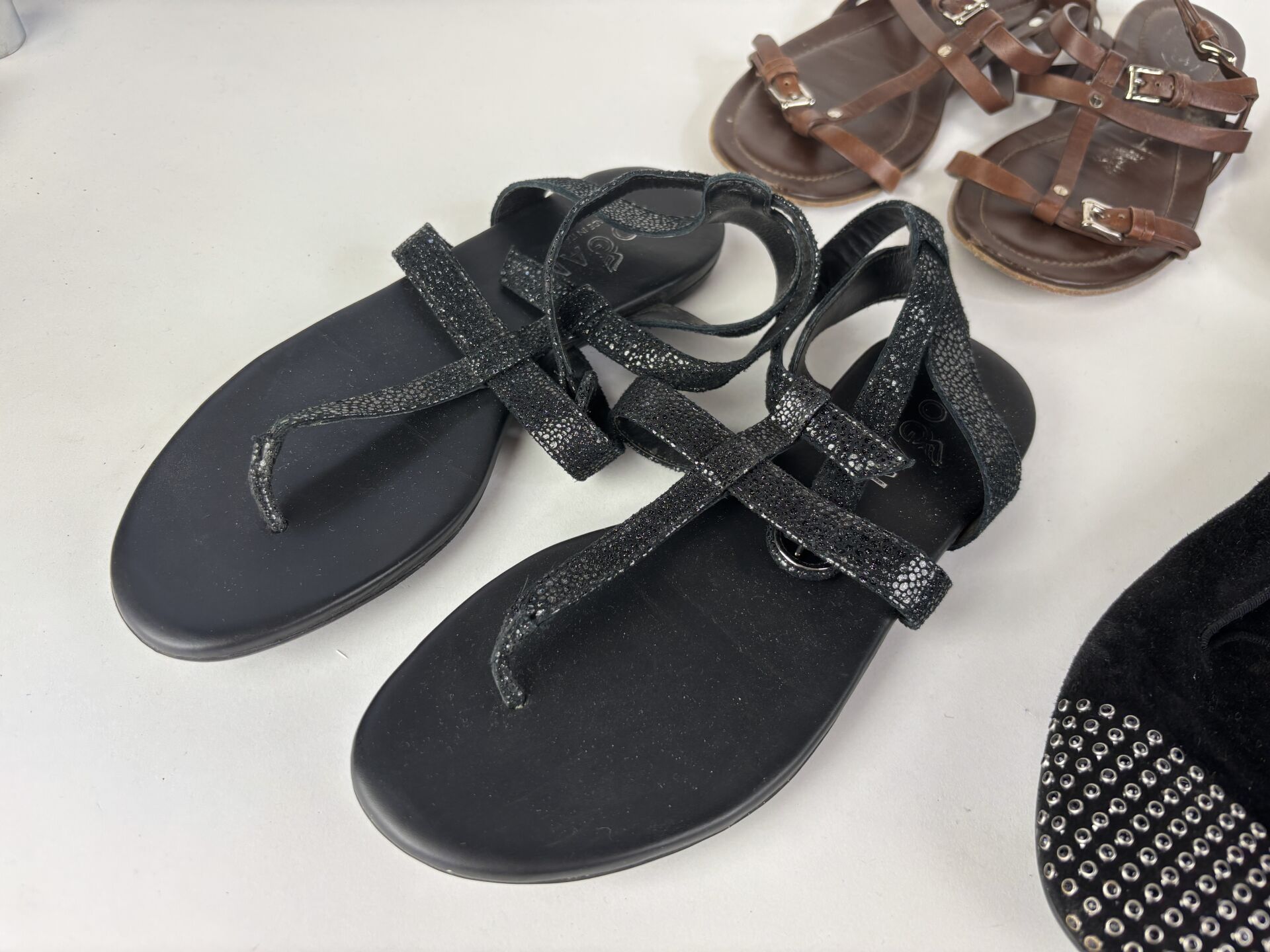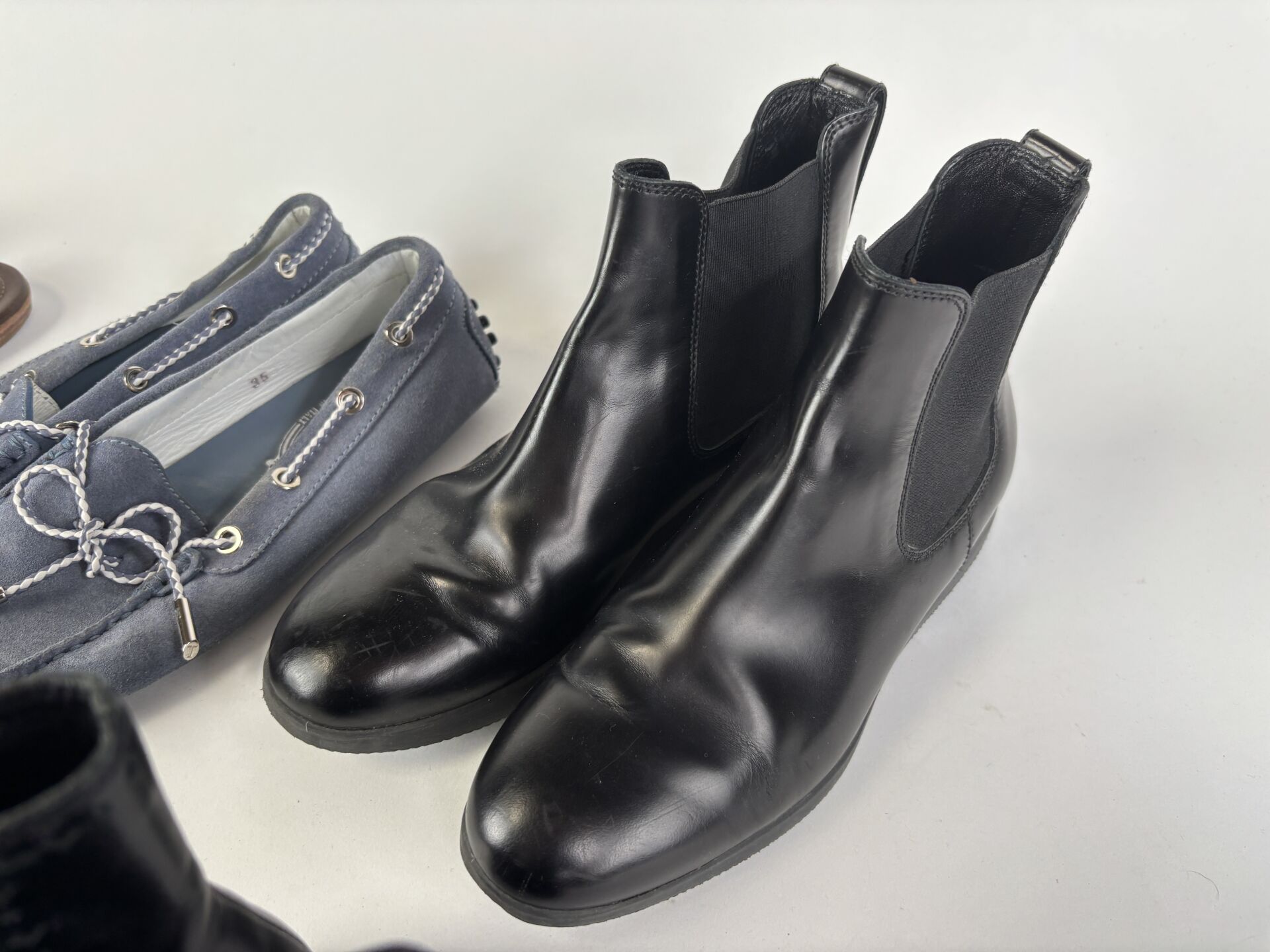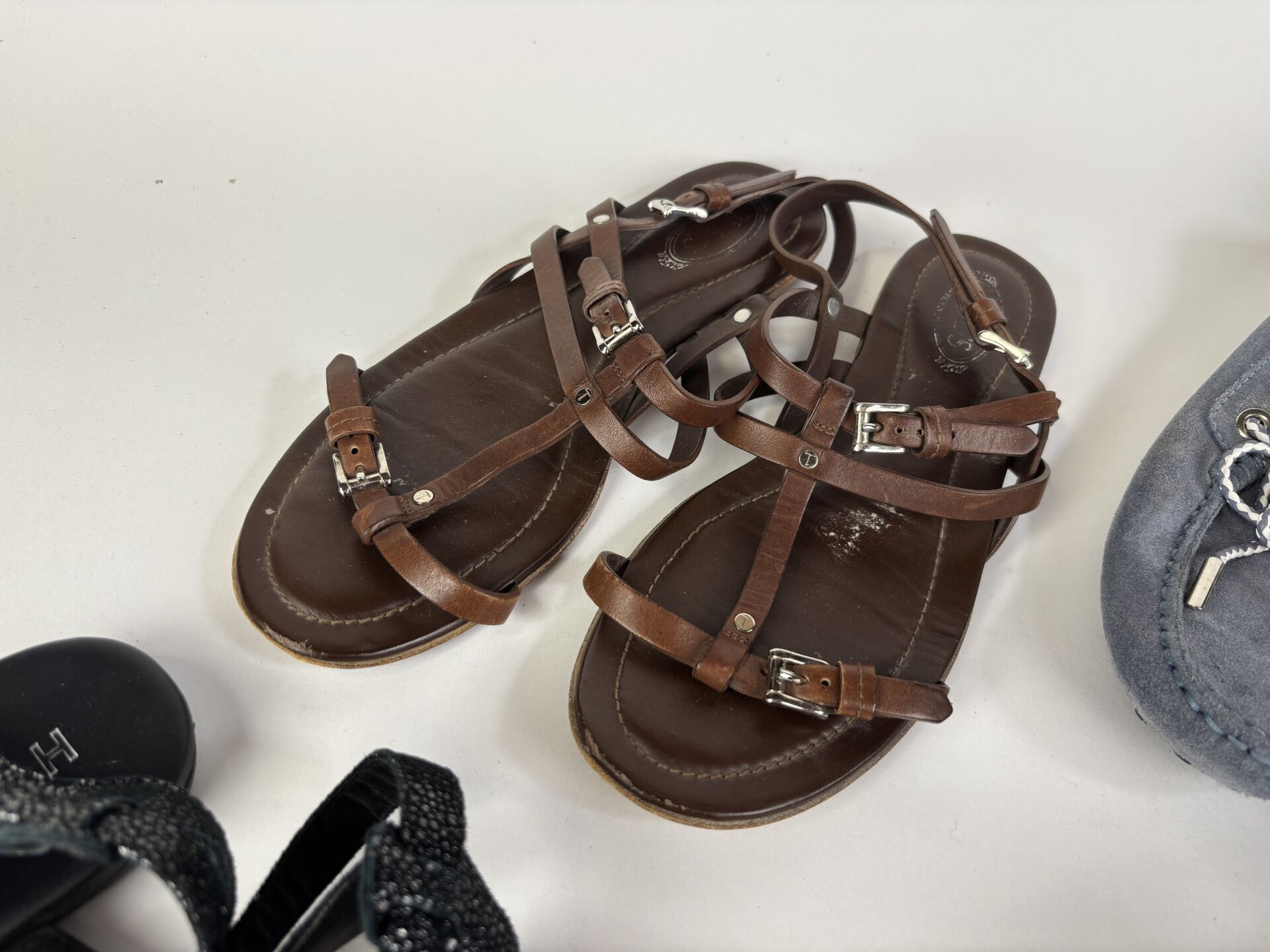 Lot de six paires de chaussures comprenant : - TOD'S - paire de boots en cuir noir repercé, petit talon - Pointure 34,5 ; - TOD'S - paire de slippers en daim noir, décor strass - Pointure 34,5 ; - TOD'S - paire de mocassins en daim gris/bleu - Pointure 35 ; - TOD'S - paire de sandales en cuir marron - Pointure 35 ; - HOGAN - paire de sandales, lanières en cuir - Pointure 34,5 ; - HOGAN - paire de boots en cuir lisse noir -Pointure 34,5. (Etat d'usage)