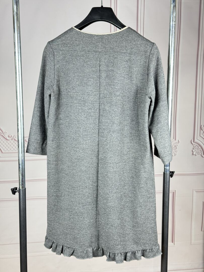 APC - Robe en lainage gris, manches 3/4, bas de la robe et col à petits volants, deux poches. Taille 36 Bon état