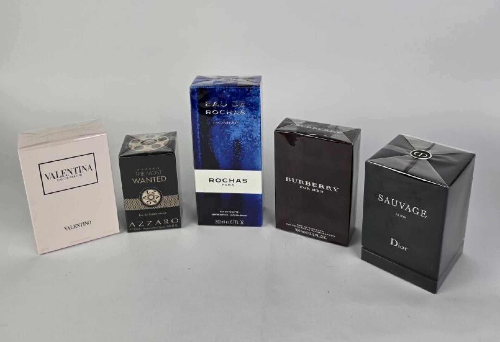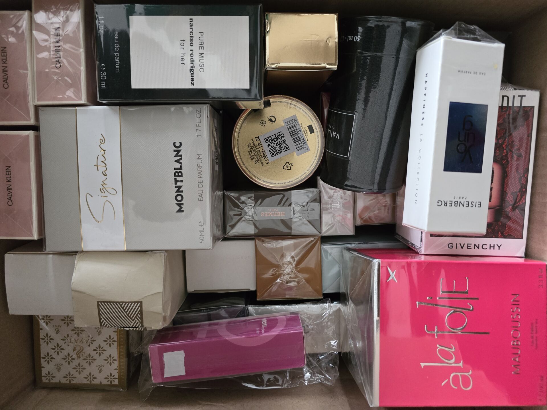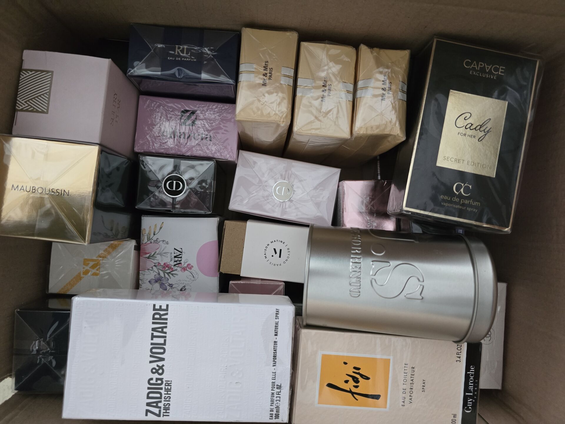Fort ensemble d'environ 90 parfums dont ROCHAS, VALENTINO, LOLITA LEMPICKA, DIOR, BURBERRY,... Eau de parfum et eau de toilette Différentes contenances