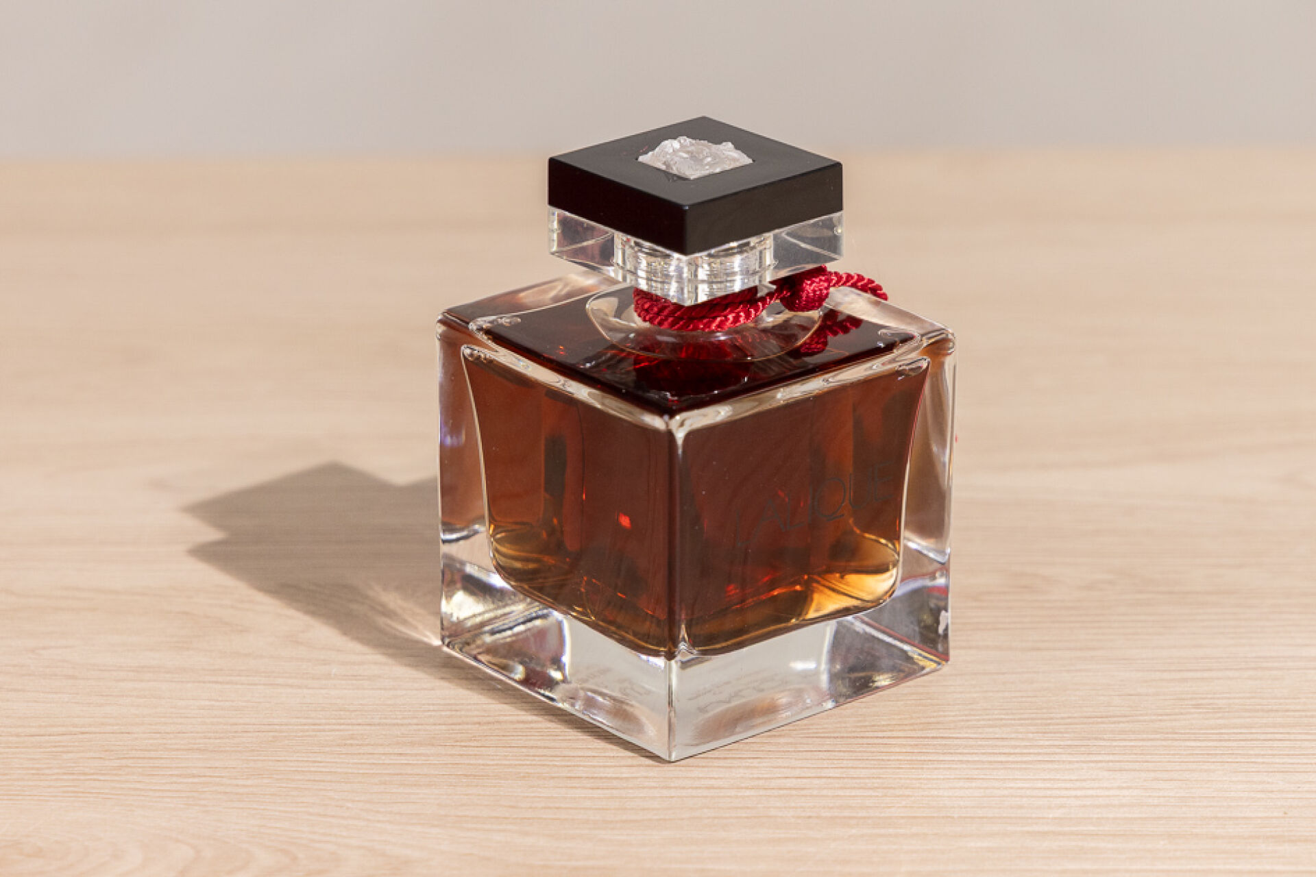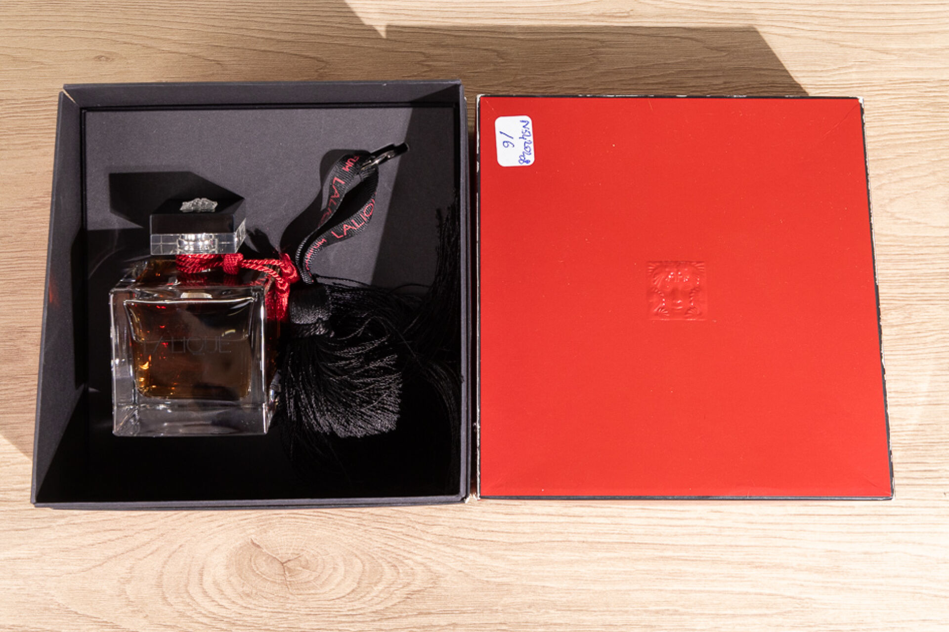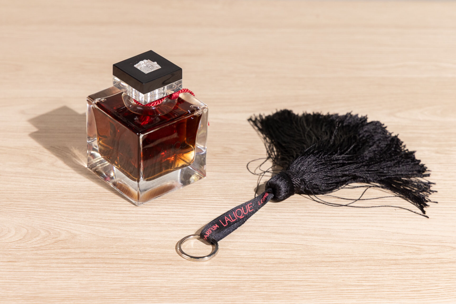 LALIQUE Le parfum. Coffret "Masque de femme" comprenant un flacon à panse cubique, bouchon orné d'un motif figurant un masque, eau de parfum 100 ml et un pompon de passementerie noir en guise de porte-clef. Dans un coffret. (flacon certainement déjà entamé, petites usures à la boite)