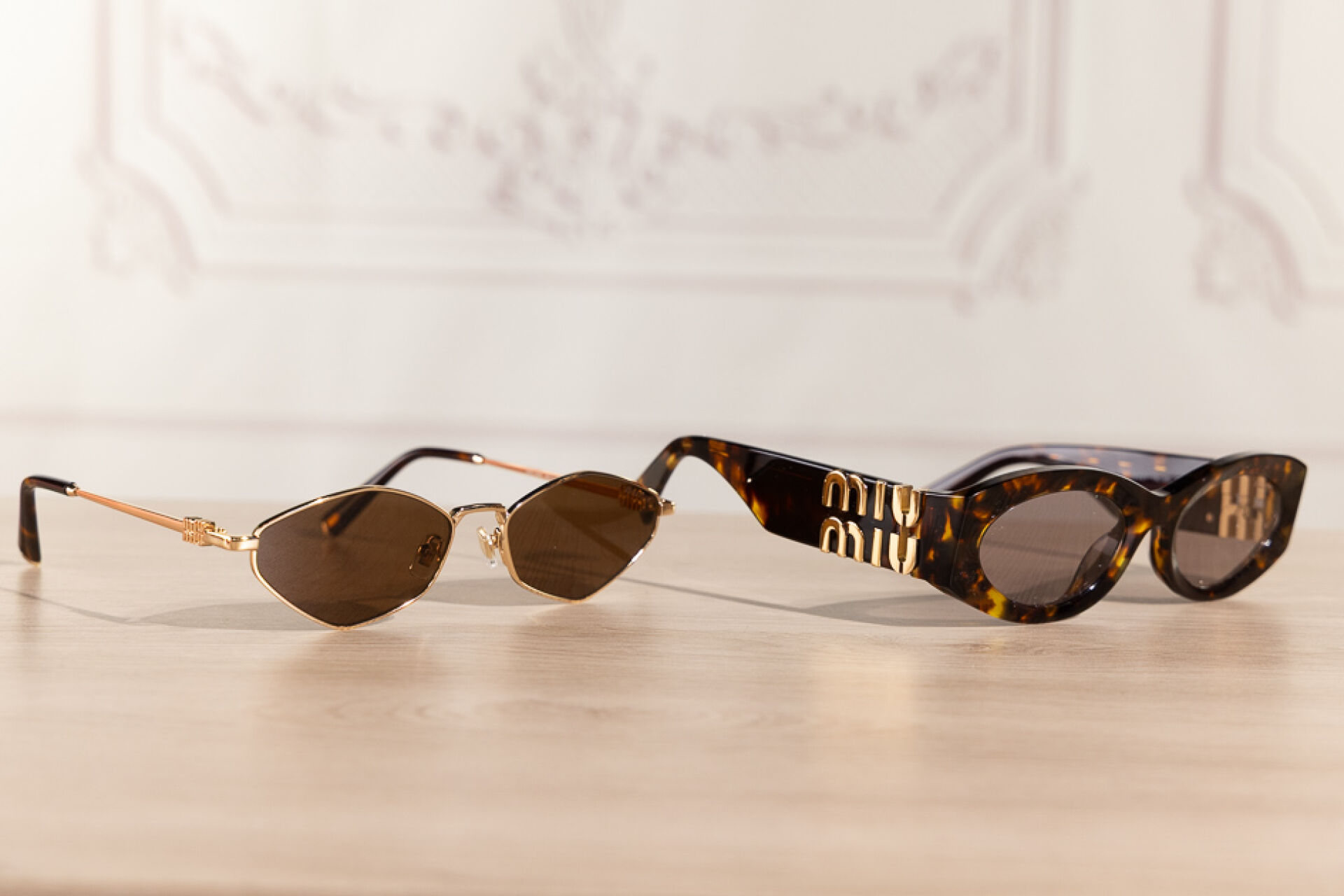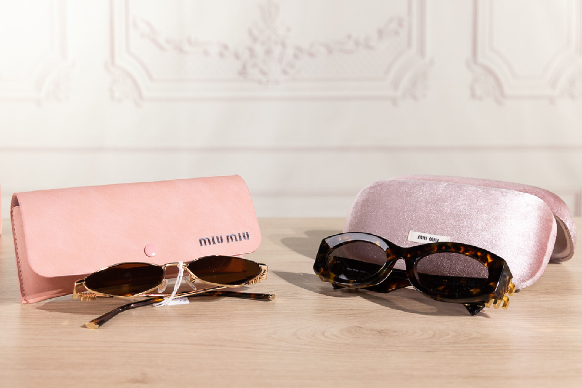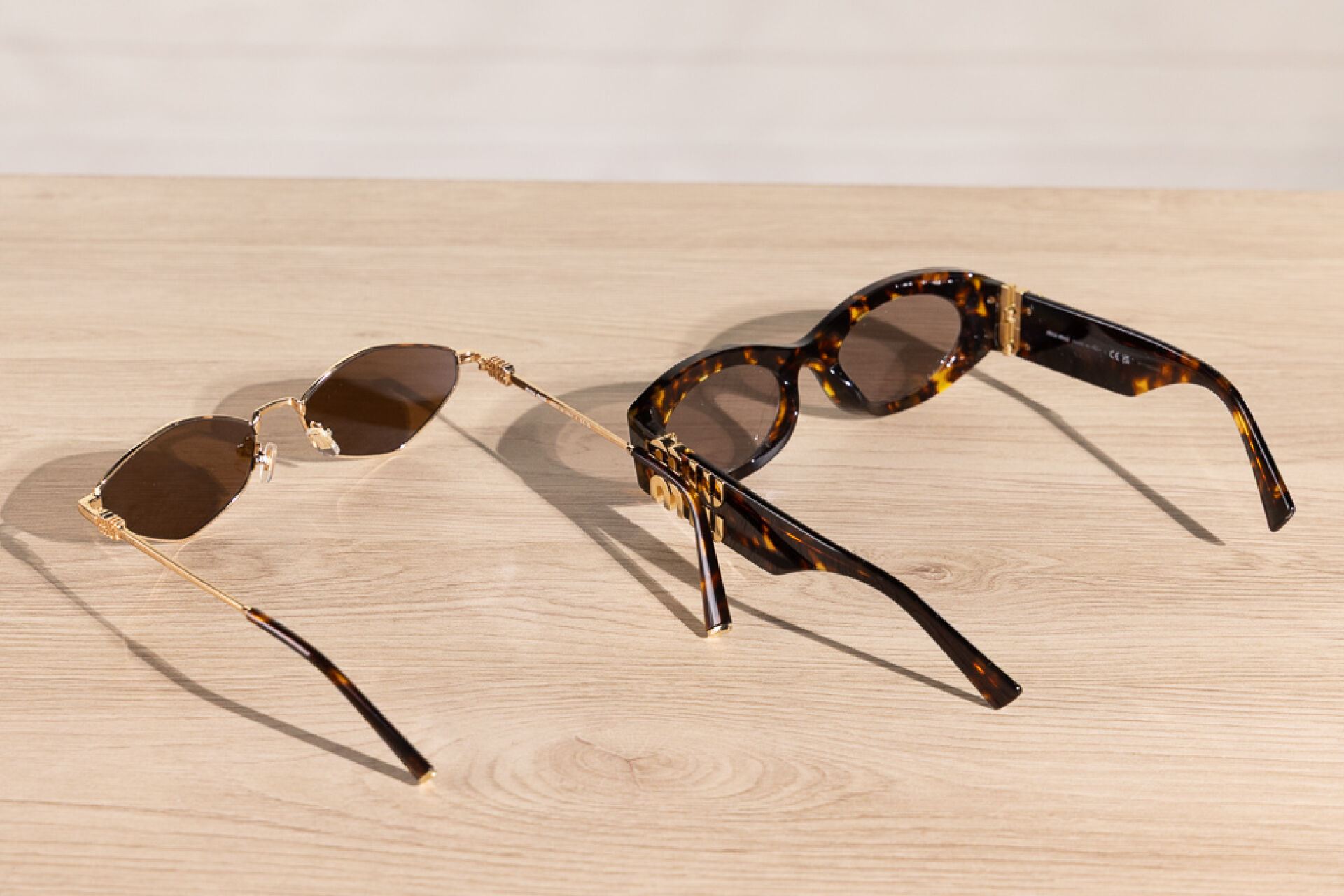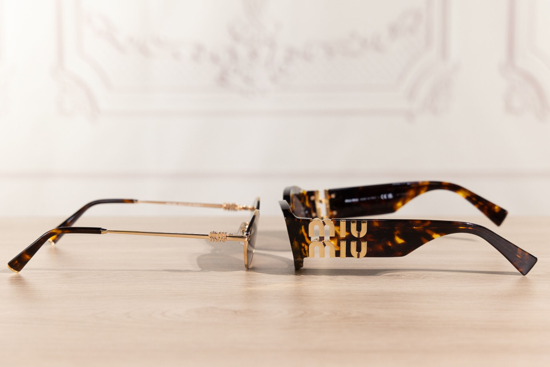 MIU MIU - Ensemble de deux paires de lunettes dont : - une paire avec une monture en imitation écaille, éléments métal doré, verres légèrement teinté, étui et boite ; - une paire solaire avec une monture en métal doré, étui et boite (abimée).