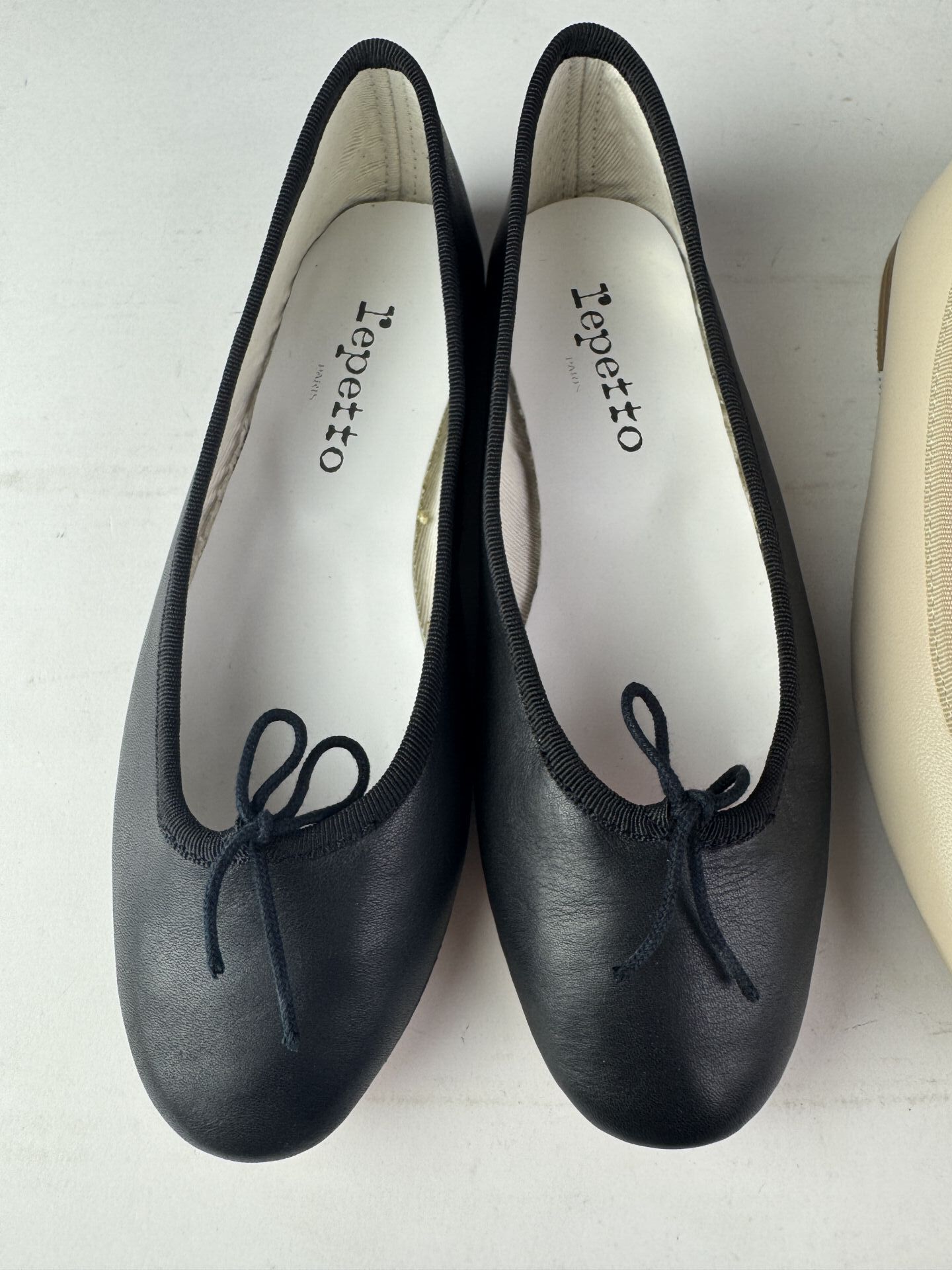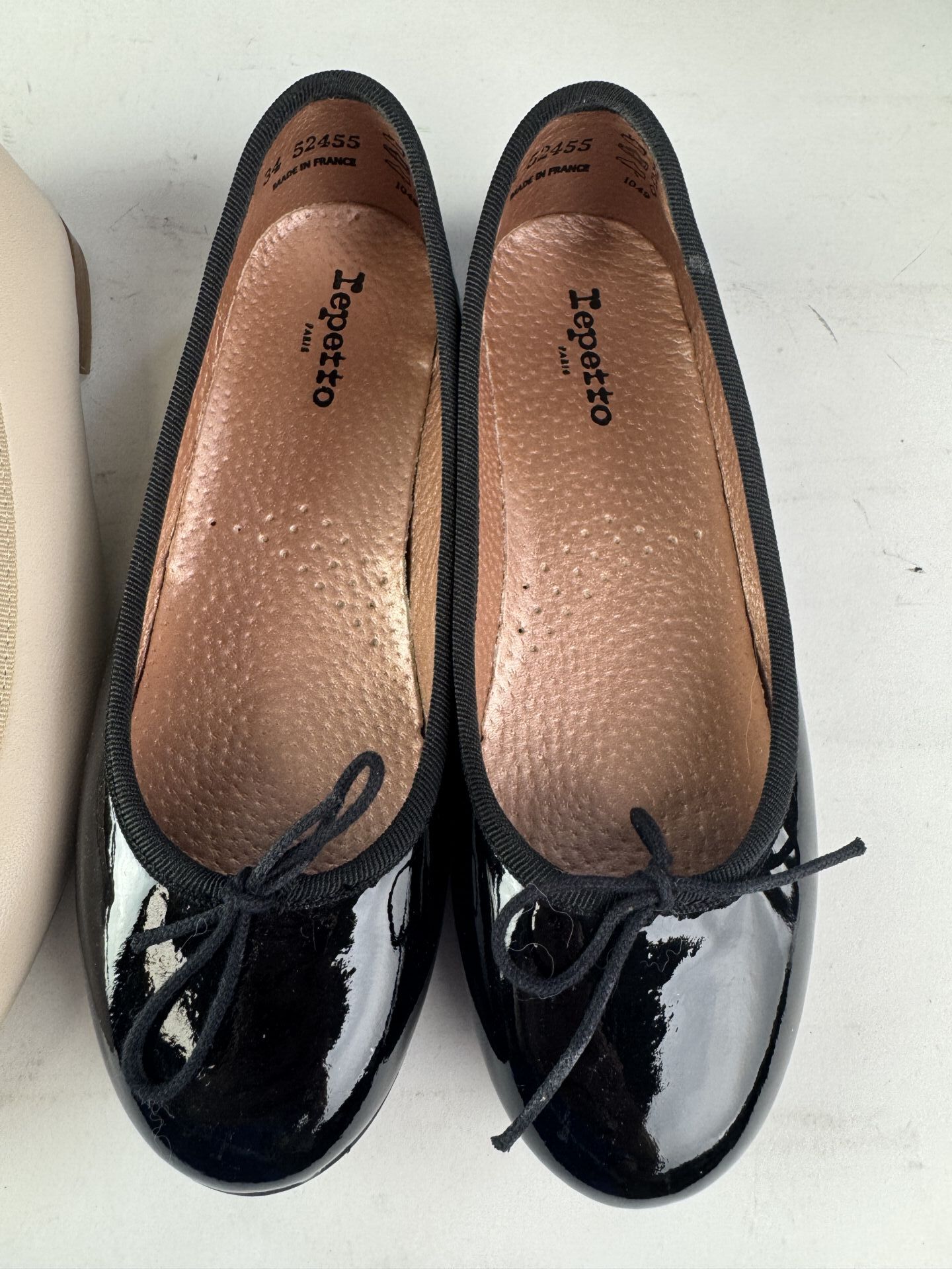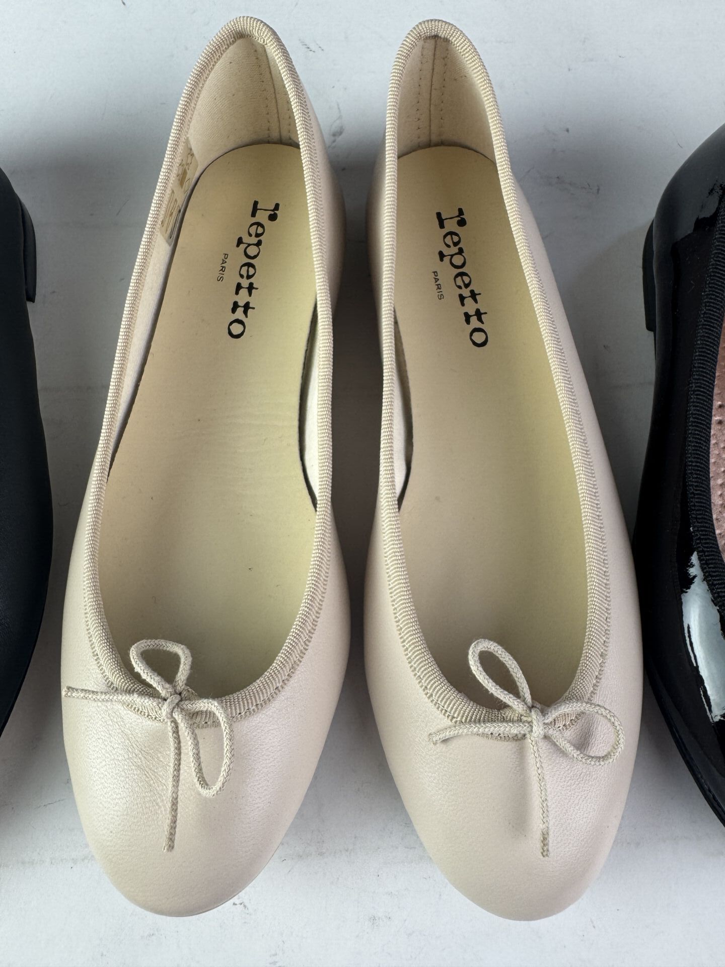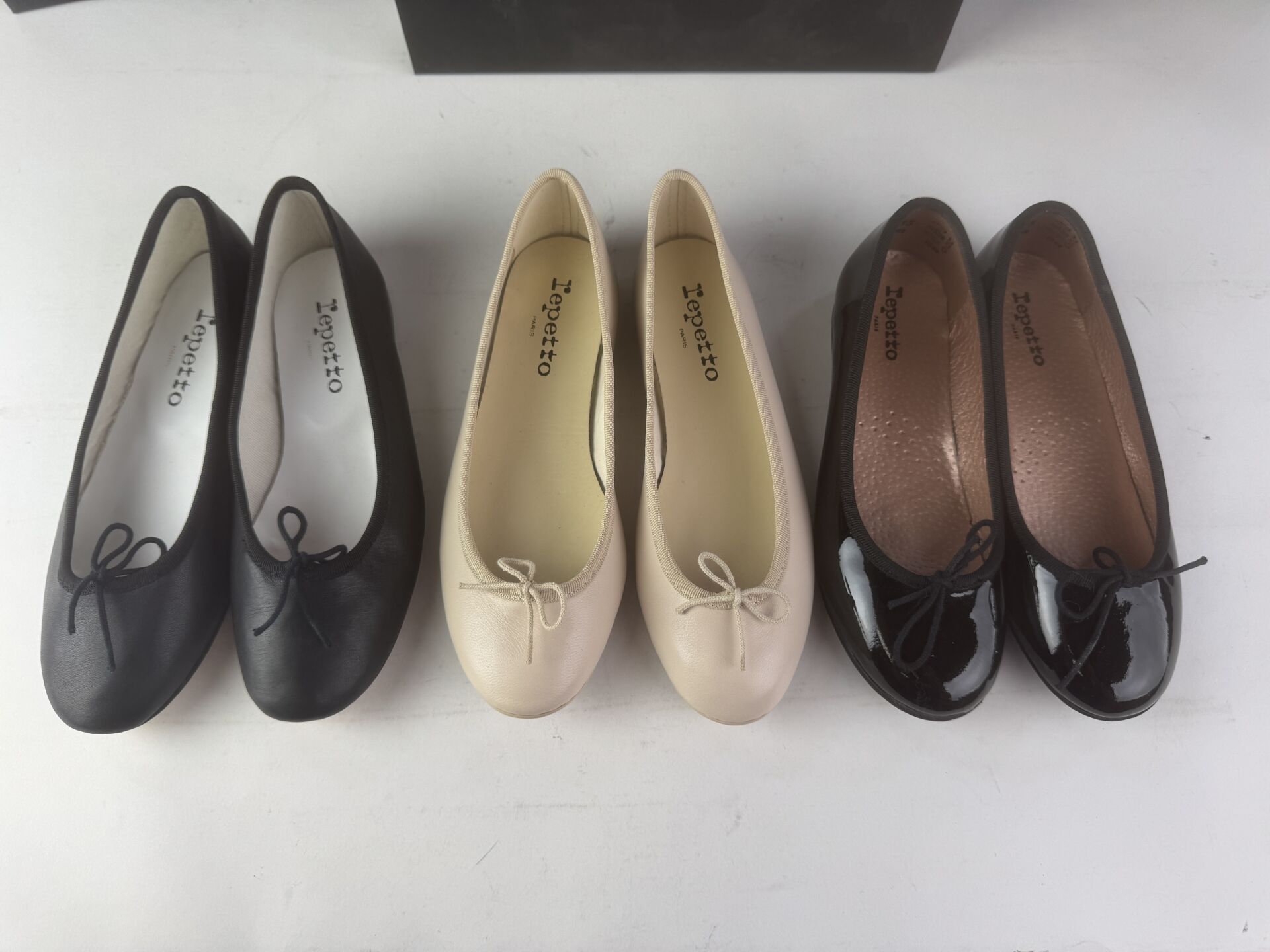 REPETTO - Ensemble de trois paires de ballerines, cuir beige, noir et noir venis. Pointures 37, 36,5 et 34 (Etat magasin, boites abimées)