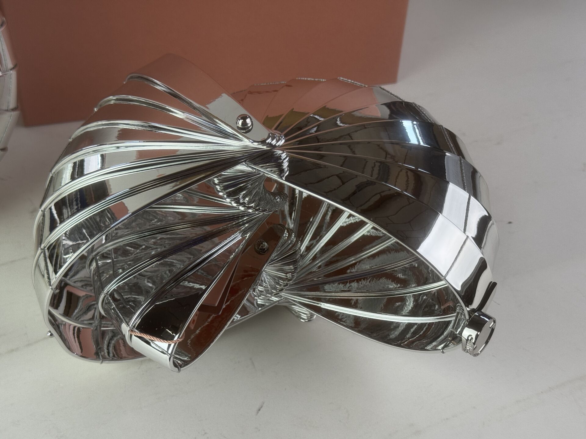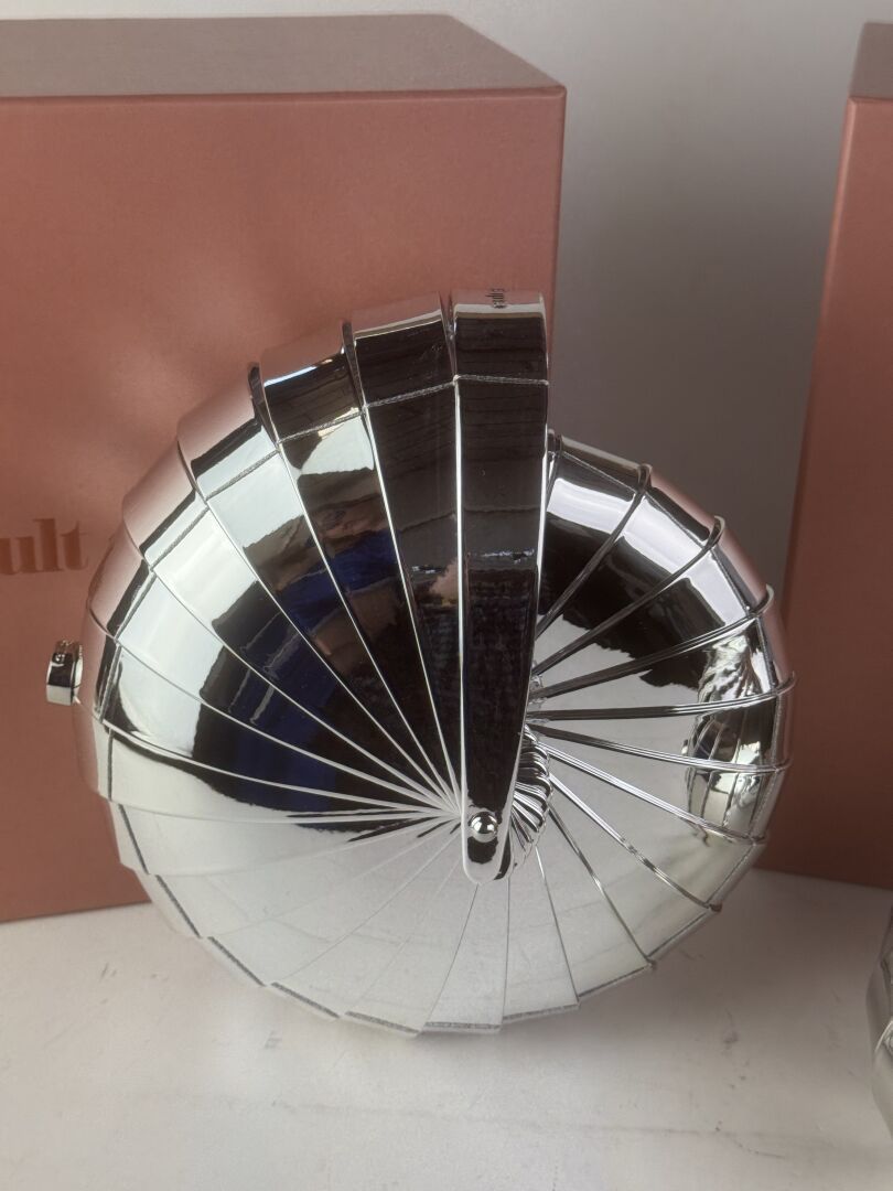 CULT GAIA - Lot de deux sacs de soirée, modèle "Sirena", forme coquillage plastique argenté. Diam. : 25 cm (Etat magasin)