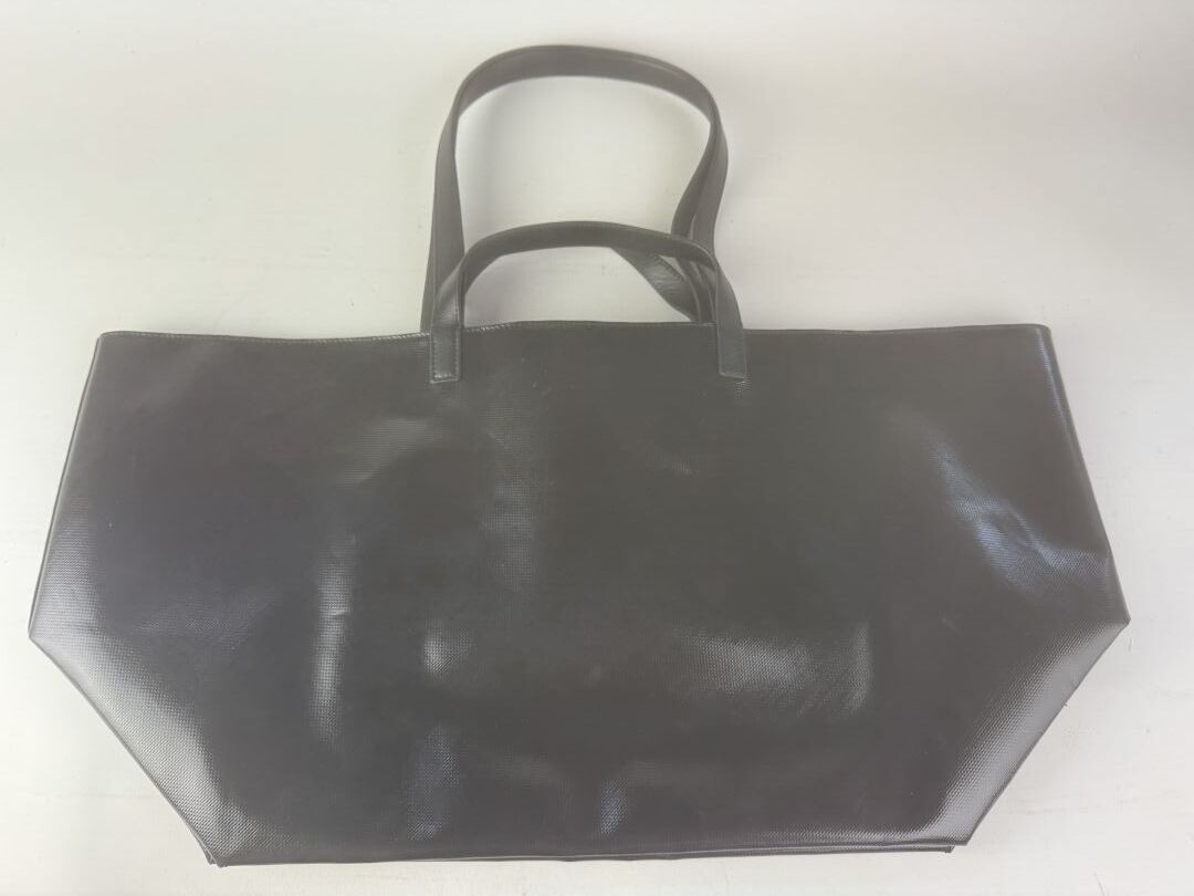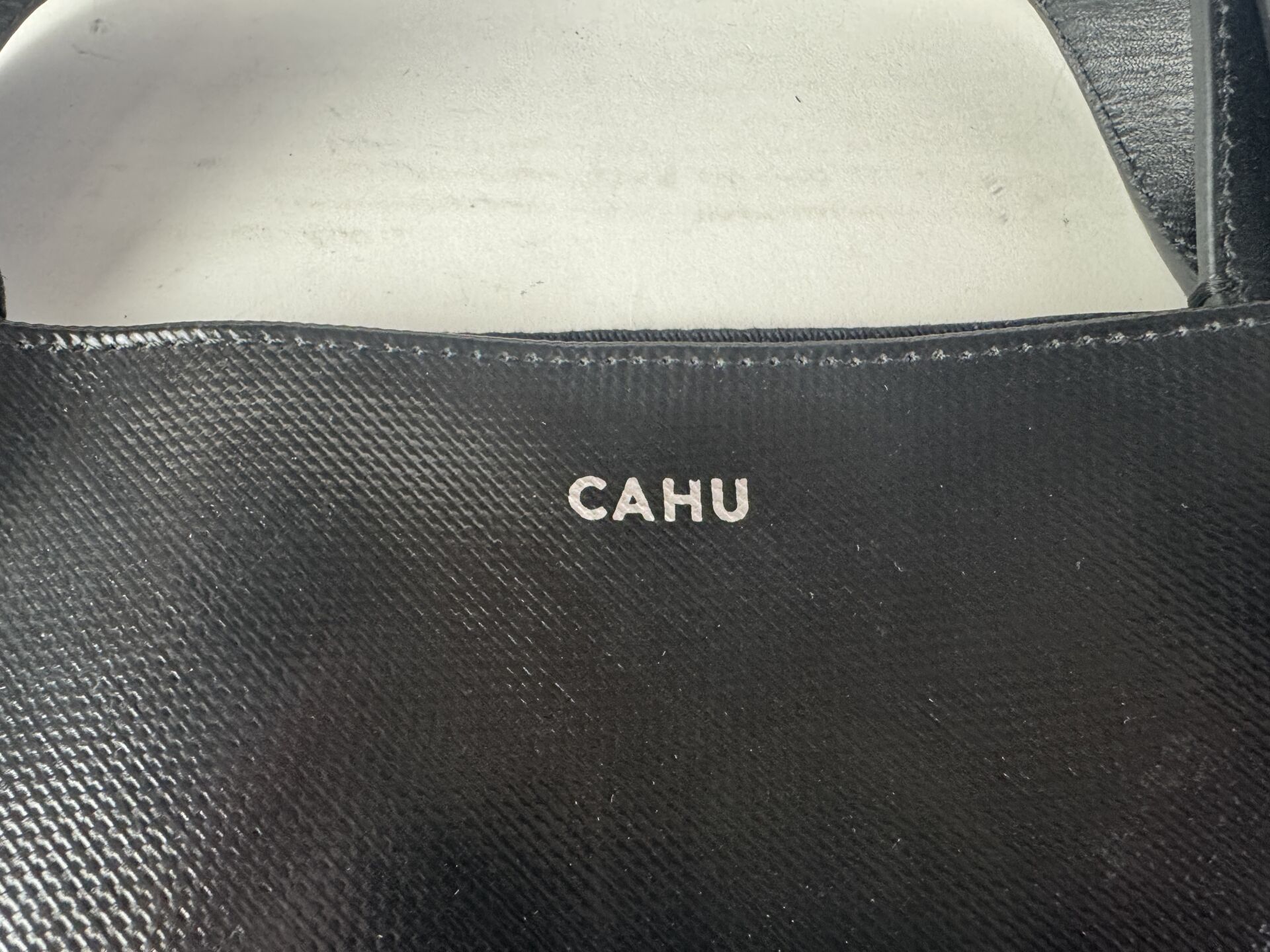 CAHU - Sac cabas toile PVC noir, quadrule anse cuir à la couleur, poche intérieure. Long. : 40 cm (Très bon état malgrè de très légères traces)