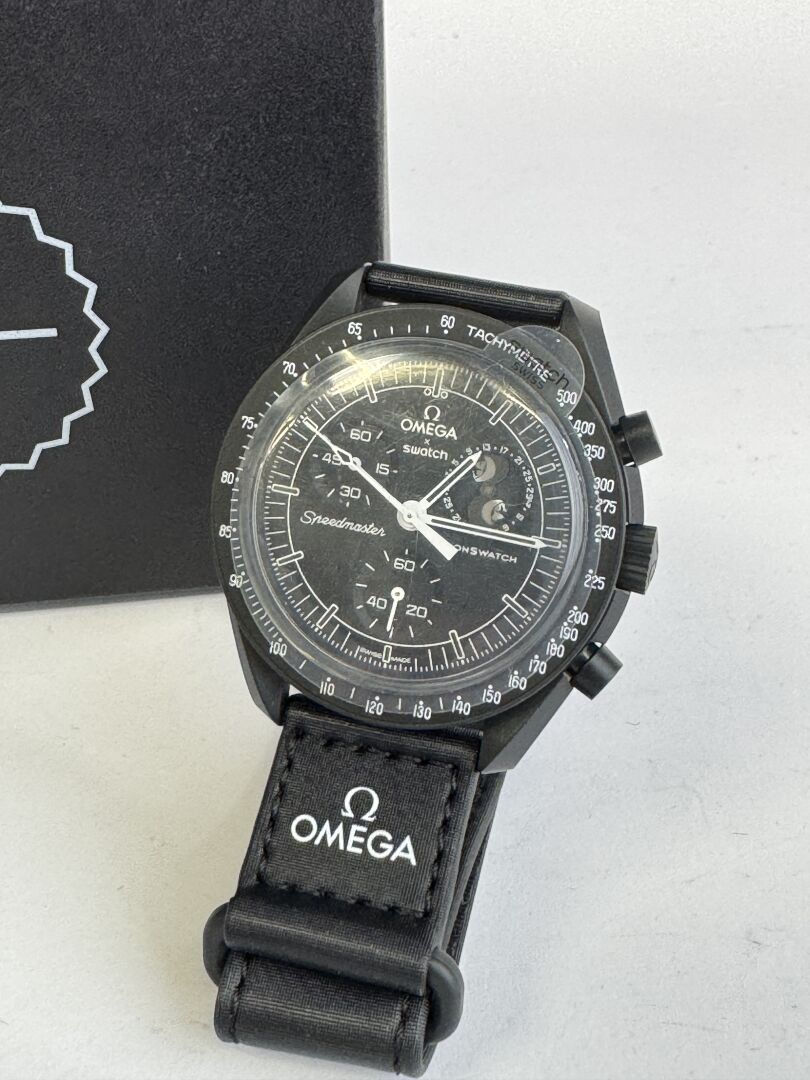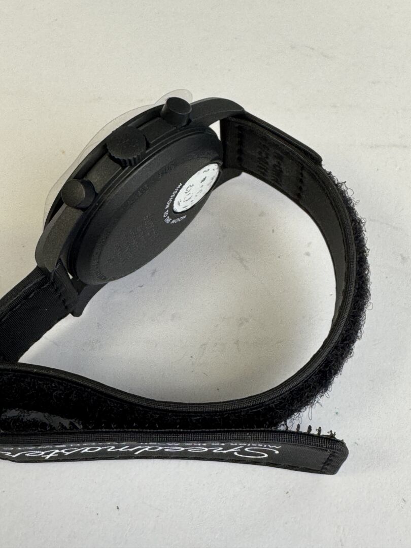 OMEGA x SWATCH - Mission to Moonphase - Montre en bio céramique à mouvement quartz. Boitier circulaire noir, lunette graduée, couronne cannelée, fond clipsé ; cadran noir, index bâtons, aiguilles droites, petite seconde à 6 heures, totaliseurs des minutes écoulées (sur 60 minutes) à 10 heures et des 1/10 de seconde à 2 heures. Bracelet en tissu noir, boucle en bio céramique. Accompagnée d'une surboite et boite. Diamètre : 4,1 cm Conditions de vente spécifiques : Veuillez noter que toutes les montres sont vendues en l'état. Aucune garantie n'est faite sur l'état de marche, une révision est donc conseillée. Certaines montres ont été ouvertes pour identifier le type et la qualité du mouvement, y compris les montres résistantes à l'eau, il est donc conseillé à l'acheteur de consulter un horloger pour revoir l'étanchéité de la montre.
