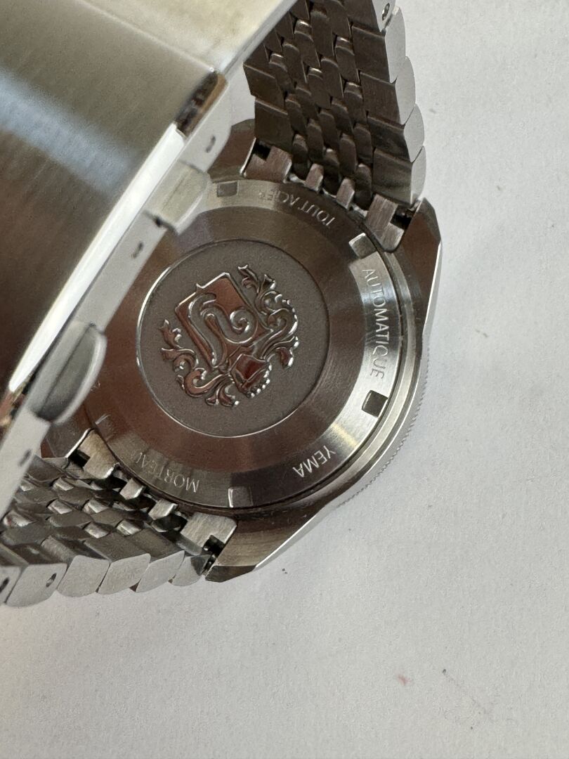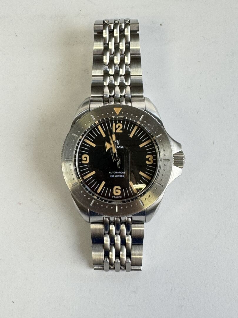 YEMA - Montre homme, cadran circulaire, acier, fond noir, index chiffres arabes et bâtons, lunette graduée tournante, mouvement automatique, bracelet acier, boucle déployante. Etui et boite. Diam. : 4 cm (maille supplémentaire) Conditions de vente spécifiques : Veuillez noter que toutes les montres sont vendues en l'état. Aucune garantie n'est faite sur l'état de marche, une révision est donc conseillée. Certaines montres ont été ouvertes pour identifier le type et la qualité du mouvement, y compris les montres résistantes à l'eau, il est donc conseillé à l'acheteur de consulter un horloger pour revoir l'étanchéité de la montre.