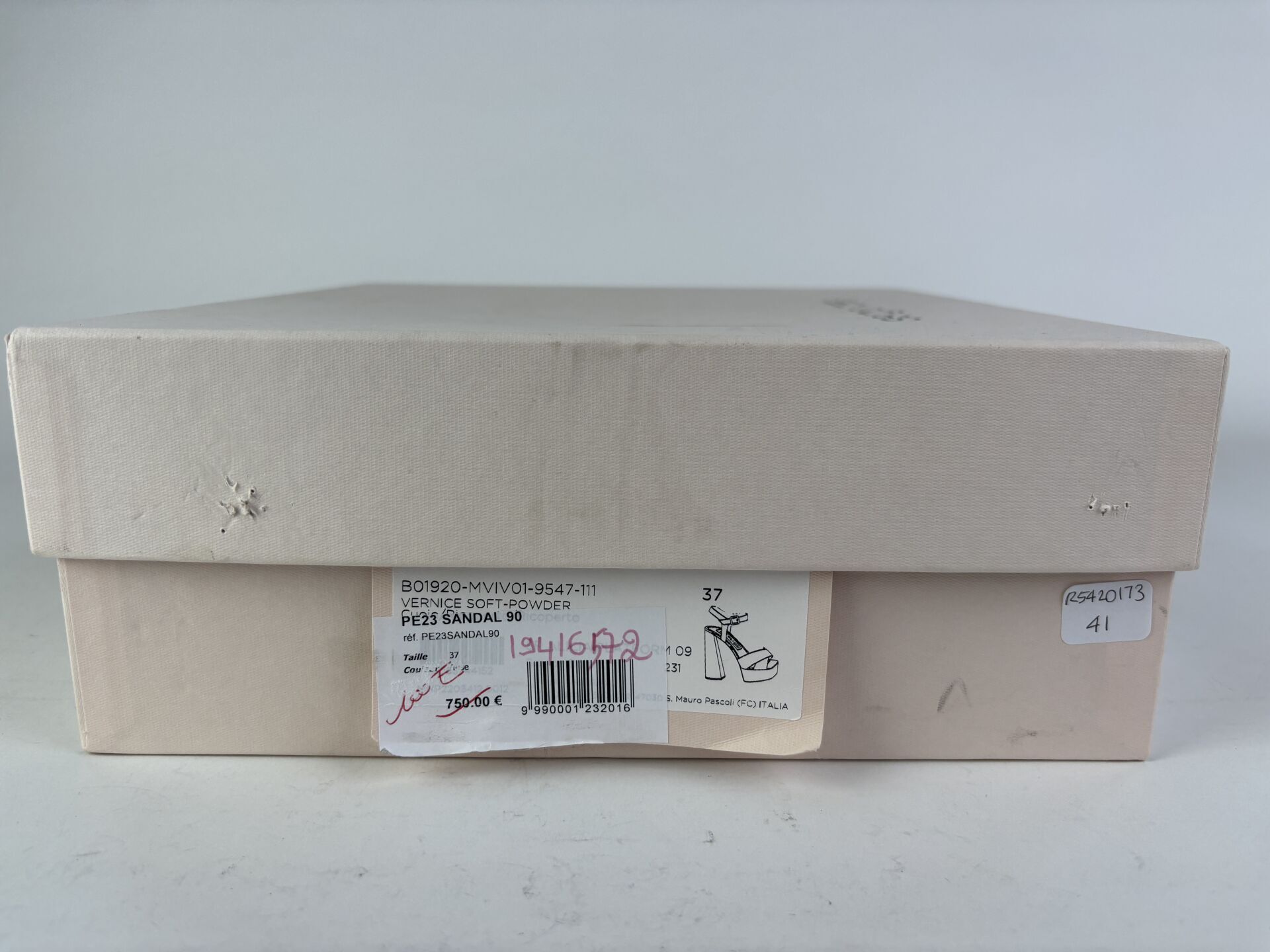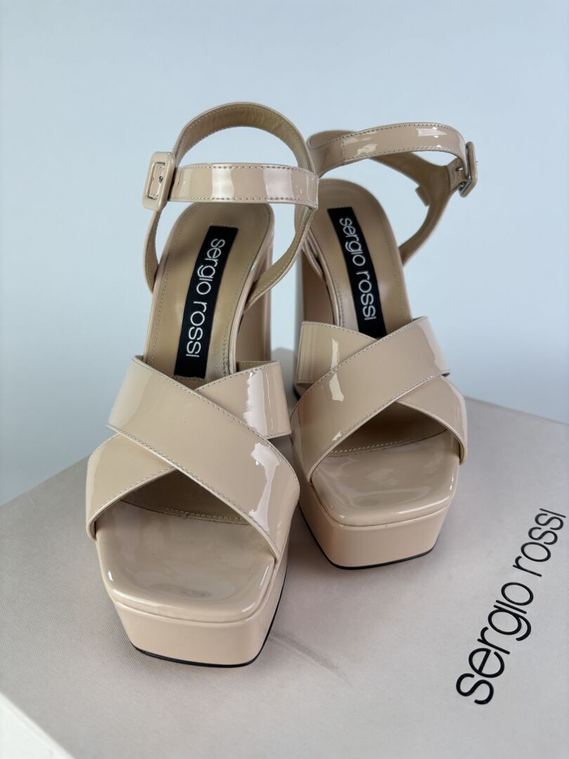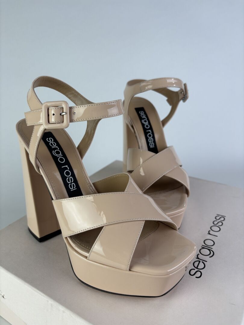 SERGIO ROSSI - Paire de sandales à talons, plateforme, cuir verni beige. Pointure 37 - Haut. du talon : 12,5 cm (très bon état)