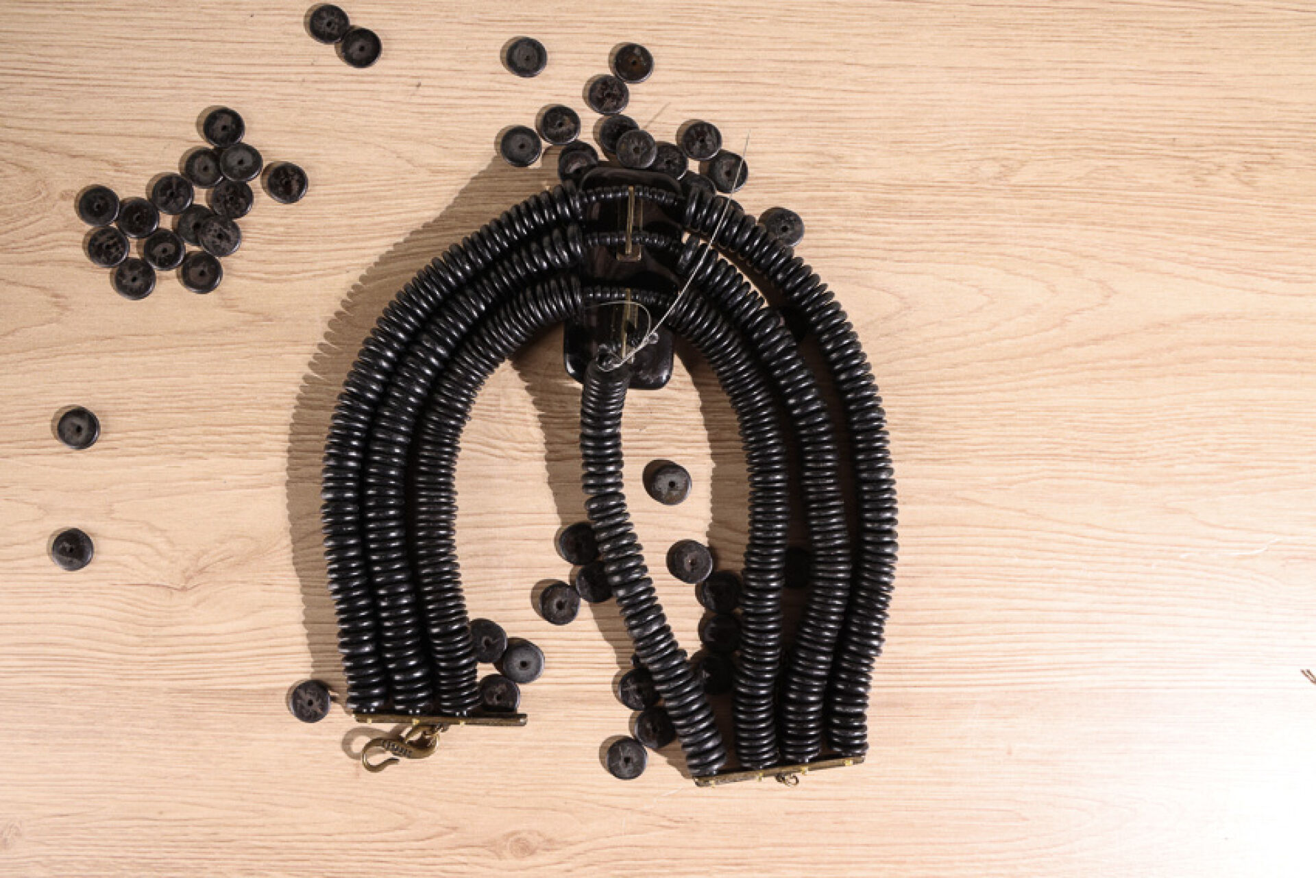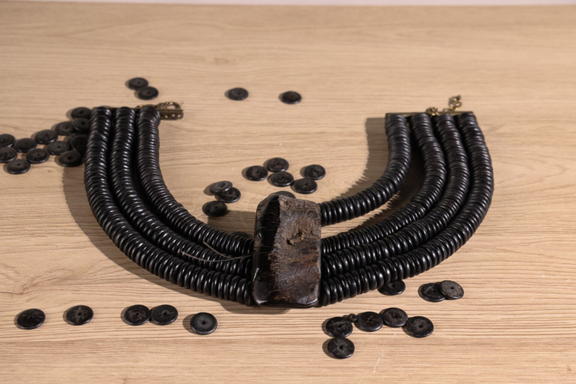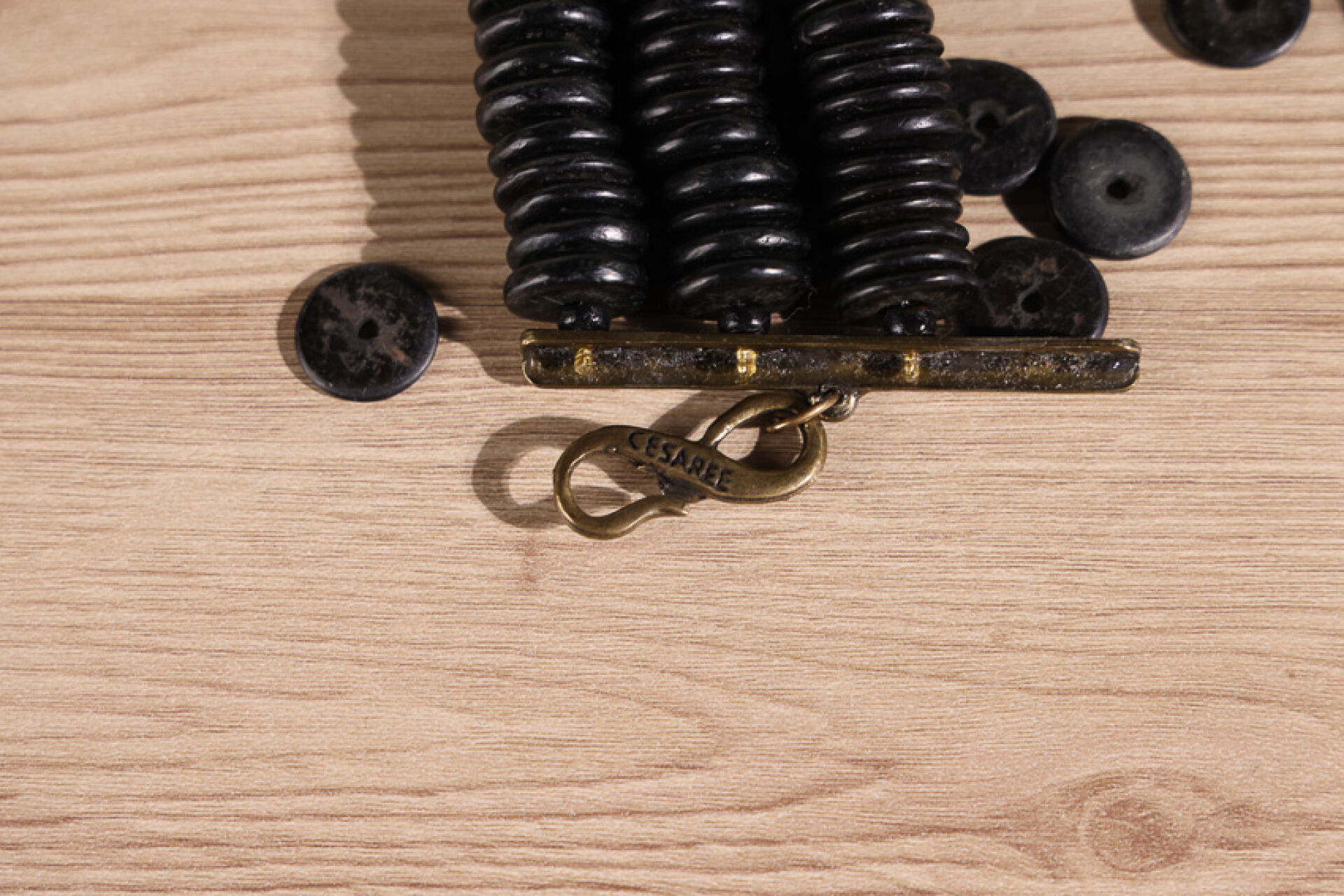 CESAREE. Important collier à 4 rangs de perles de plastique noir retenues au centre par une importante résine marron brute découpée. Signé sur le fermoir (un rang à renfiler)