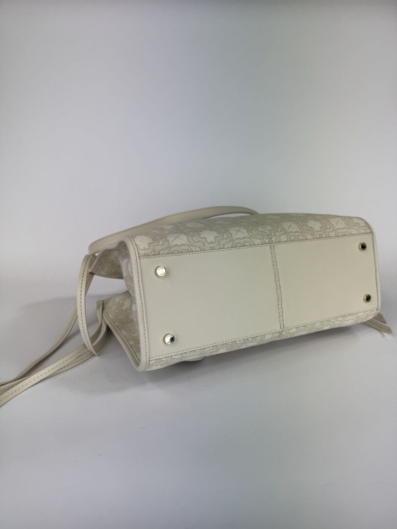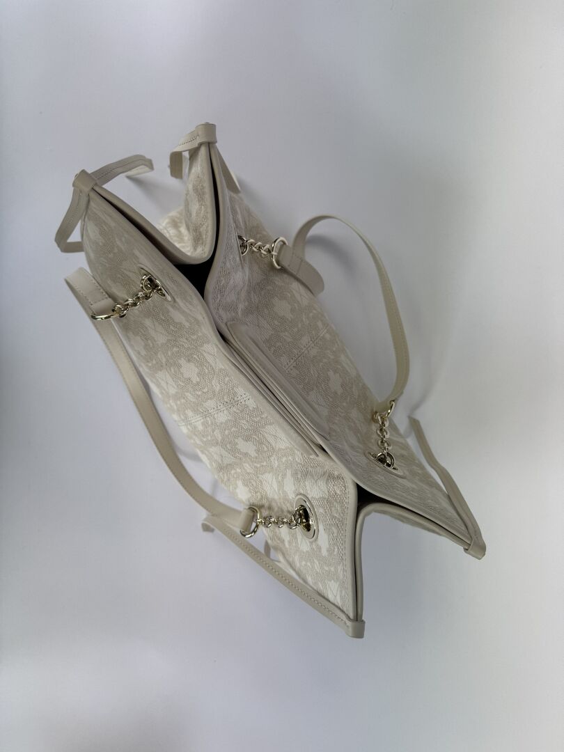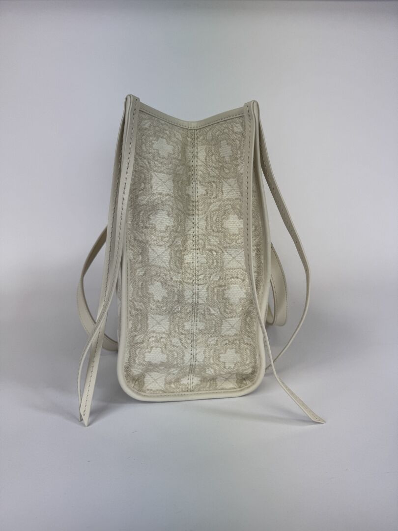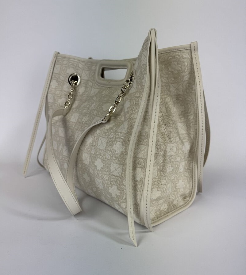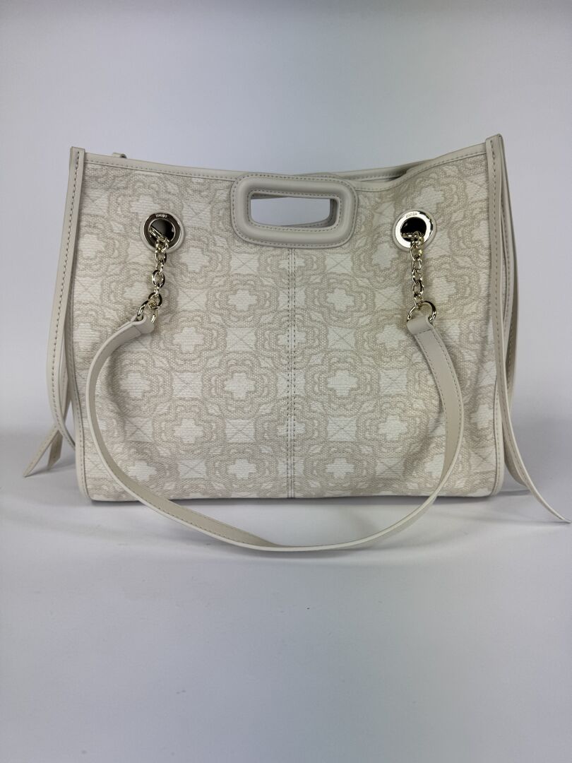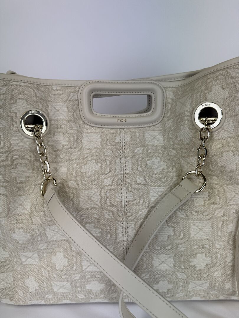 MAJE - Sac cabas modèle "Clover", toile blanche et écru et cuir blanc, double anse cuir et chaine métal doré, fermeture aimantée, franges. Long. : 37,5 cm (très bon état)
