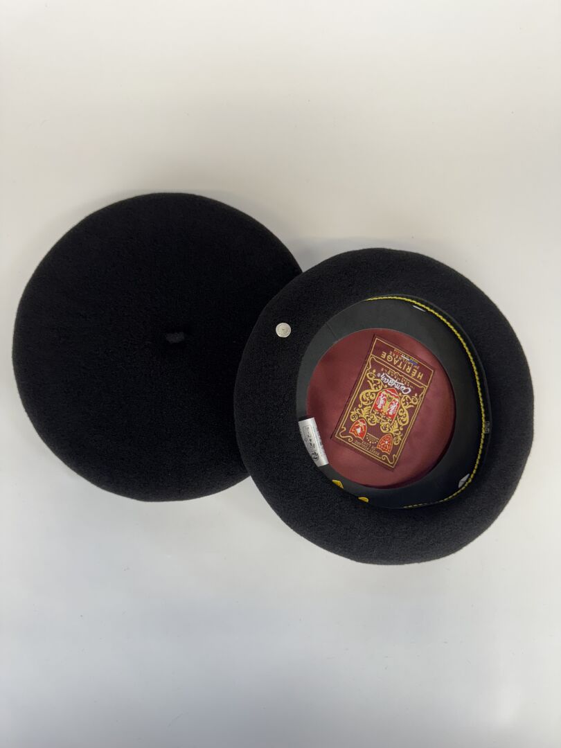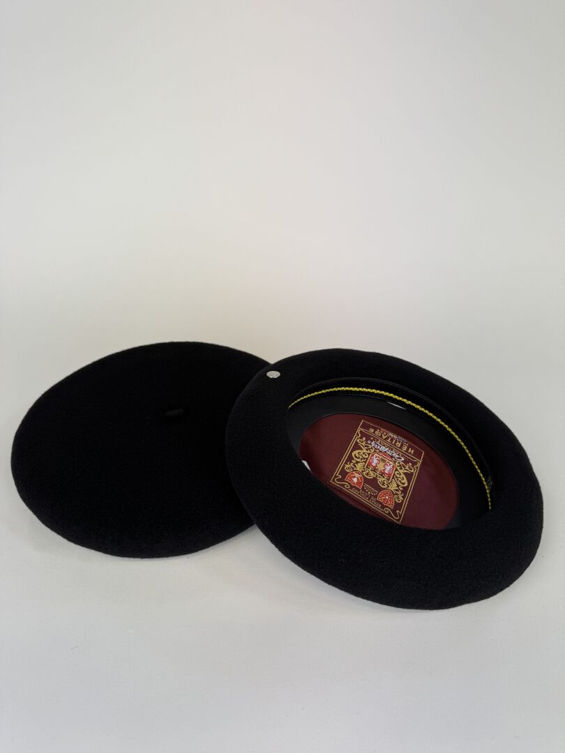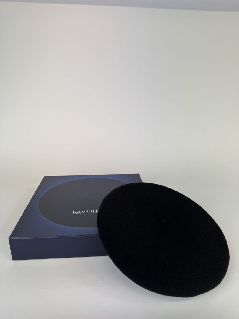 LAULHERE - Ensemble de deux bérêts modèle "Campan", laine noire et doublure en soie lie de vin. Dans leur boite Tailles 54 et 58 Etat magasin