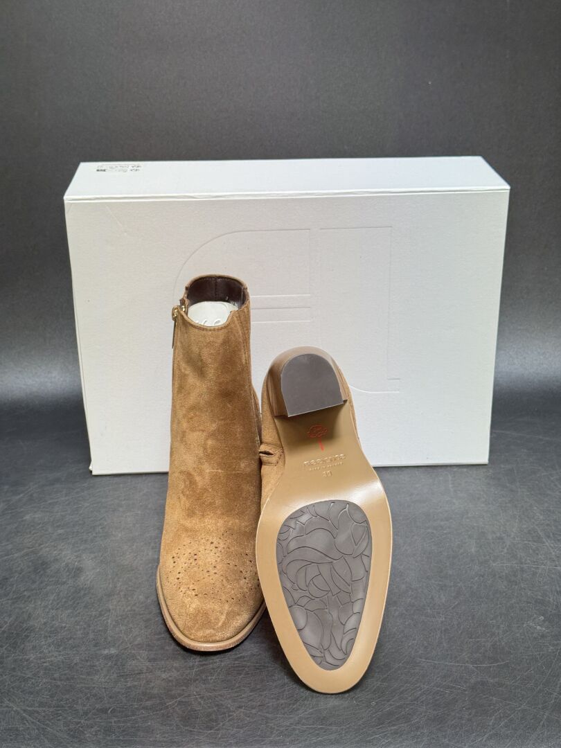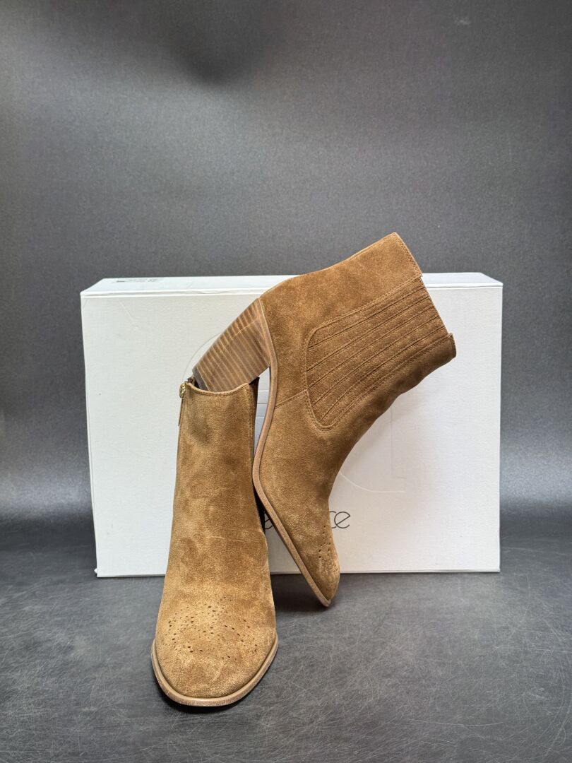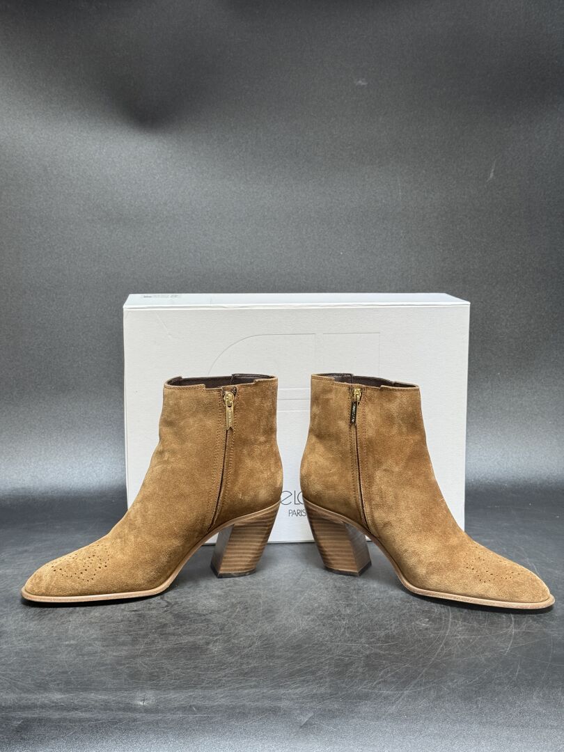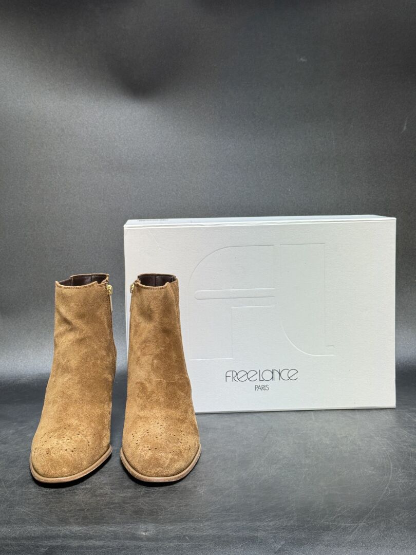 FREELANCE - Paire de bottines à talon en cuir velours noisette, fermeture latéral zip, perforé à l'avant. Pointure 39 - Haut. Du talon : 7,5 cm Etat magasin