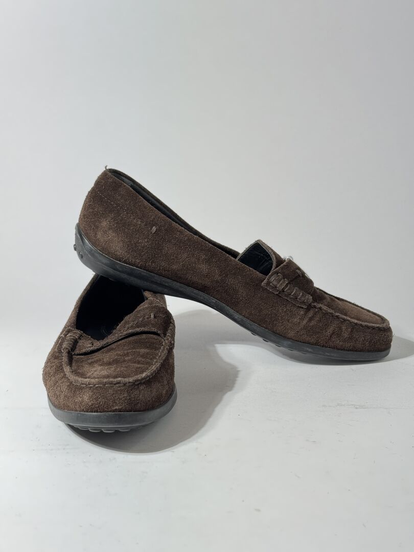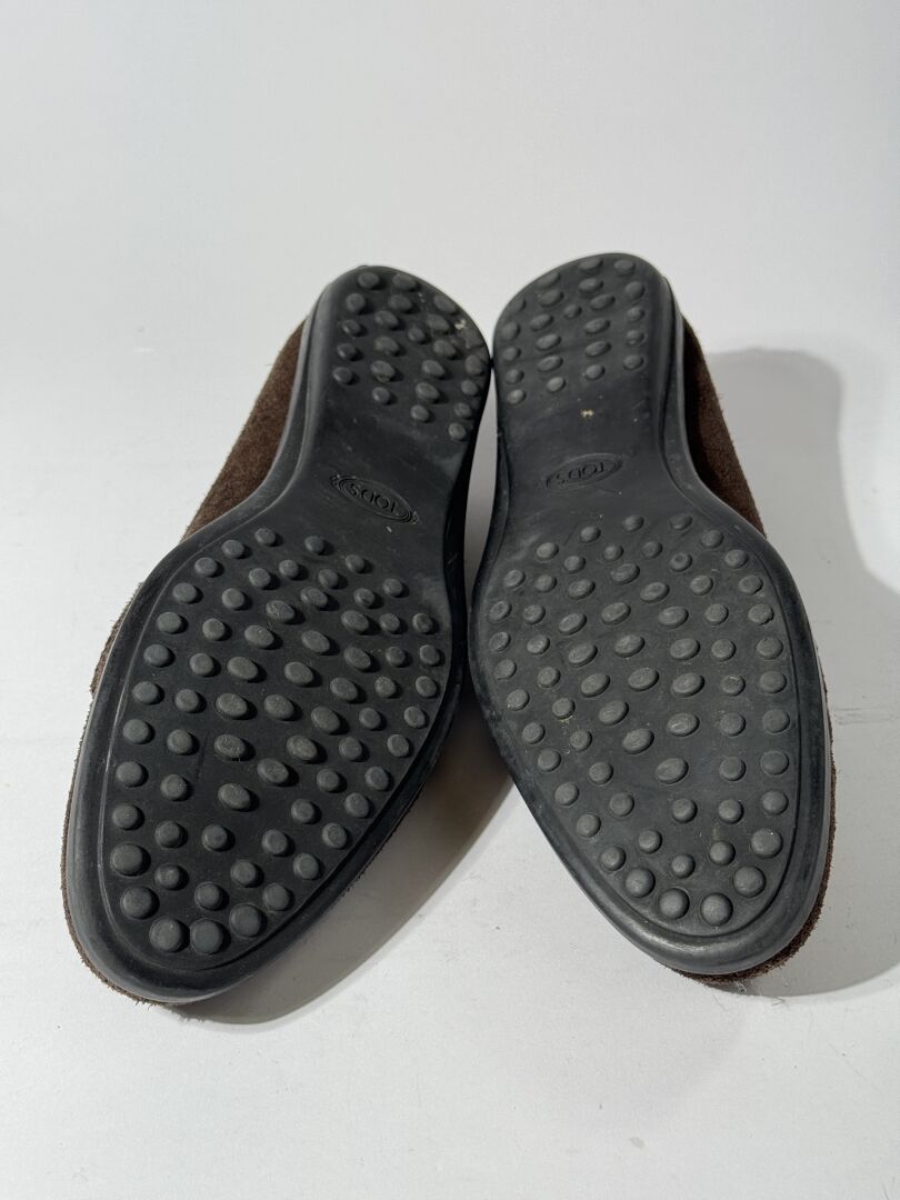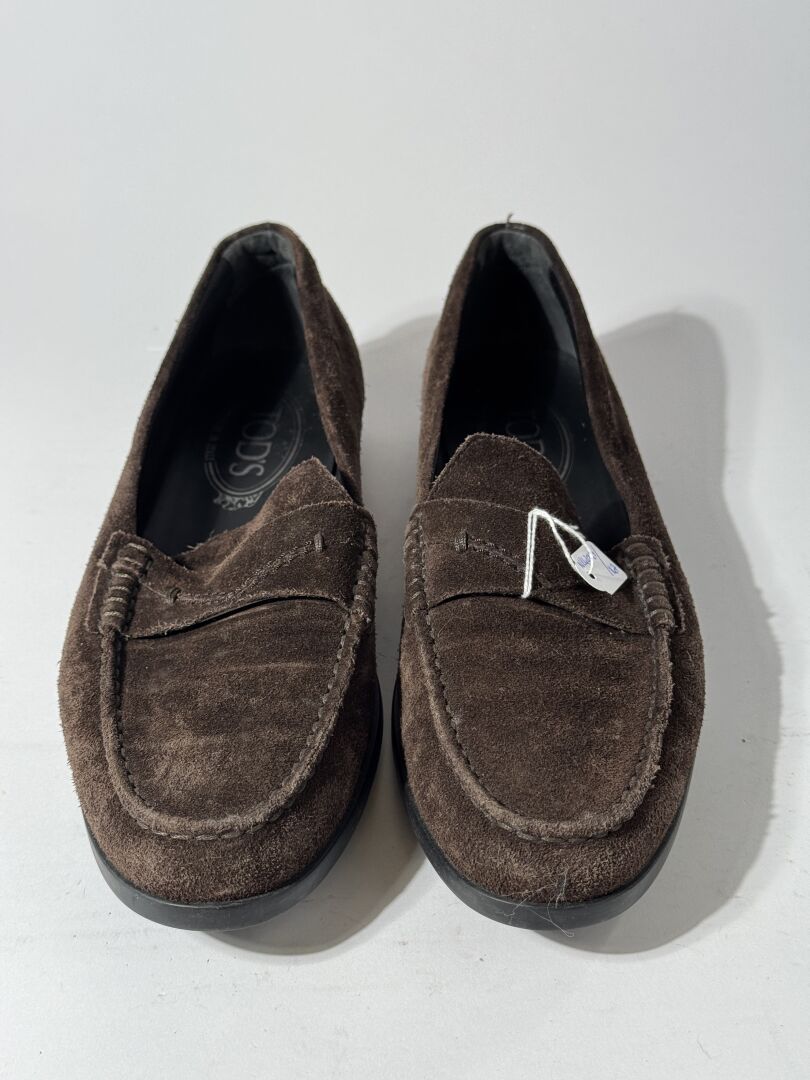 TOD'S - Paire de mocassins en cuir daim chocolat, semelles à crampons. Pointure 37,5 (déjà portées, bon état général)