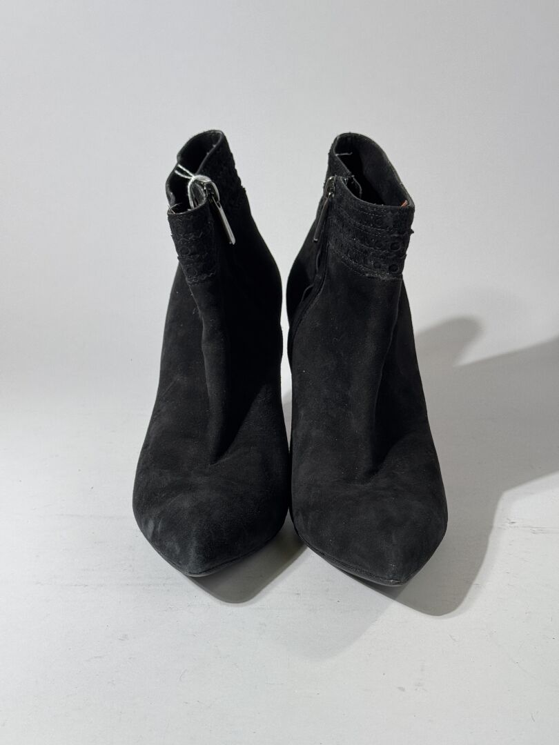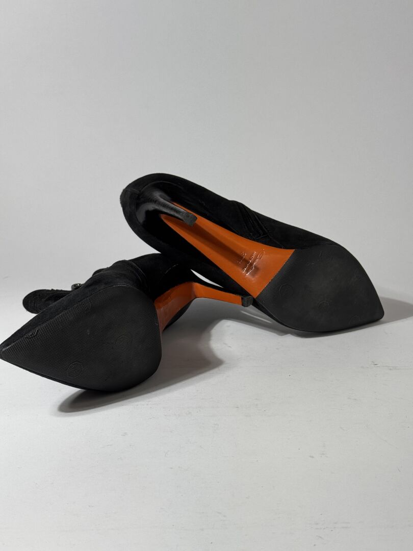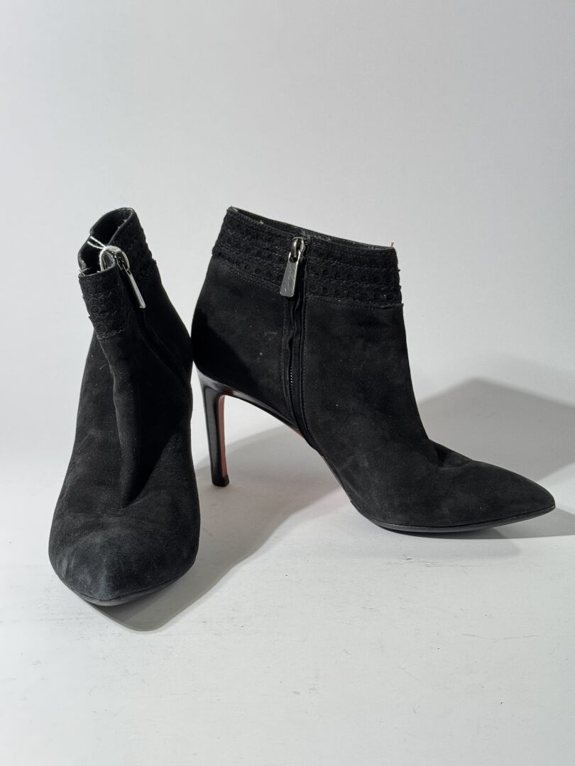 SANTONI - Paire de bottines basses à talon, fermeture latérale, cuir retourné noir. Pointure 37,5 - Haut du talon : 7,5 cm (semelle topy, déjà portées, bon état général)