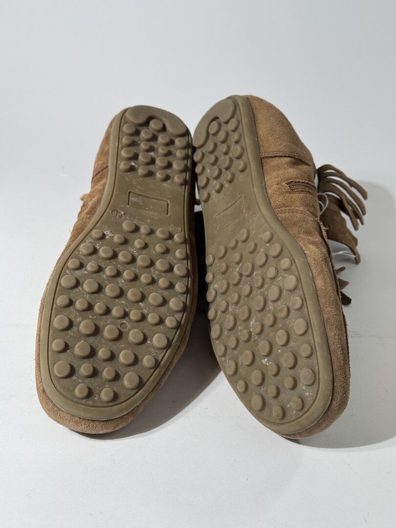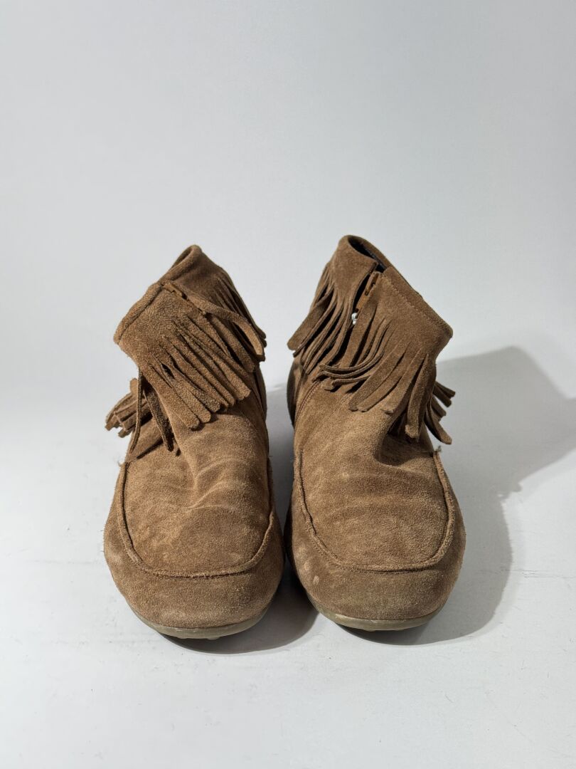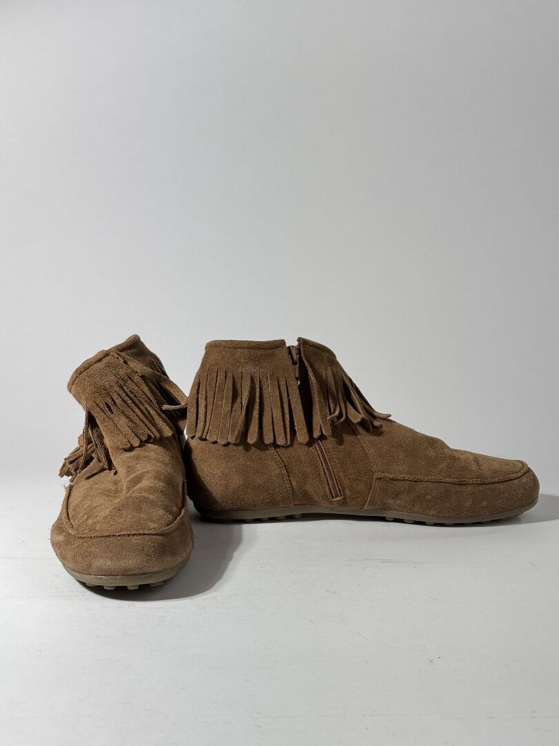 REQUINS - Paire de souliers en daim fauve et franges, fermeture latérale zip. Pointure 38 (déjà portés, bon état général)