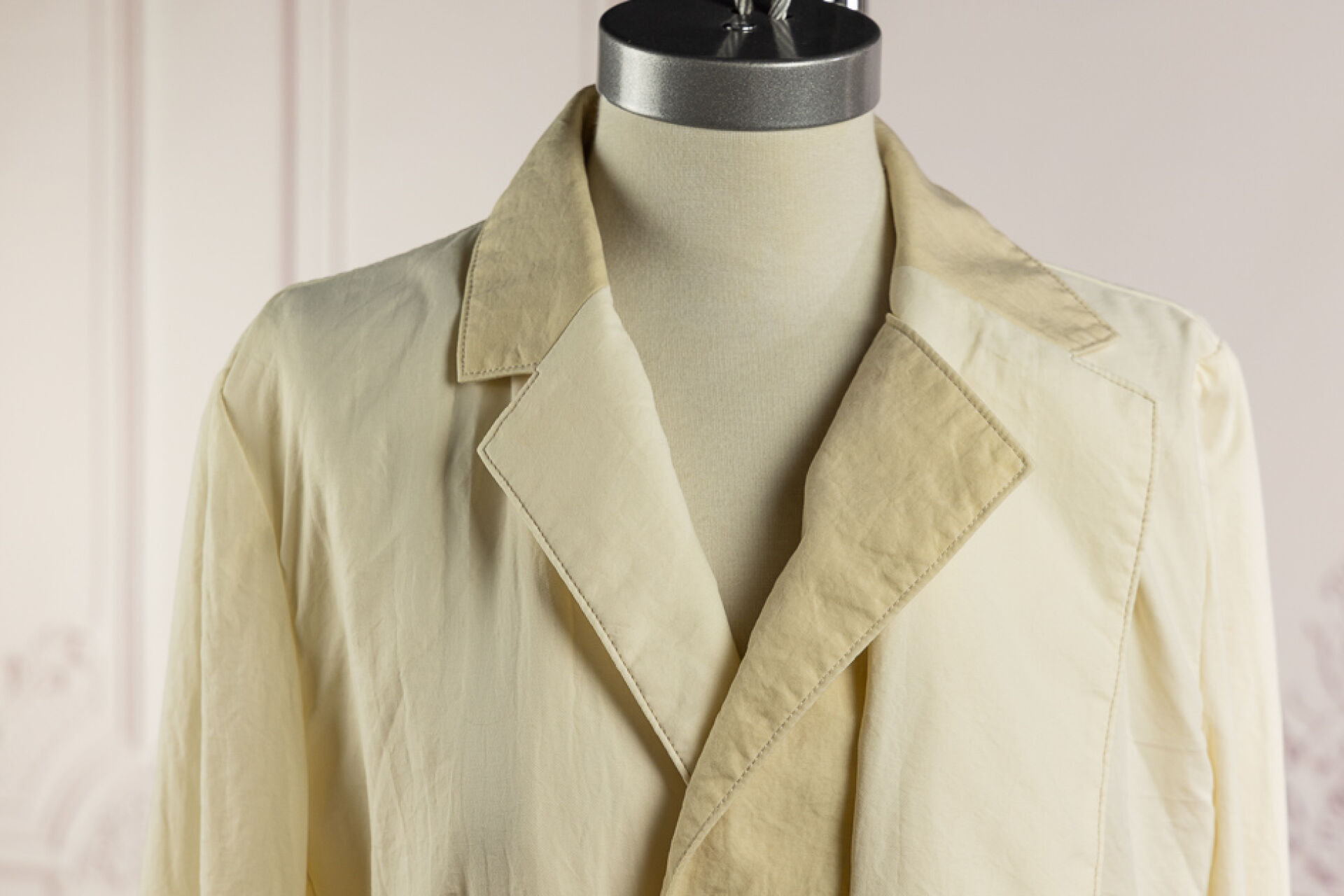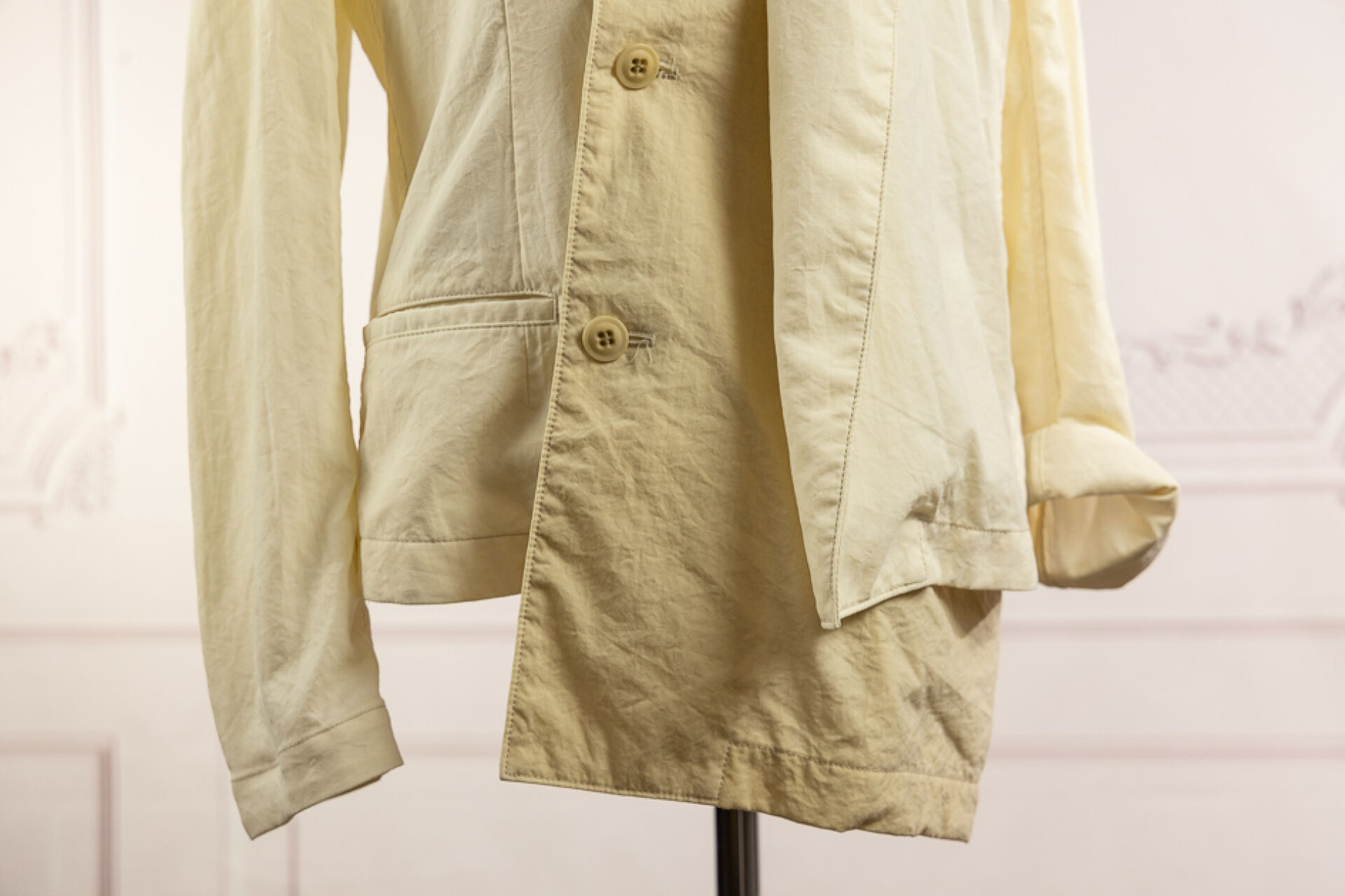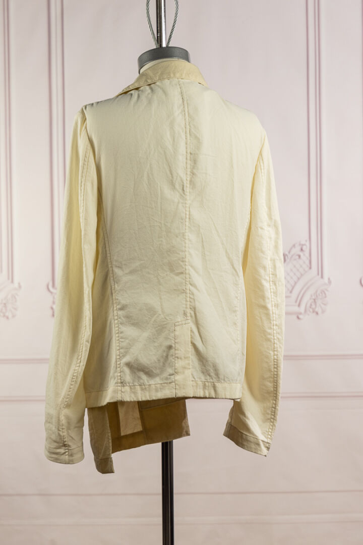 Y's. Veste ivoire et beige à effet "déglingue" par un double pan à poche coté gauche en superposition, cols crantés, manches longues, simple boutonnage, fente dos. Taille supposée 2.