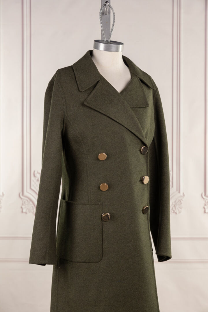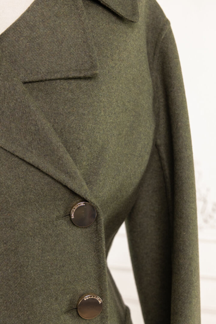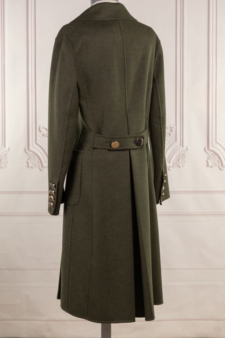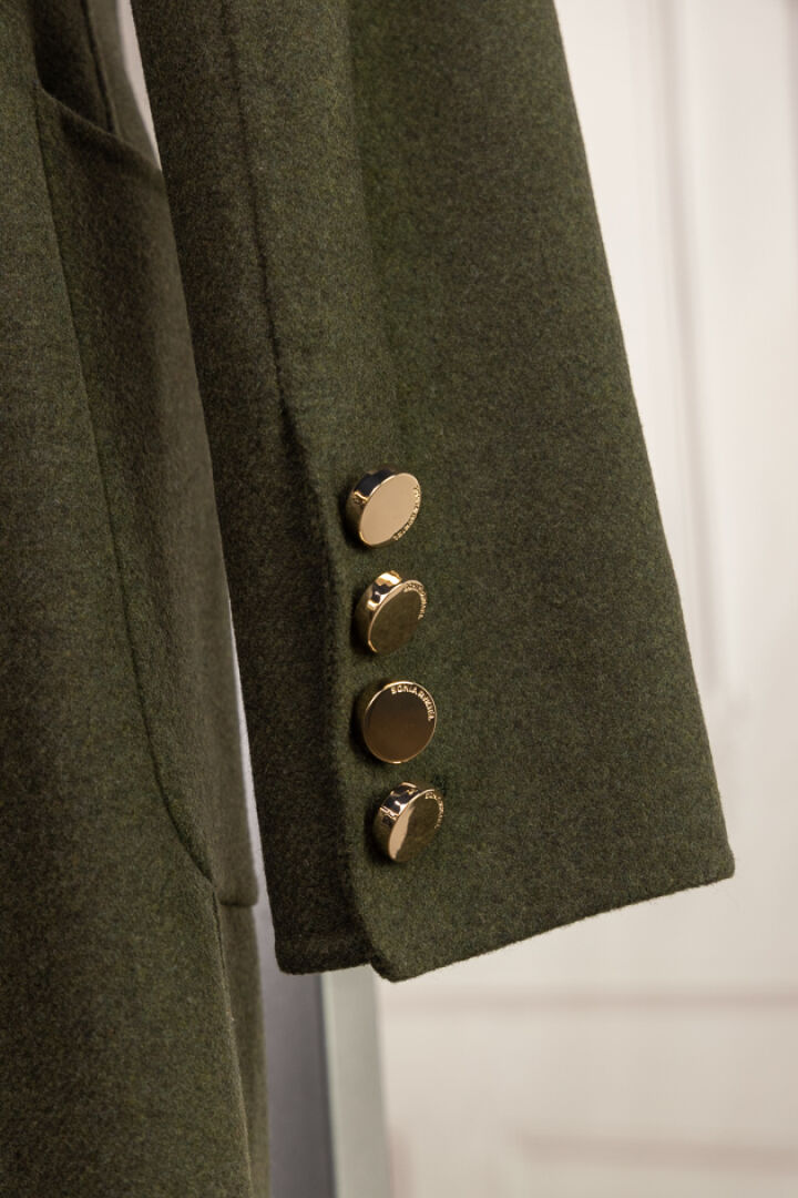 SONIA RYKIEL. Manteau en drap kaki chiné, large col cranté, double boutonnage à boutons dorés, manches longues, deux poches plaquées, martingale sur pli creux au dos. Taille 36. Non porté, étiquette d'origine.
