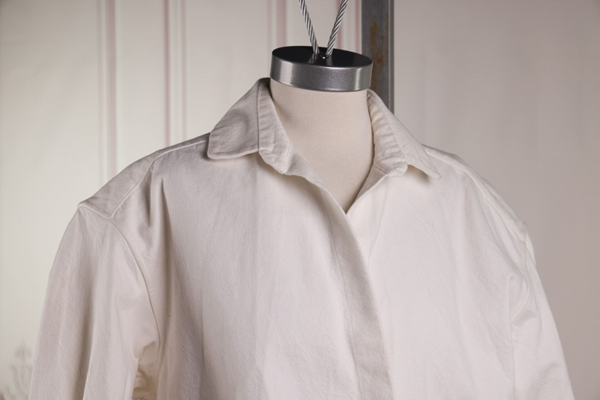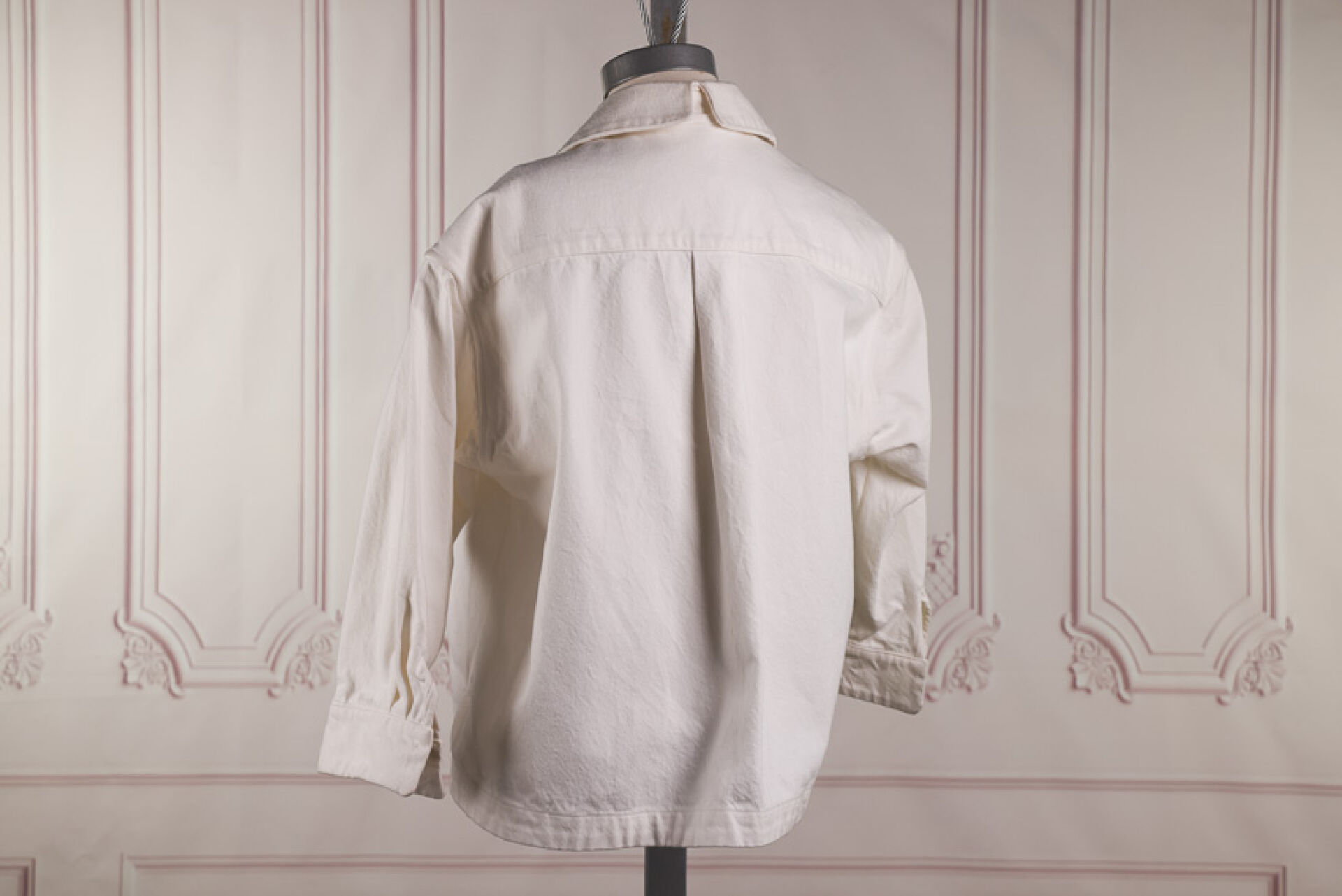DANIELA GREGIS. Veste en denim blanc à petit col sans boutonnage manche longues, plis creux au dos. Taille supposée M (taches)