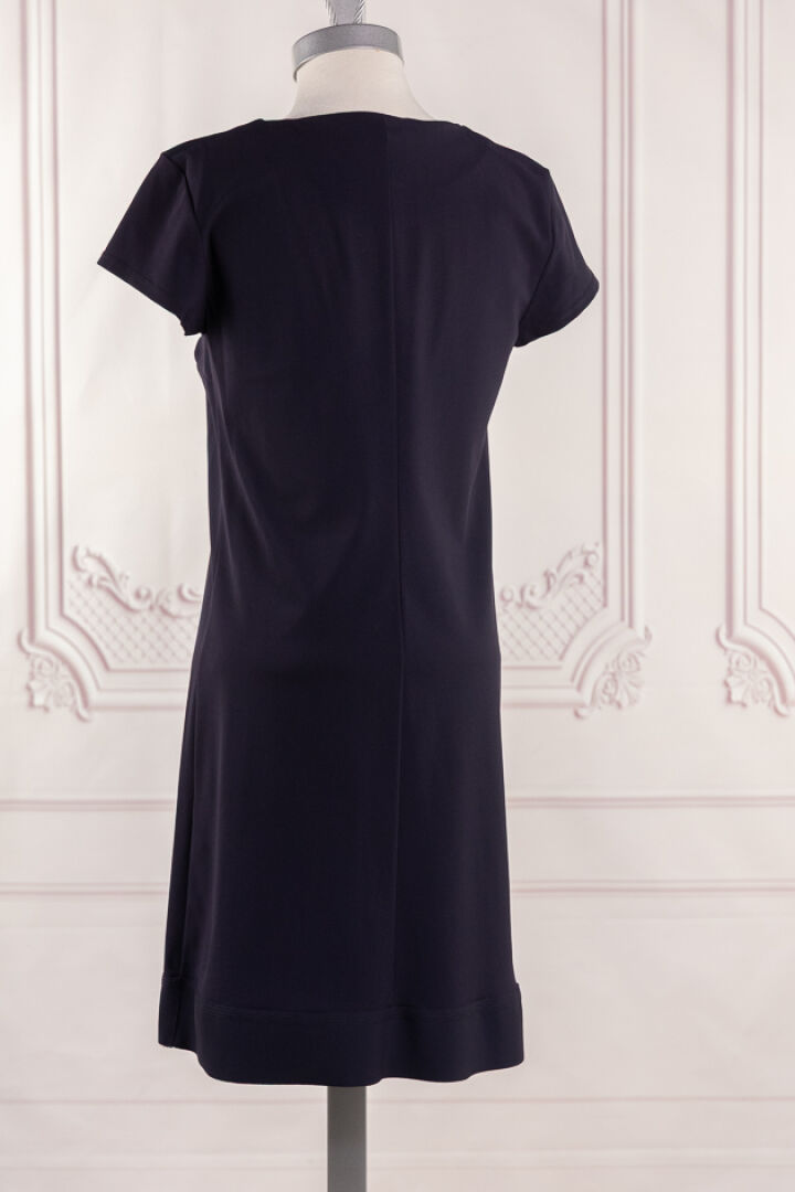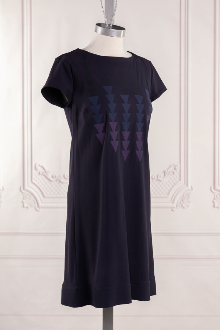 MARITHE + FRANCOIS GIRBAUD - Robe tunique en polyamide violet à motif de frise en dégradé devant, encolure ronde, manches courtes. Bel état malgré quelques bouloches. Taille 38