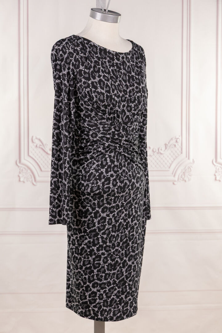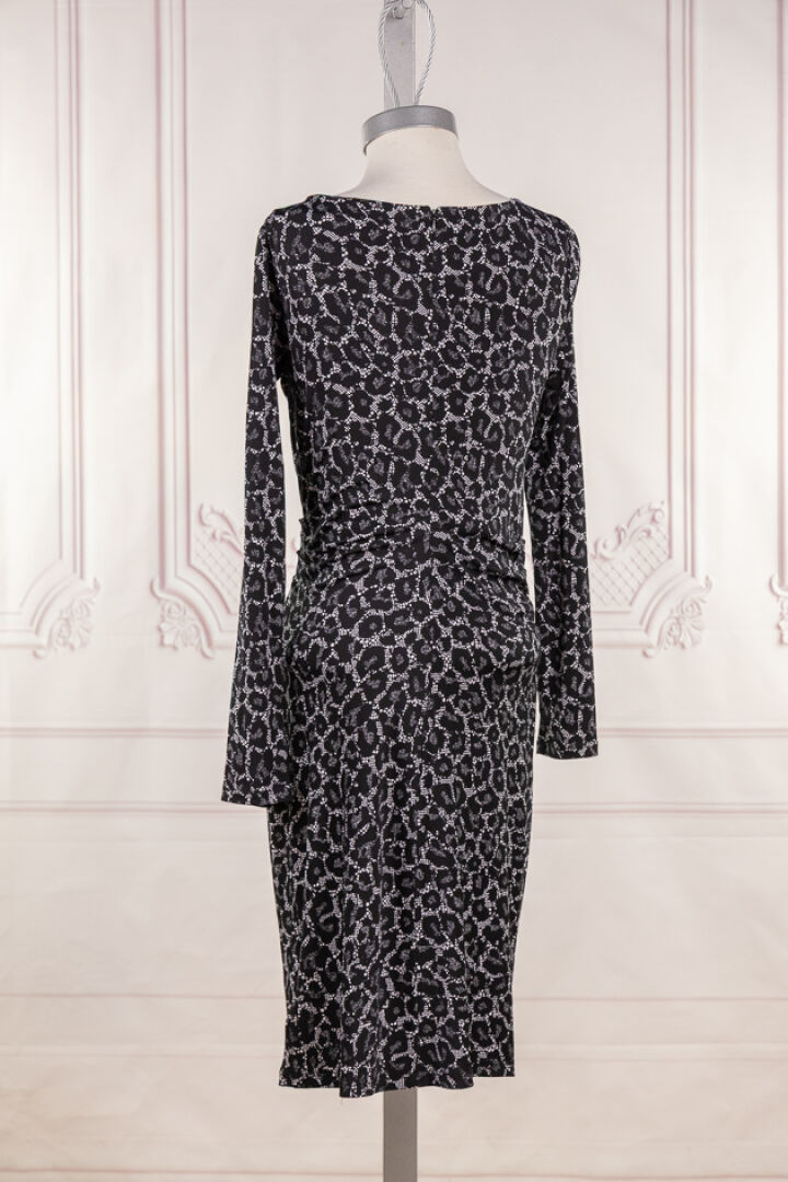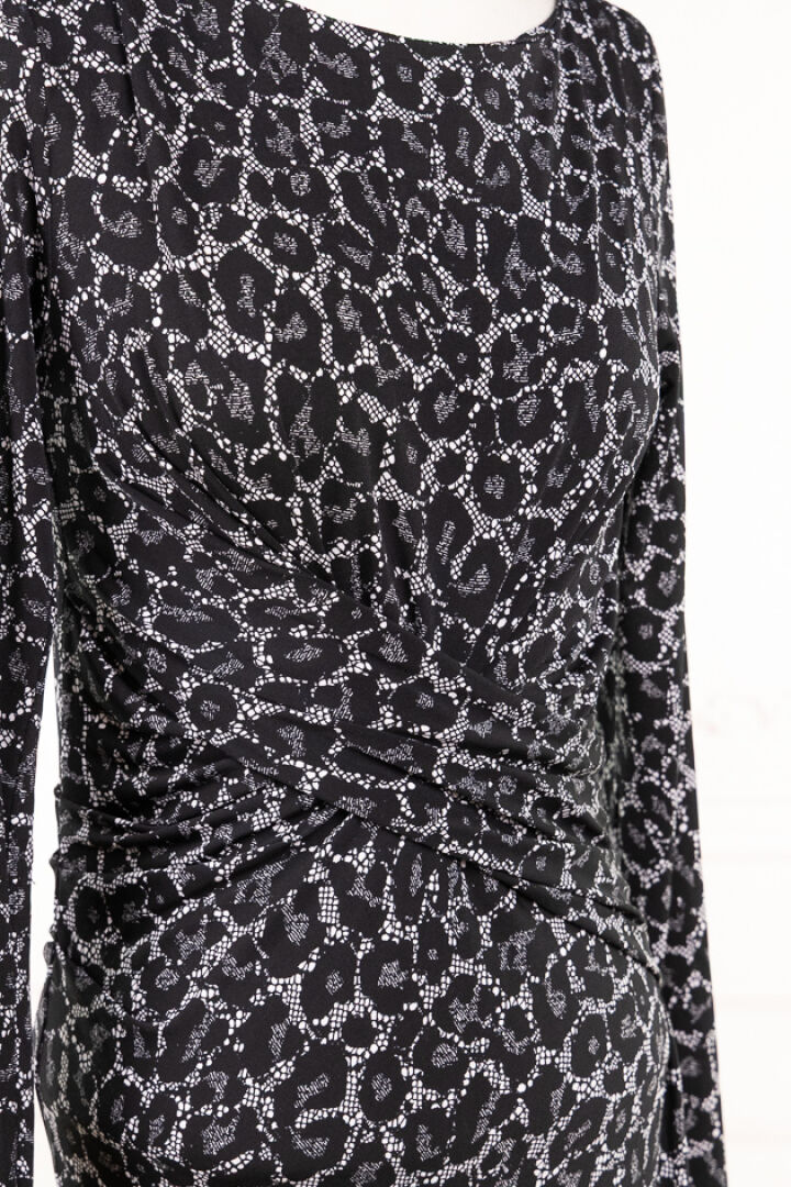 MICKAEL KORS - Robe mi-longue, manches longues, polyester noir et blanc, drapée à motif trompe l'œil dentelle, fermeture zip dos. Taille S
