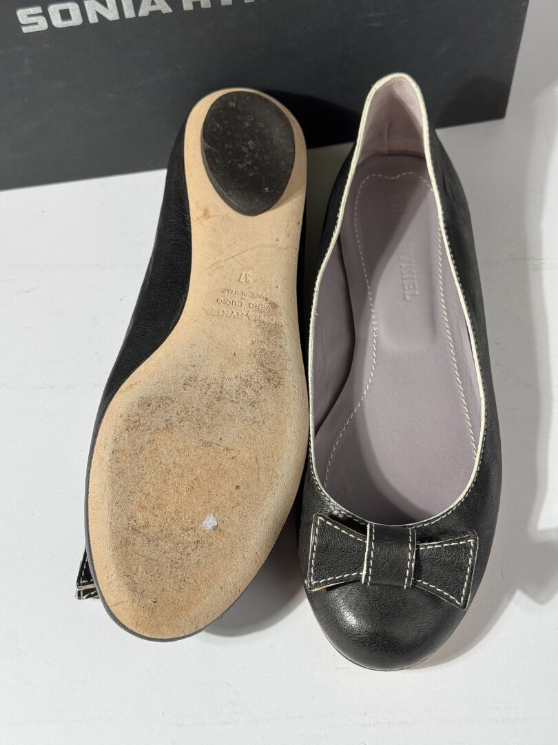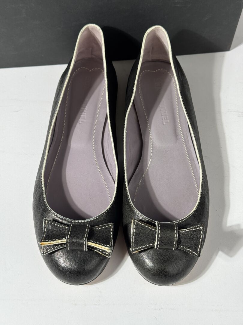 SONIA RYKIEL - Paire de ballerines en cuir souple noir, surpiqures blanches, empeignes rehaussées d'un nœud stylisé. Dans leur boite. Pointure 37 (déjà portées)