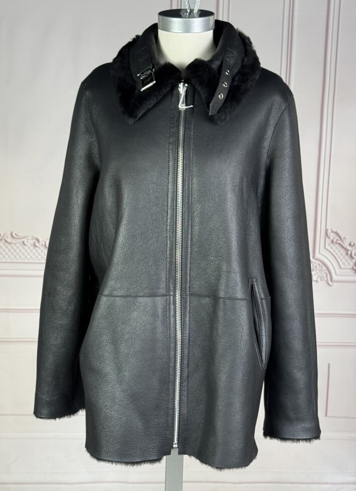 CLAUDIE PIERLOT - Veste réversible mi longue, coupe droite, en cuir et fausse fourrure noire, fermeture zip, deux poches, col. Taille 42 Etat magasin