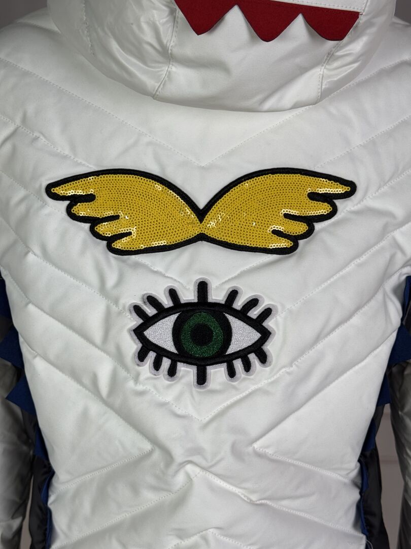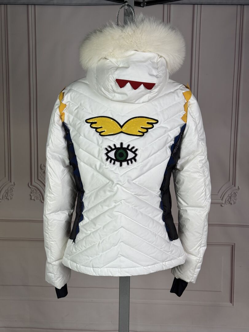 ROSSIGNOL - Doudoune en tissu matelassé blanc, effets de découpe bleu et jaune, motifs œil et ailes dans le dos, capuche et fausse fourrure amovible. Taille L Etat magasin