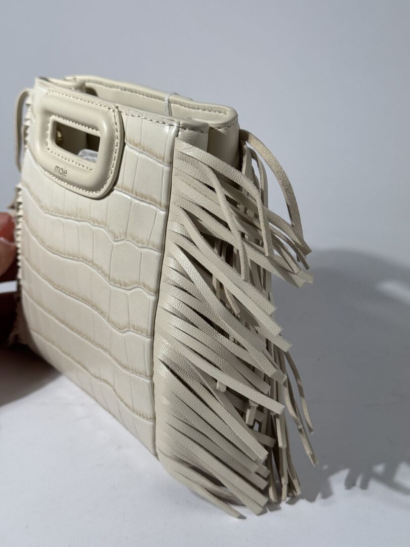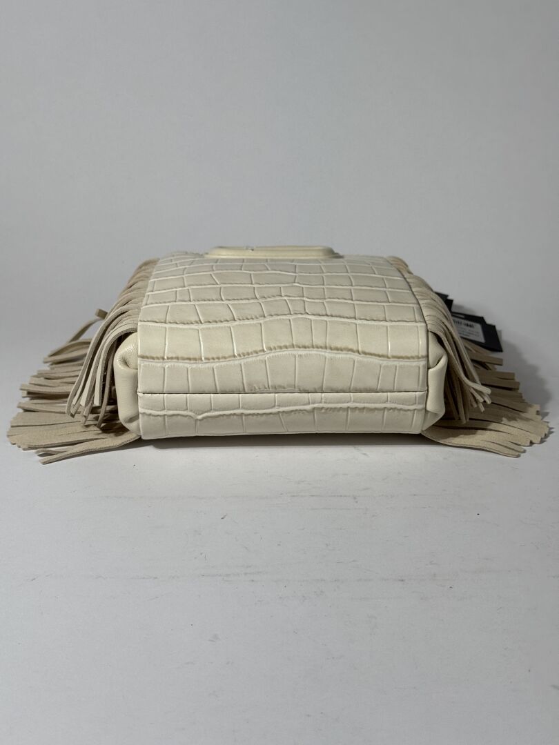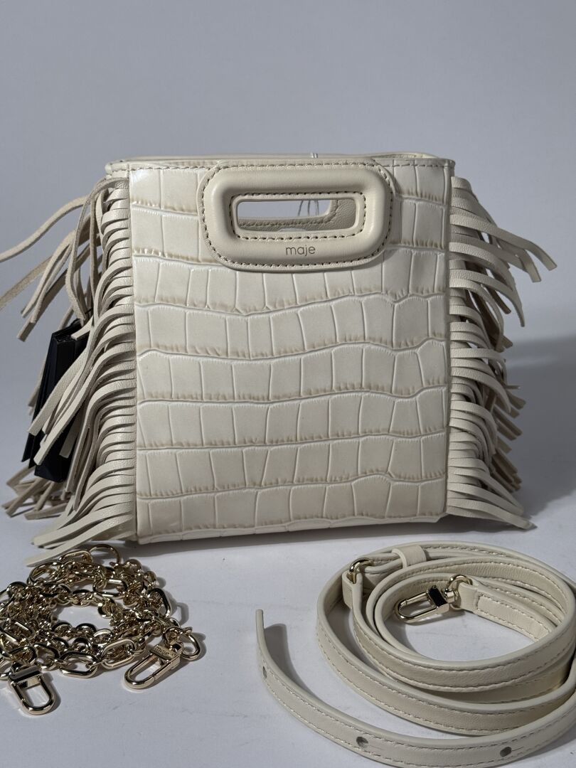 MAJE - Sac "M Mini", cuir façon crocodile écru, franges, anse bandoulière. Long. : 14 cm Etat magasin